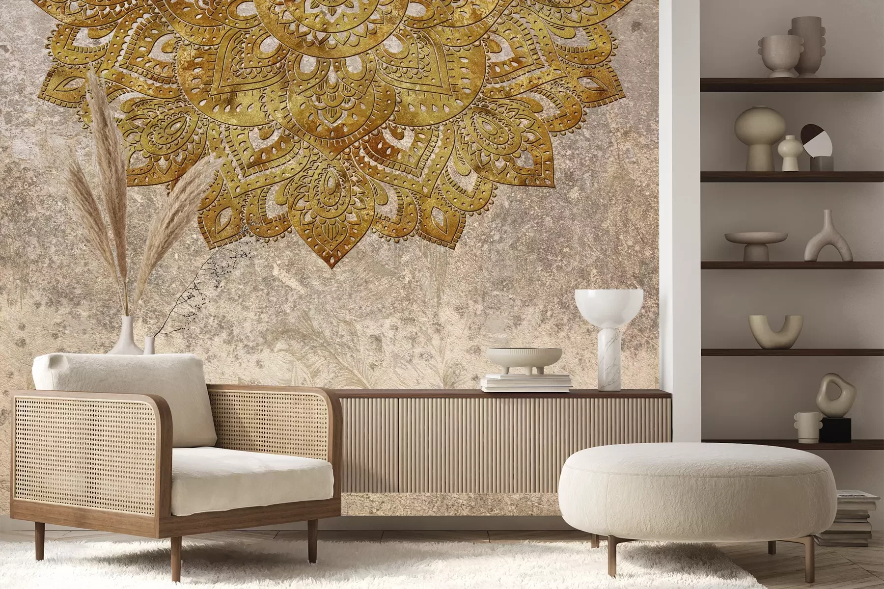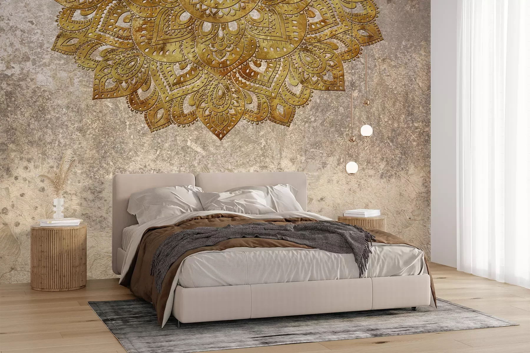 Het materiaal Premium+ is een gestructureerd vinyl op vlies met een gewicht van 255 g/m², dat kleine oneffenheden in de muur effectief camoufleert. De subtiele structuur van fijn zand geeft het oppervlak een exclusieve uitstraling, terwijl de halfmatte afwerking de diepte van de kleuren benadrukt. Het materiaal is dampdoorlatend, waardoor het ook in de keuken en badkamer kan worden gebruikt. De maximale breedte van één baan bedraagt 100 cm – bij grotere afmetingen wordt het fotobehang in meerdere gelijke banen verdeeld. De lijm wordt direct op de muur aangebracht en het behang wordt rand-aan-rand geplakt, wat zorgt voor een esthetisch resultaat zonder zichtbare naden. Het oppervlak kan gemakkelijk worden schoongemaakt door het voorzichtig af te nemen met een vochtige doek.