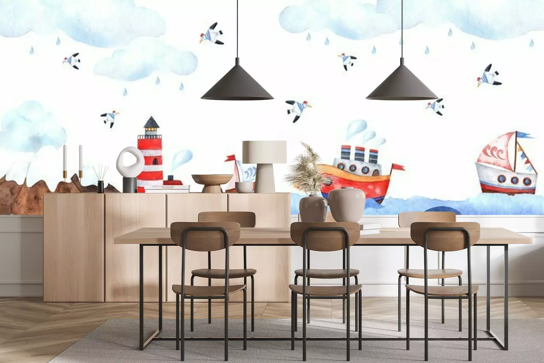 Fotobehang Marine composition of watercolor elements with a lighthouse, seagulls, sea, whale, ships, seagulls, stars, clouds and waves. Great for decorating holidays, postcards, textiles, children’s stickers and