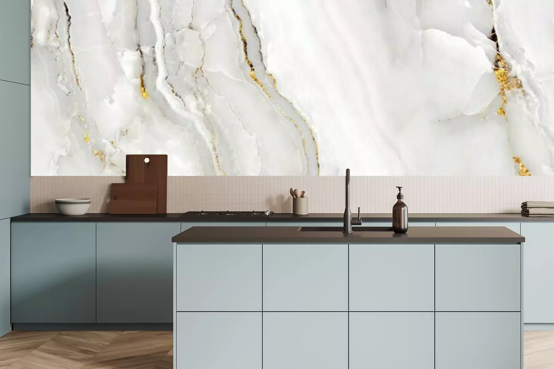 Het materiaal Premium is een glad vinyl op vlies, dat bestand is tegen uitrekken en vervorming. Het is dampdoorlatend – de muren kunnen vrij ademen – waardoor het geschikt is voor gebruik in de keuken en badkamer. Bij vervuiling kan het materiaal worden afgenomen met een vochtige doek. De maximale breedte van één baan bedraagt 95 of 105 cm, afhankelijk van de beschikbaarheid. Montage vindt plaats met de rand-aan-rand methode, wat een esthetisch resultaat zonder zichtbare naden oplevert. Omdat de lijm rechtstreeks op de muur wordt aangebracht, verloopt de installatie van het fotobehang snel en eenvoudig.