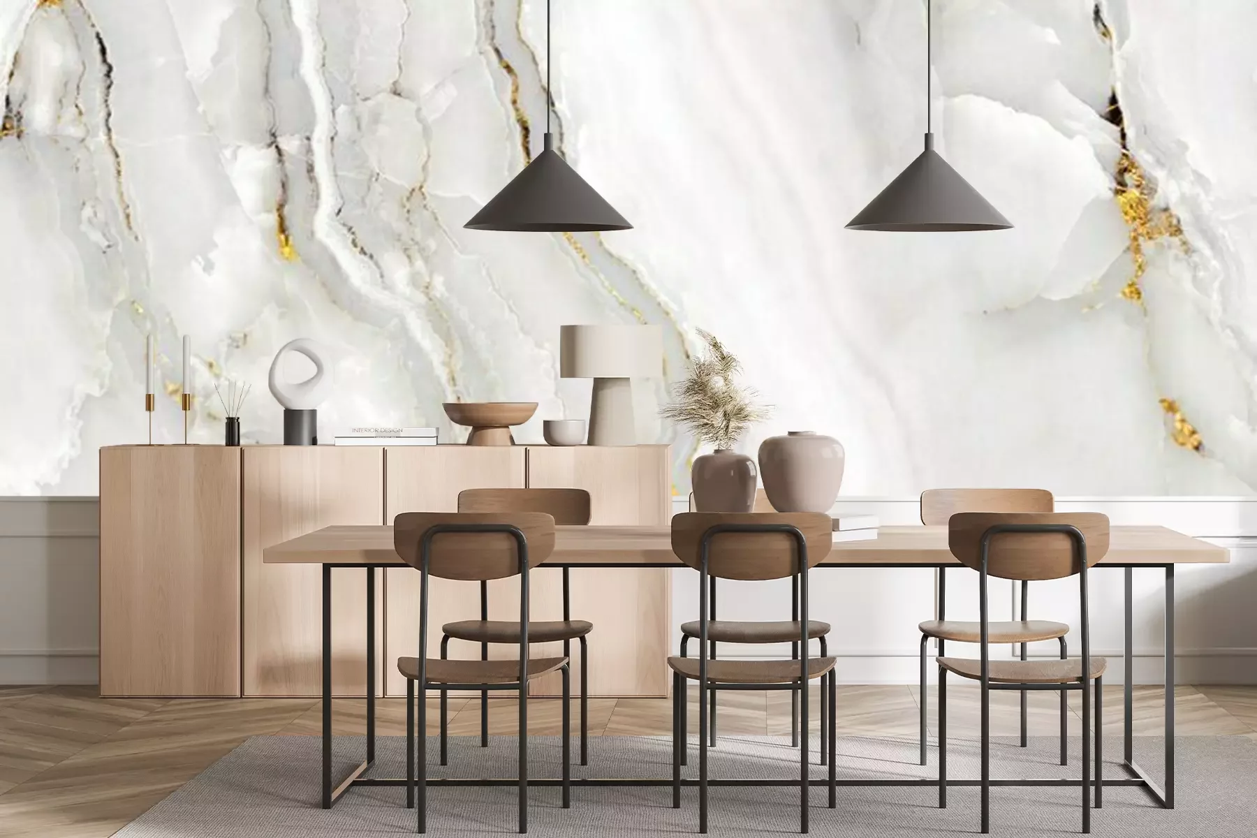 Het materiaal Premium+ is een gestructureerd vinyl op vlies met een gewicht van 255 g/m², dat kleine oneffenheden in de muur effectief camoufleert. De subtiele structuur van fijn zand geeft het oppervlak een exclusieve uitstraling, terwijl de halfmatte afwerking de diepte van de kleuren benadrukt. Het materiaal is dampdoorlatend, waardoor het ook in de keuken en badkamer kan worden gebruikt. De maximale breedte van één baan bedraagt 100 cm – bij grotere afmetingen wordt het fotobehang in meerdere gelijke banen verdeeld. De lijm wordt direct op de muur aangebracht en het behang wordt rand-aan-rand geplakt, wat zorgt voor een esthetisch resultaat zonder zichtbare naden. Het oppervlak kan gemakkelijk worden schoongemaakt door het voorzichtig af te nemen met een vochtige doek.