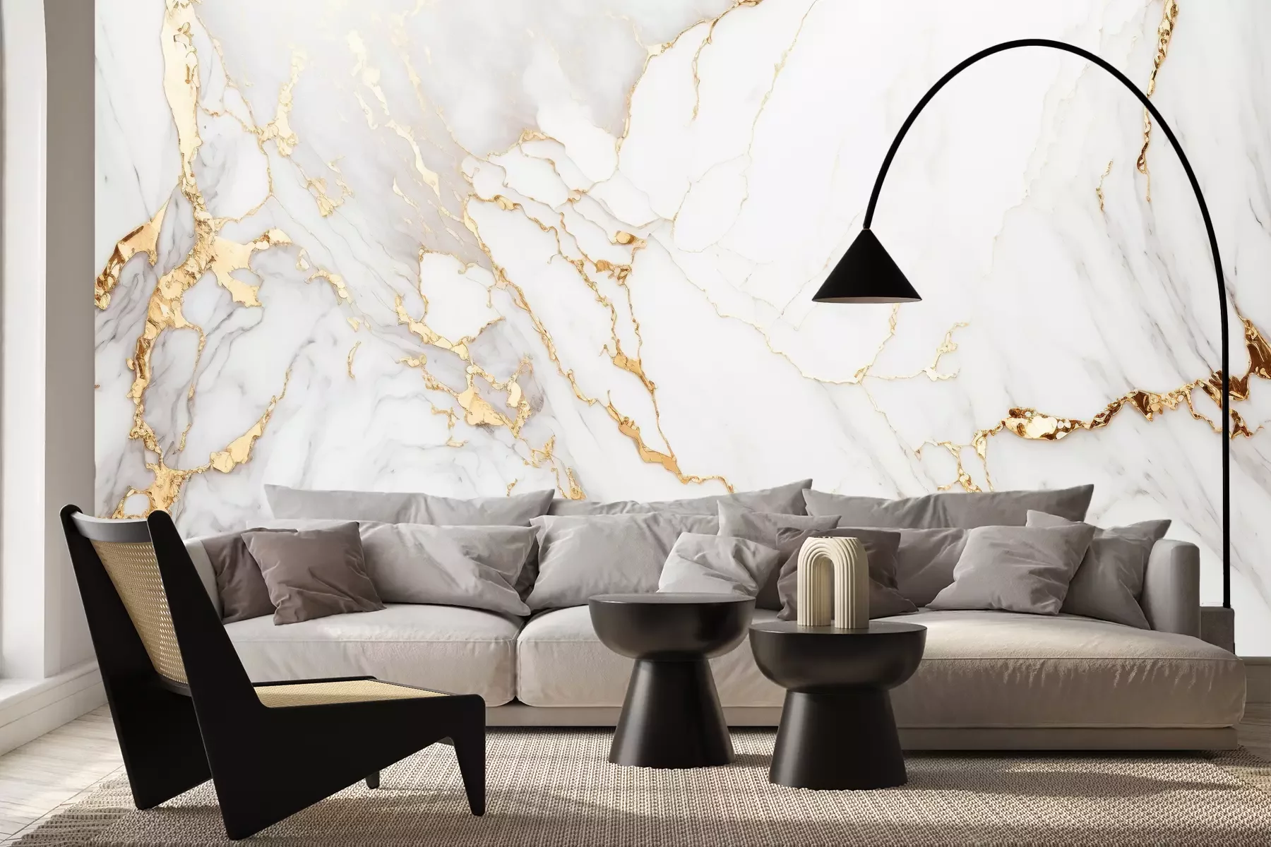 Het materiaal Premium+ is een gestructureerd vinyl op vlies met een gewicht van 255 g/m², dat kleine oneffenheden in de muur effectief camoufleert. De subtiele structuur van fijn zand geeft het oppervlak een exclusieve uitstraling, terwijl de halfmatte afwerking de diepte van de kleuren benadrukt. Het materiaal is dampdoorlatend, waardoor het ook in de keuken en badkamer kan worden gebruikt. De maximale breedte van één baan bedraagt 100 cm – bij grotere afmetingen wordt het fotobehang in meerdere gelijke banen verdeeld. De lijm wordt direct op de muur aangebracht en het behang wordt rand-aan-rand geplakt, wat zorgt voor een esthetisch resultaat zonder zichtbare naden. Het oppervlak kan gemakkelijk worden schoongemaakt door het voorzichtig af te nemen met een vochtige doek.