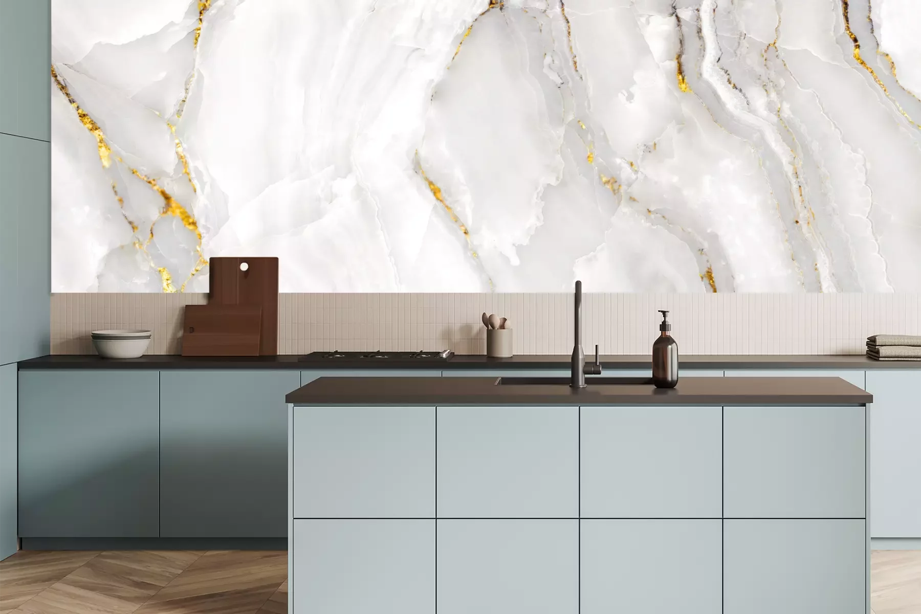 Het materiaal Premium is een glad vinyl op vlies, dat bestand is tegen uitrekken en vervorming. Het is dampdoorlatend – de muren kunnen vrij ademen – waardoor het geschikt is voor gebruik in de keuken en badkamer. Bij vervuiling kan het materiaal worden afgenomen met een vochtige doek. De maximale breedte van één baan bedraagt 95 of 105 cm, afhankelijk van de beschikbaarheid. Montage vindt plaats met de rand-aan-rand methode, wat een esthetisch resultaat zonder zichtbare naden oplevert. Omdat de lijm rechtstreeks op de muur wordt aangebracht, verloopt de installatie van het fotobehang snel en eenvoudig.