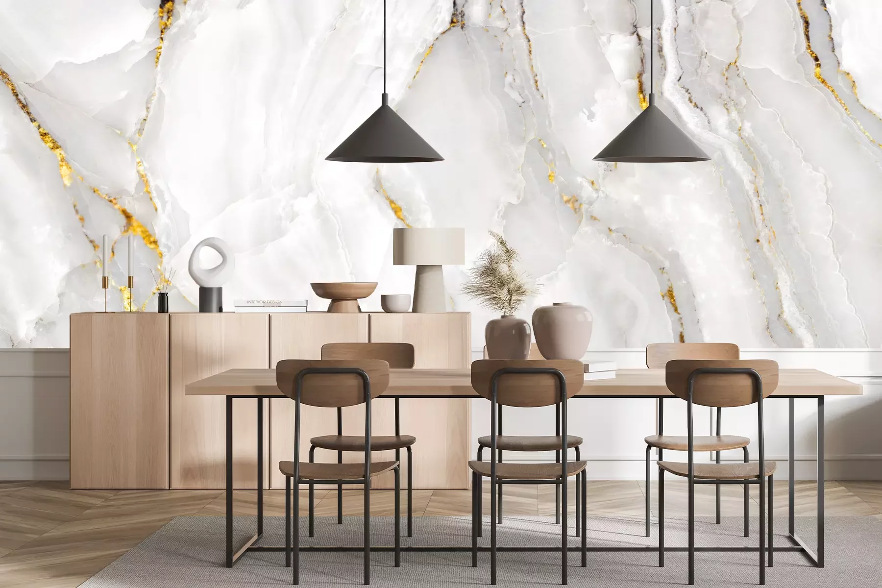 Het materiaal Premium+ is een gestructureerd vinyl op vlies met een gewicht van 255 g/m², dat kleine oneffenheden in de muur effectief camoufleert. De subtiele structuur van fijn zand geeft het oppervlak een exclusieve uitstraling, terwijl de halfmatte afwerking de diepte van de kleuren benadrukt. Het materiaal is dampdoorlatend, waardoor het ook in de keuken en badkamer kan worden gebruikt. De maximale breedte van één baan bedraagt 100 cm – bij grotere afmetingen wordt het fotobehang in meerdere gelijke banen verdeeld. De lijm wordt direct op de muur aangebracht en het behang wordt rand-aan-rand geplakt, wat zorgt voor een esthetisch resultaat zonder zichtbare naden. Het oppervlak kan gemakkelijk worden schoongemaakt door het voorzichtig af te nemen met een vochtige doek.