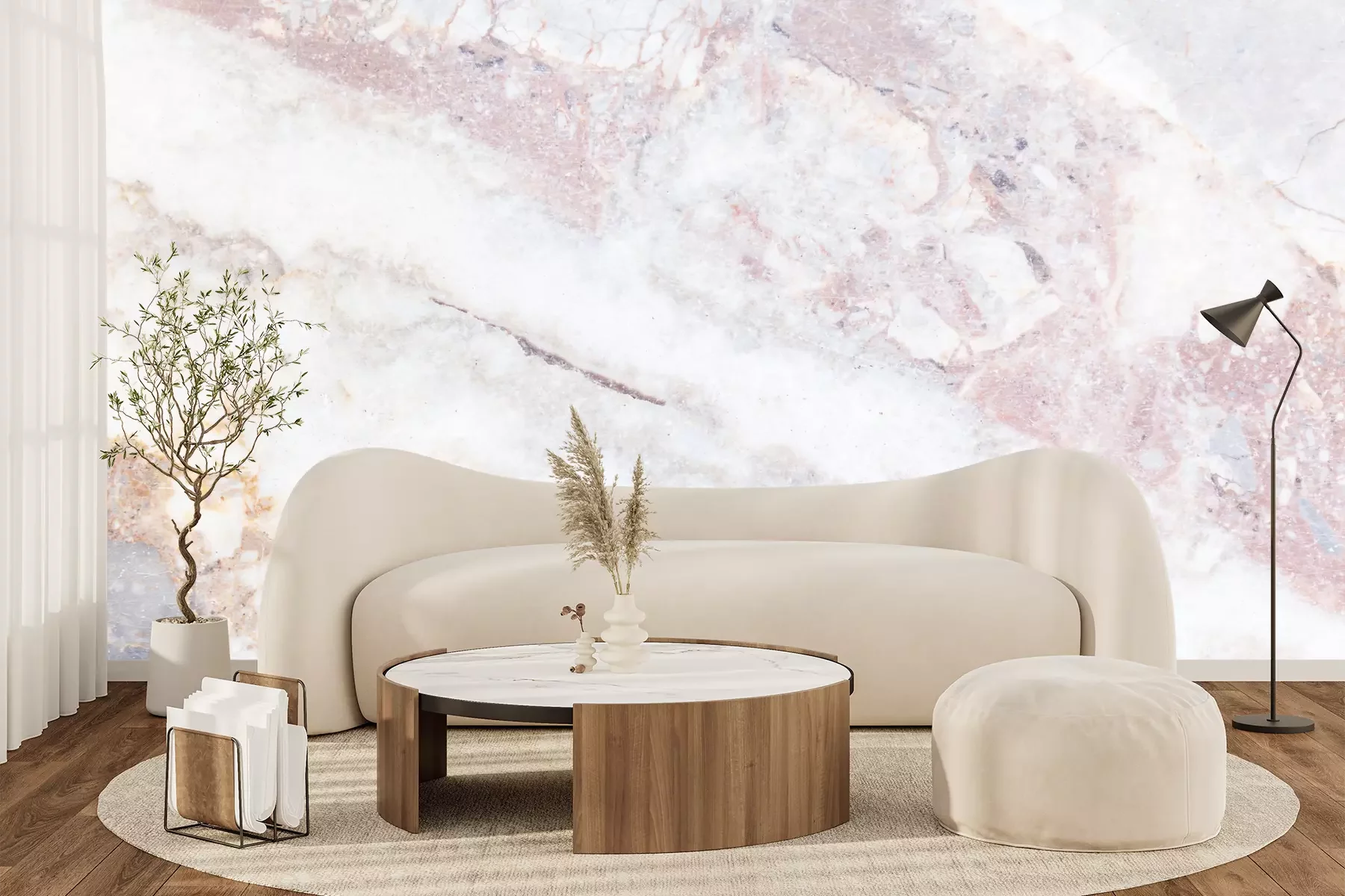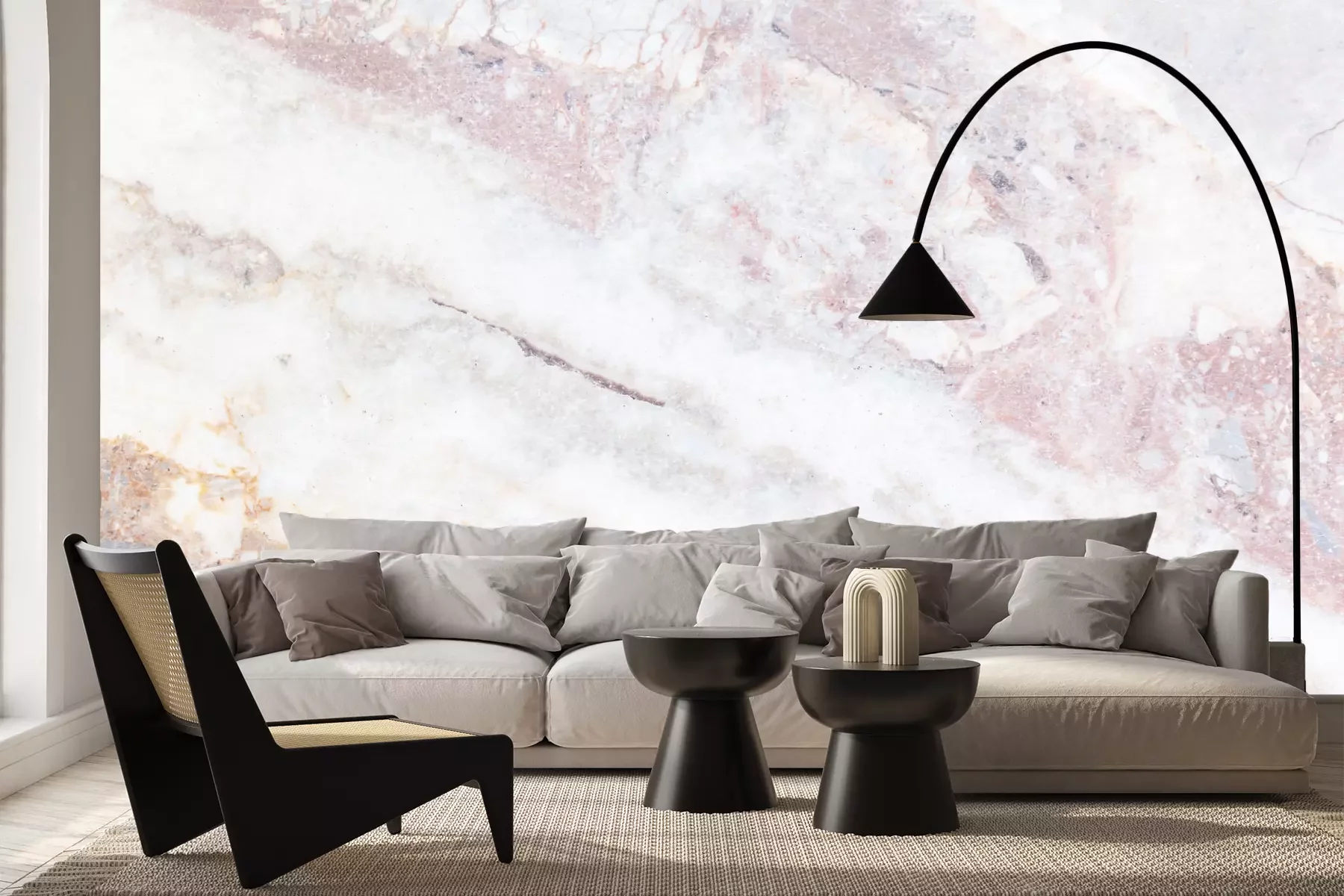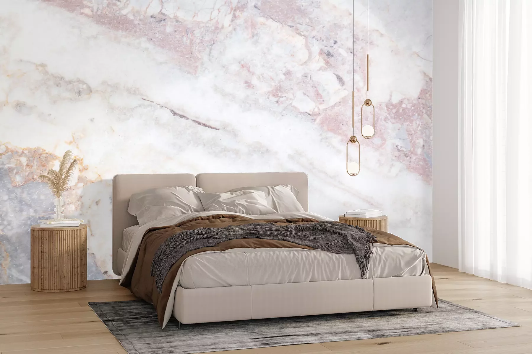Het materiaal Premium+ is een gestructureerd vinyl op vlies met een gewicht van 255 g/m², dat kleine oneffenheden in de muur effectief camoufleert. De subtiele structuur van fijn zand geeft het oppervlak een exclusieve uitstraling, terwijl de halfmatte afwerking de diepte van de kleuren benadrukt. Het materiaal is dampdoorlatend, waardoor het ook in de keuken en badkamer kan worden gebruikt. De maximale breedte van één baan bedraagt 100 cm – bij grotere afmetingen wordt het fotobehang in meerdere gelijke banen verdeeld. De lijm wordt direct op de muur aangebracht en het behang wordt rand-aan-rand geplakt, wat zorgt voor een esthetisch resultaat zonder zichtbare naden. Het oppervlak kan gemakkelijk worden schoongemaakt door het voorzichtig af te nemen met een vochtige doek.