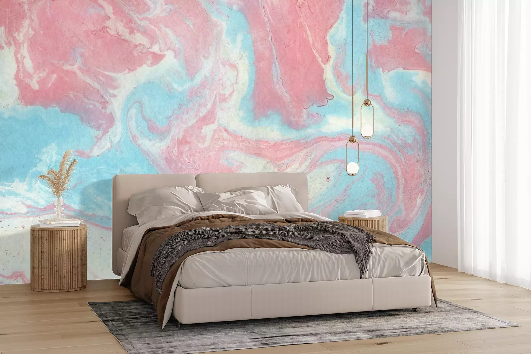 Het materiaal Premium+ is een gestructureerd vinyl op vlies met een gewicht van 255 g/m², dat kleine oneffenheden in de muur effectief camoufleert. De subtiele structuur van fijn zand geeft het oppervlak een exclusieve uitstraling, terwijl de halfmatte afwerking de diepte van de kleuren benadrukt. Het materiaal is dampdoorlatend, waardoor het ook in de keuken en badkamer kan worden gebruikt. De maximale breedte van één baan bedraagt 100 cm – bij grotere afmetingen wordt het fotobehang in meerdere gelijke banen verdeeld. De lijm wordt direct op de muur aangebracht en het behang wordt rand-aan-rand geplakt, wat zorgt voor een esthetisch resultaat zonder zichtbare naden. Het oppervlak kan gemakkelijk worden schoongemaakt door het voorzichtig af te nemen met een vochtige doek.