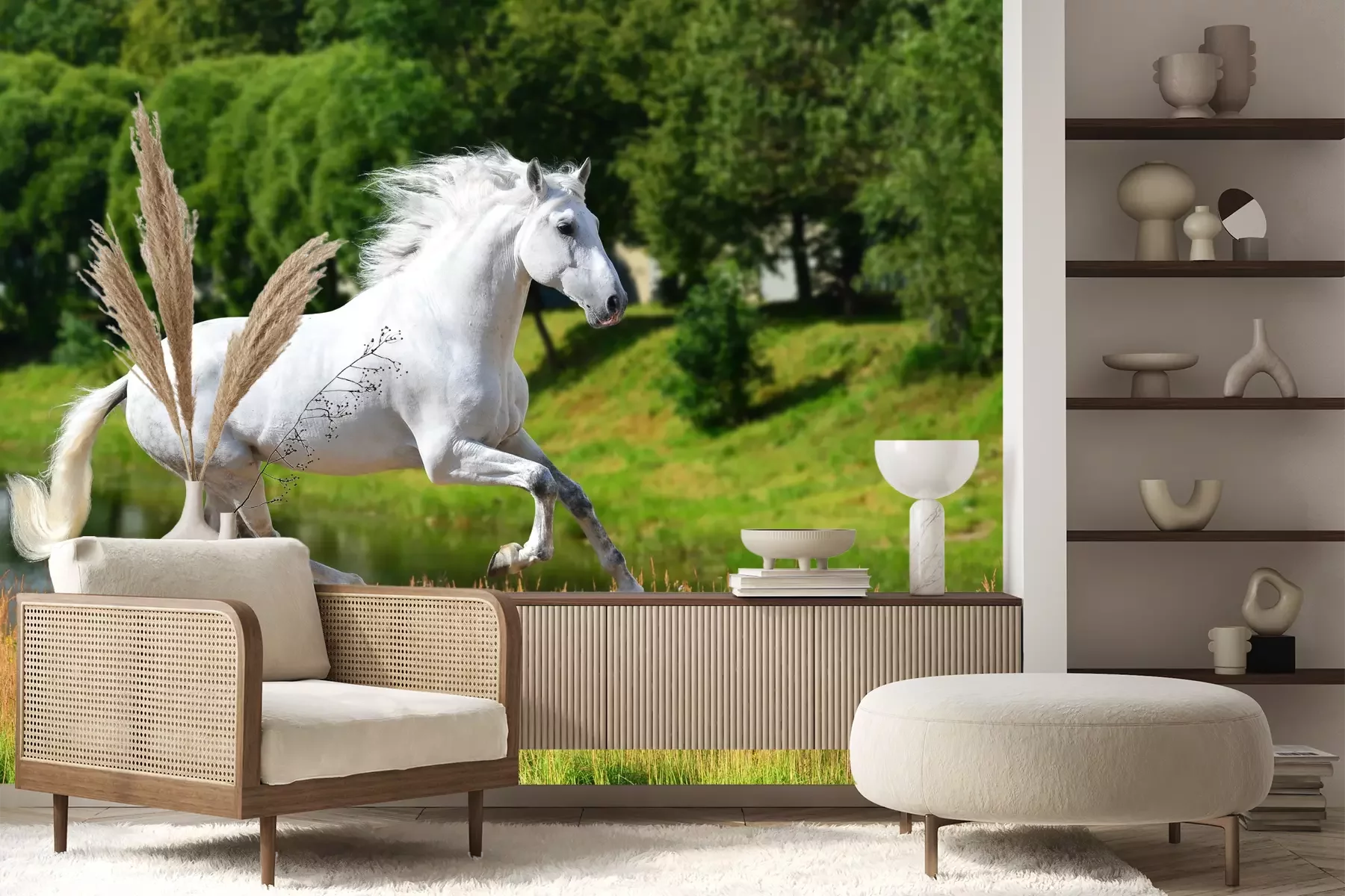 Het materiaal Premium+ is een gestructureerd vinyl op vlies met een gewicht van 255 g/m², dat kleine oneffenheden in de muur effectief camoufleert. De subtiele structuur van fijn zand geeft het oppervlak een exclusieve uitstraling, terwijl de halfmatte afwerking de diepte van de kleuren benadrukt. Het materiaal is dampdoorlatend, waardoor het ook in de keuken en badkamer kan worden gebruikt. De maximale breedte van één baan bedraagt 100 cm – bij grotere afmetingen wordt het fotobehang in meerdere gelijke banen verdeeld. De lijm wordt direct op de muur aangebracht en het behang wordt rand-aan-rand geplakt, wat zorgt voor een esthetisch resultaat zonder zichtbare naden. Het oppervlak kan gemakkelijk worden schoongemaakt door het voorzichtig af te nemen met een vochtige doek.