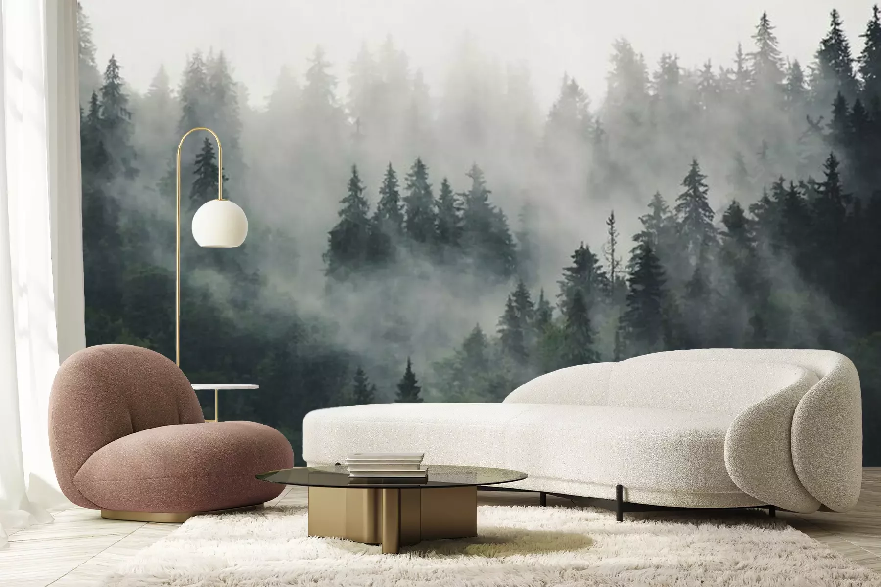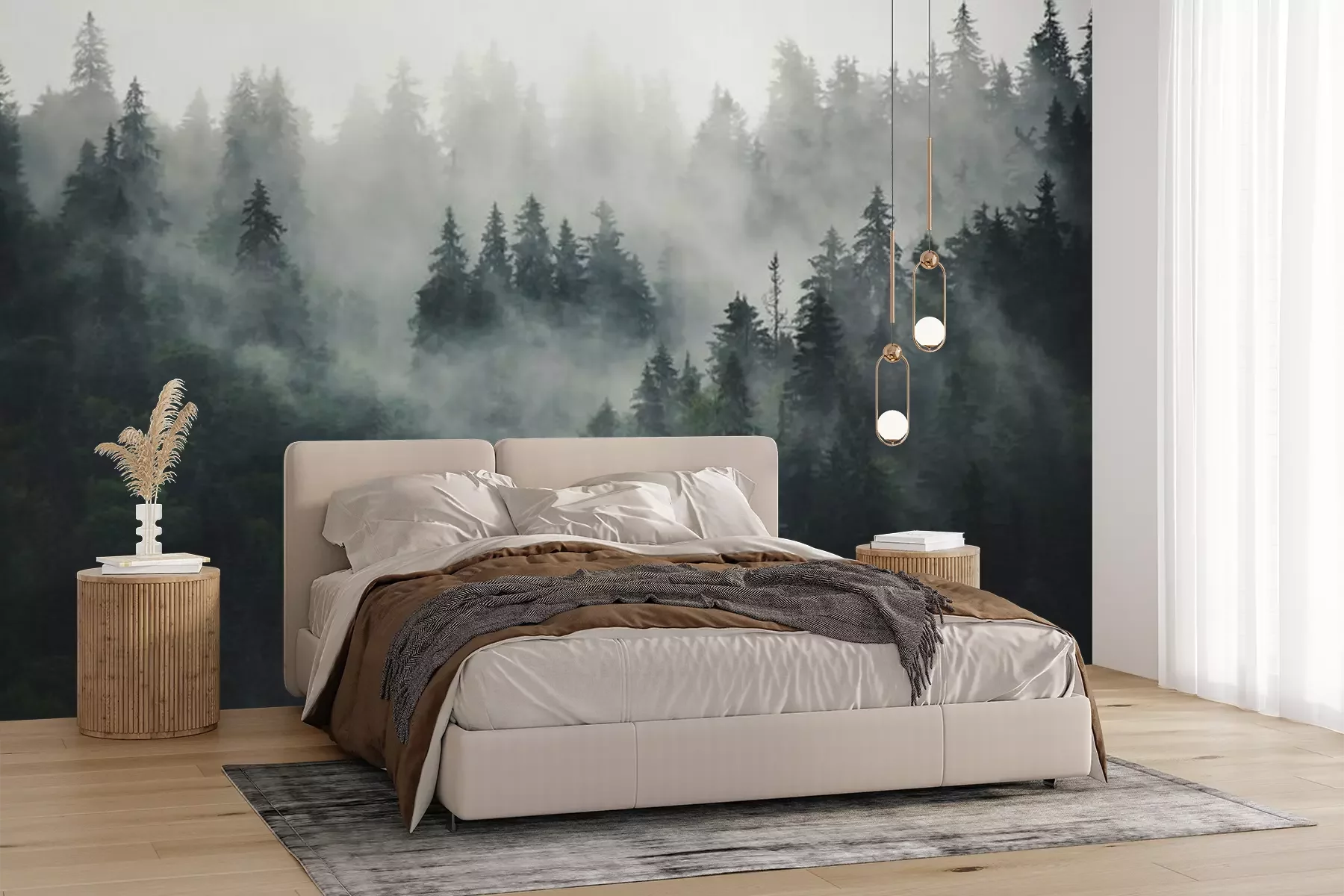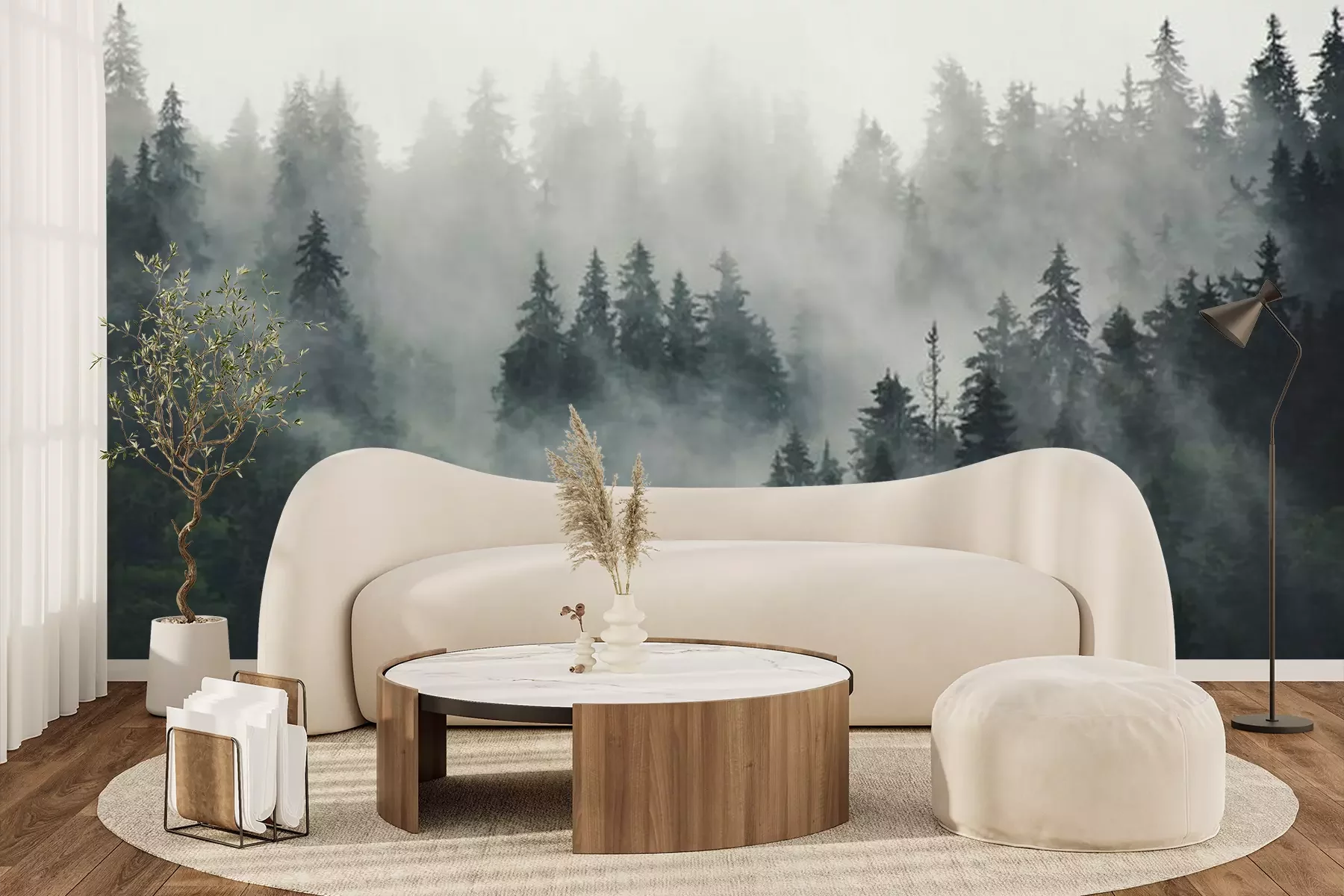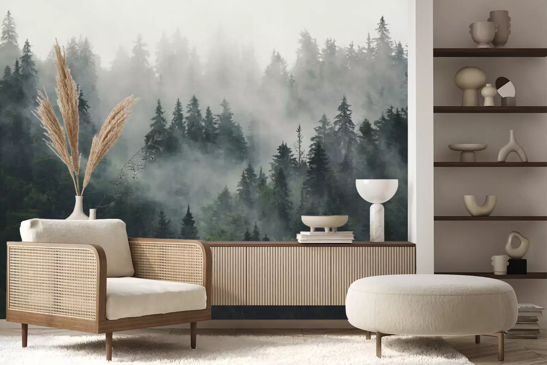 Naaldbomen in de mist, bos in de mistFotobehang