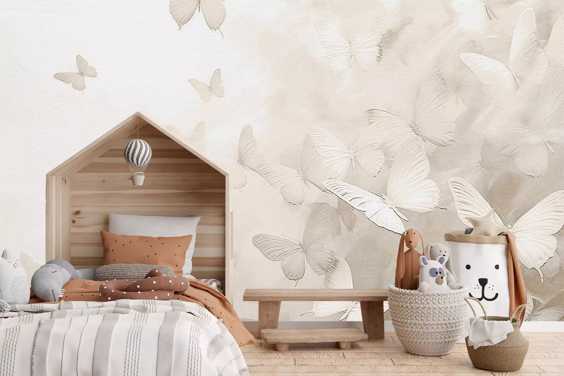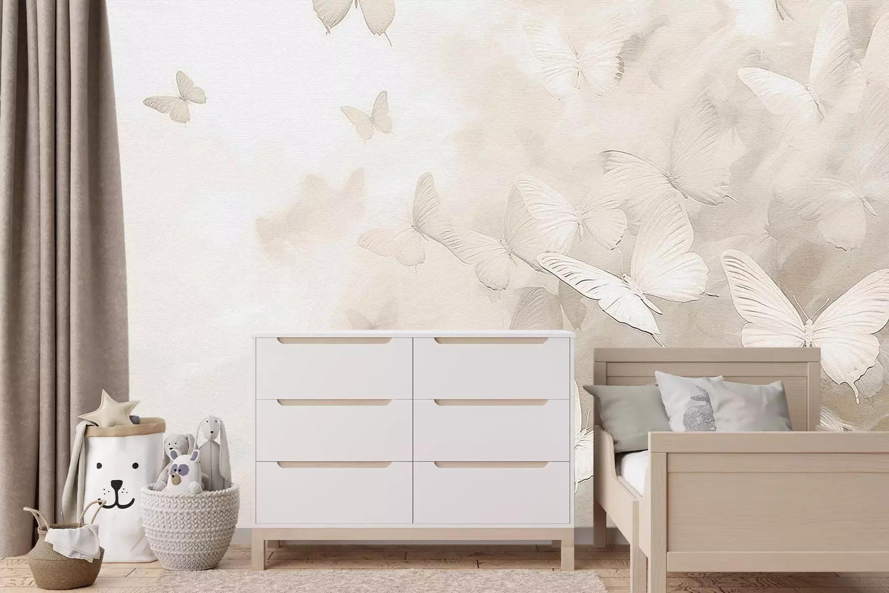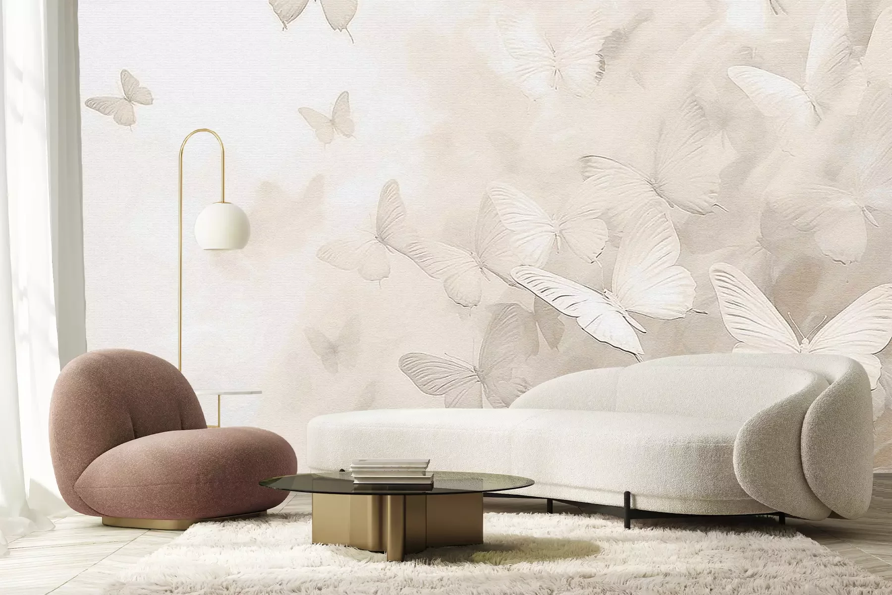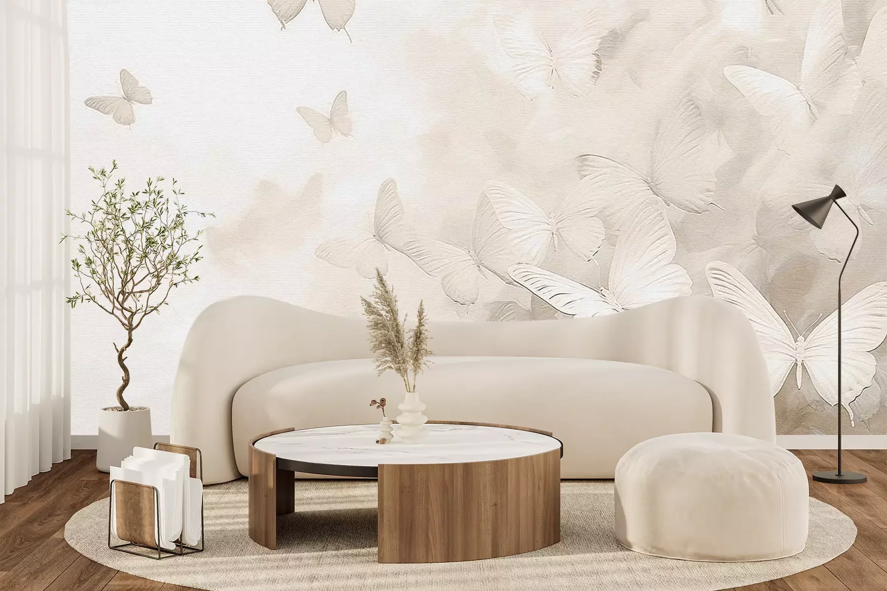 Minimalistisch patroon van witte en beige vlinders in monochrome stijl