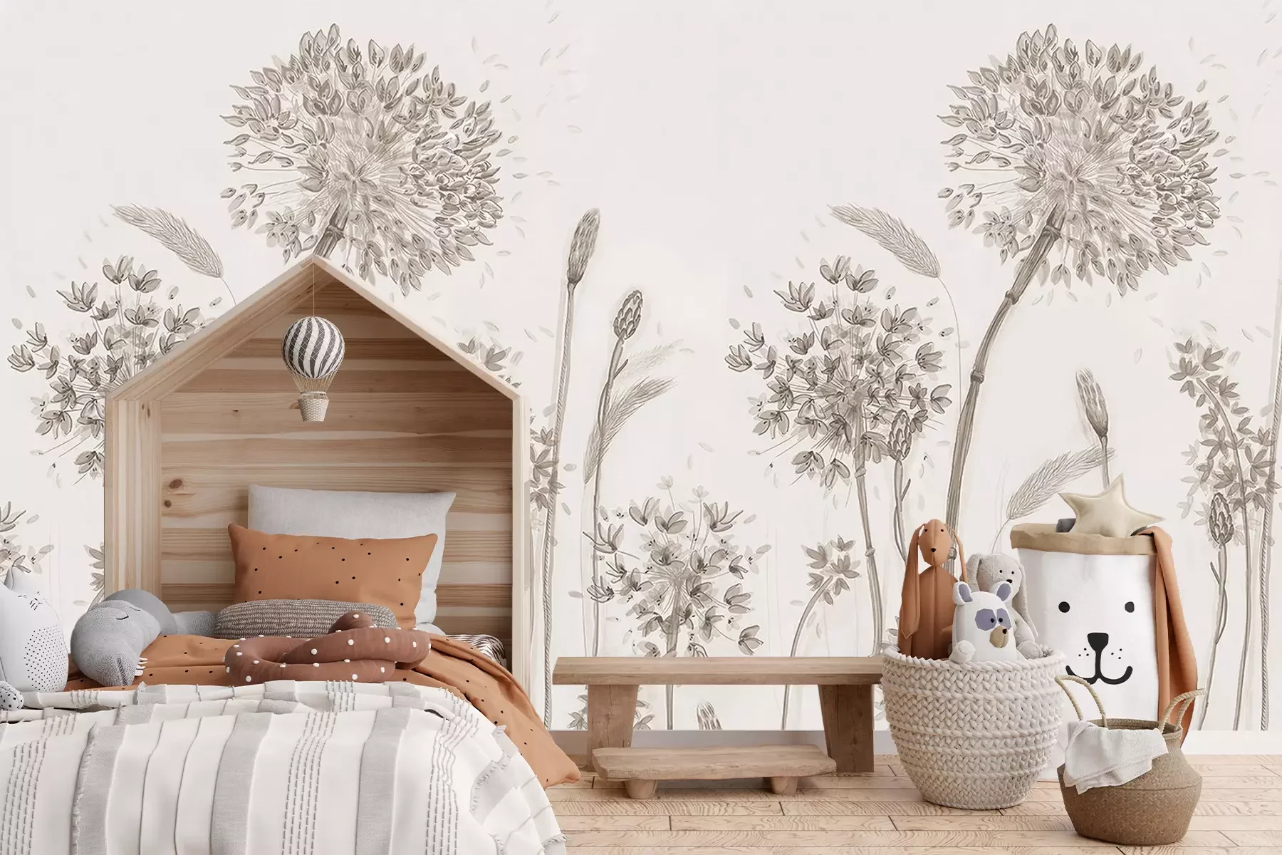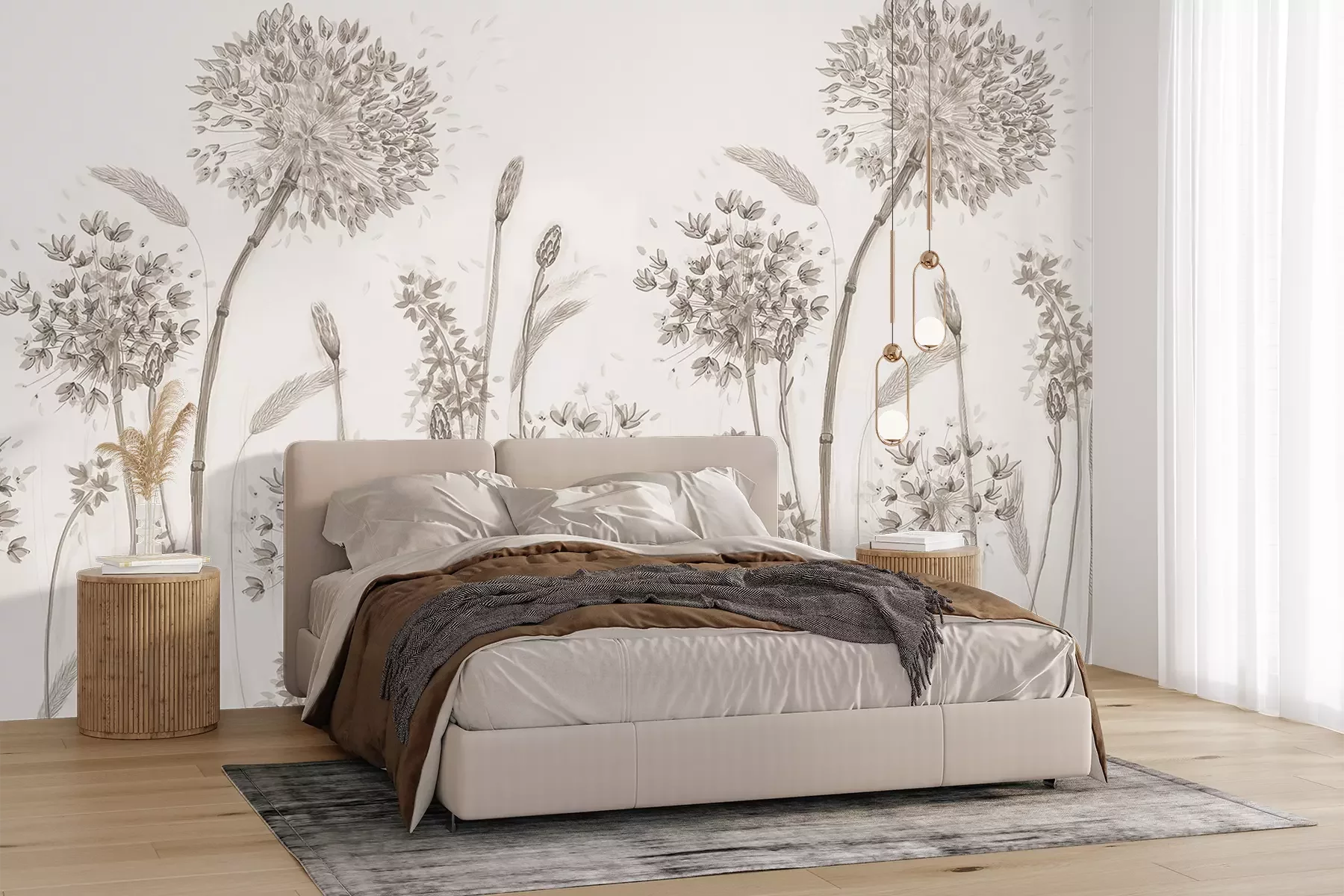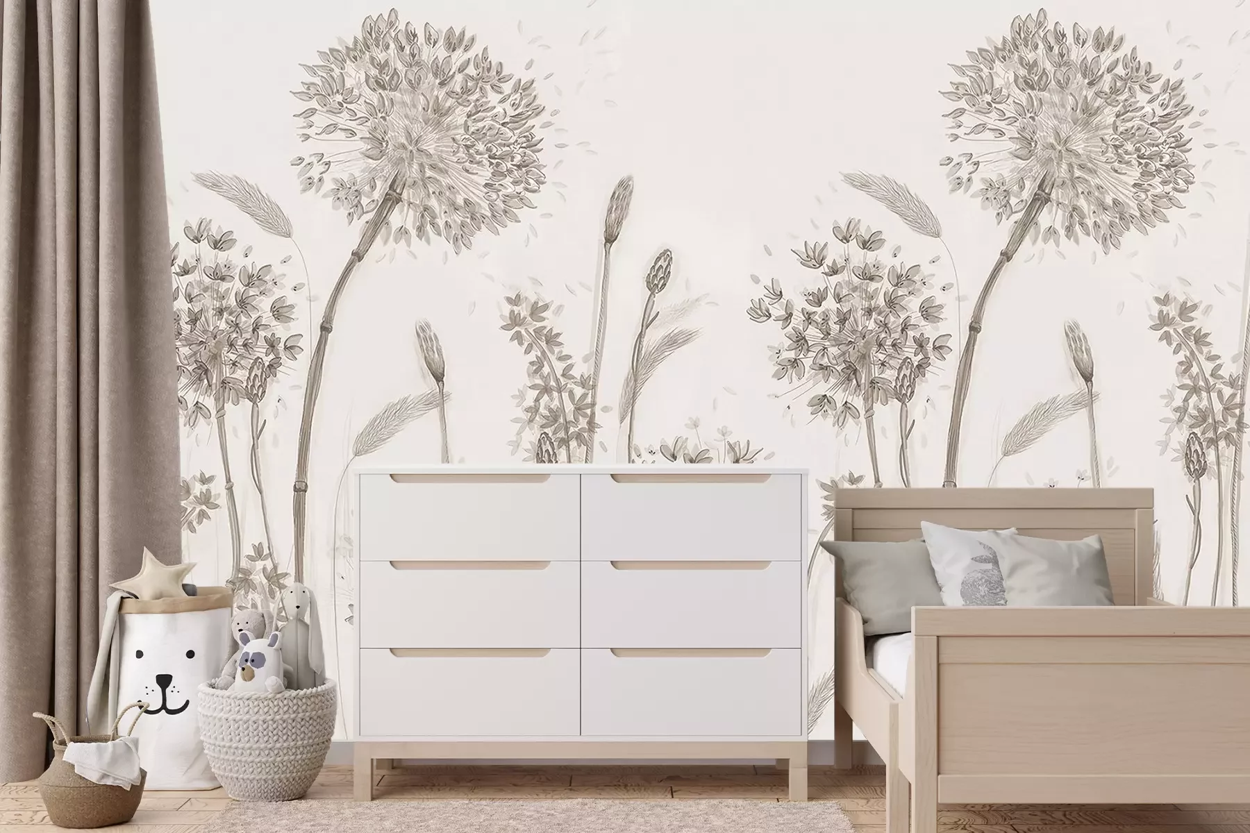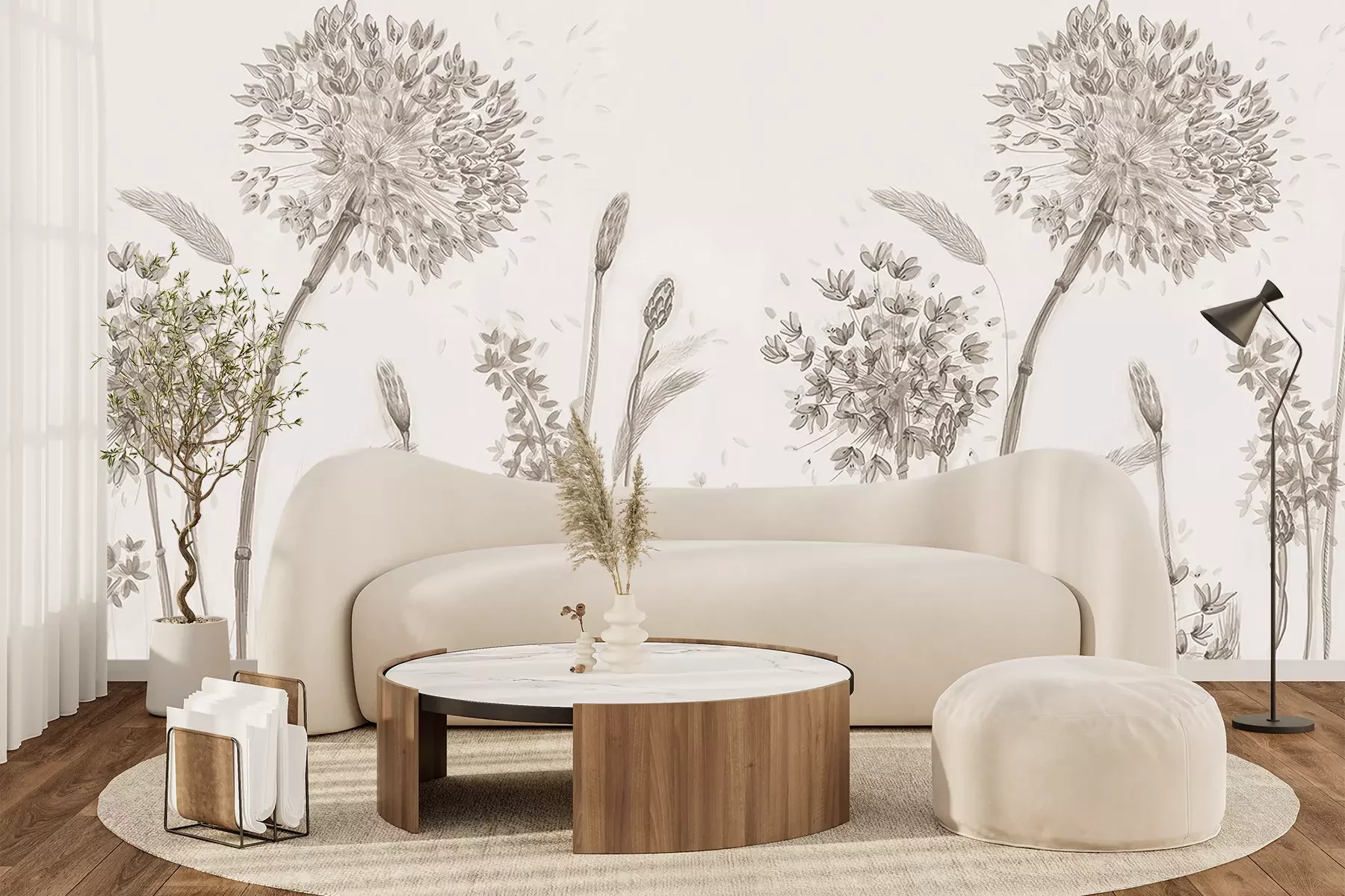 Minimalistische afbeeldingen van paardenbloemen en wilde planten in beige kleuren