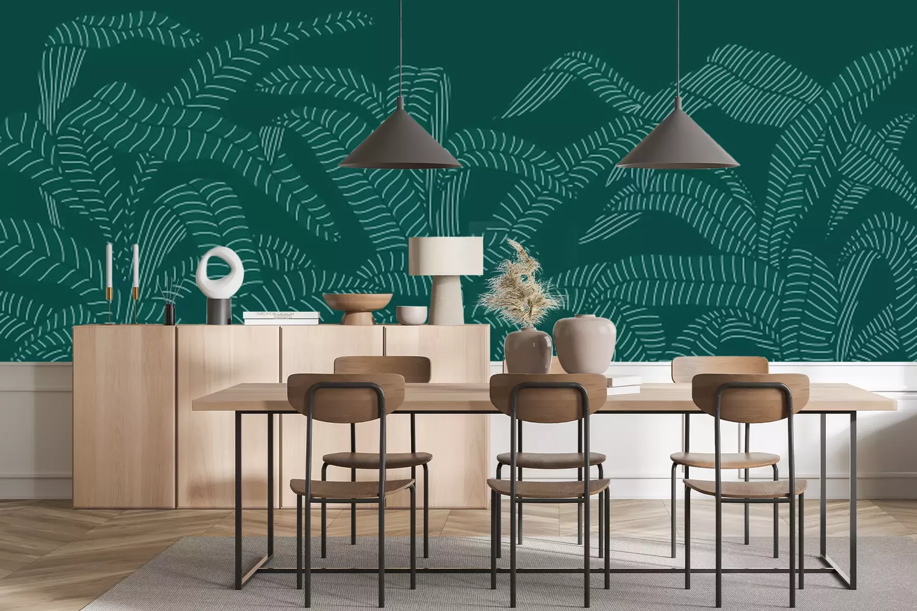 Fotobehang Minimalistische schets van bladeren op een donkergroene achtergrond