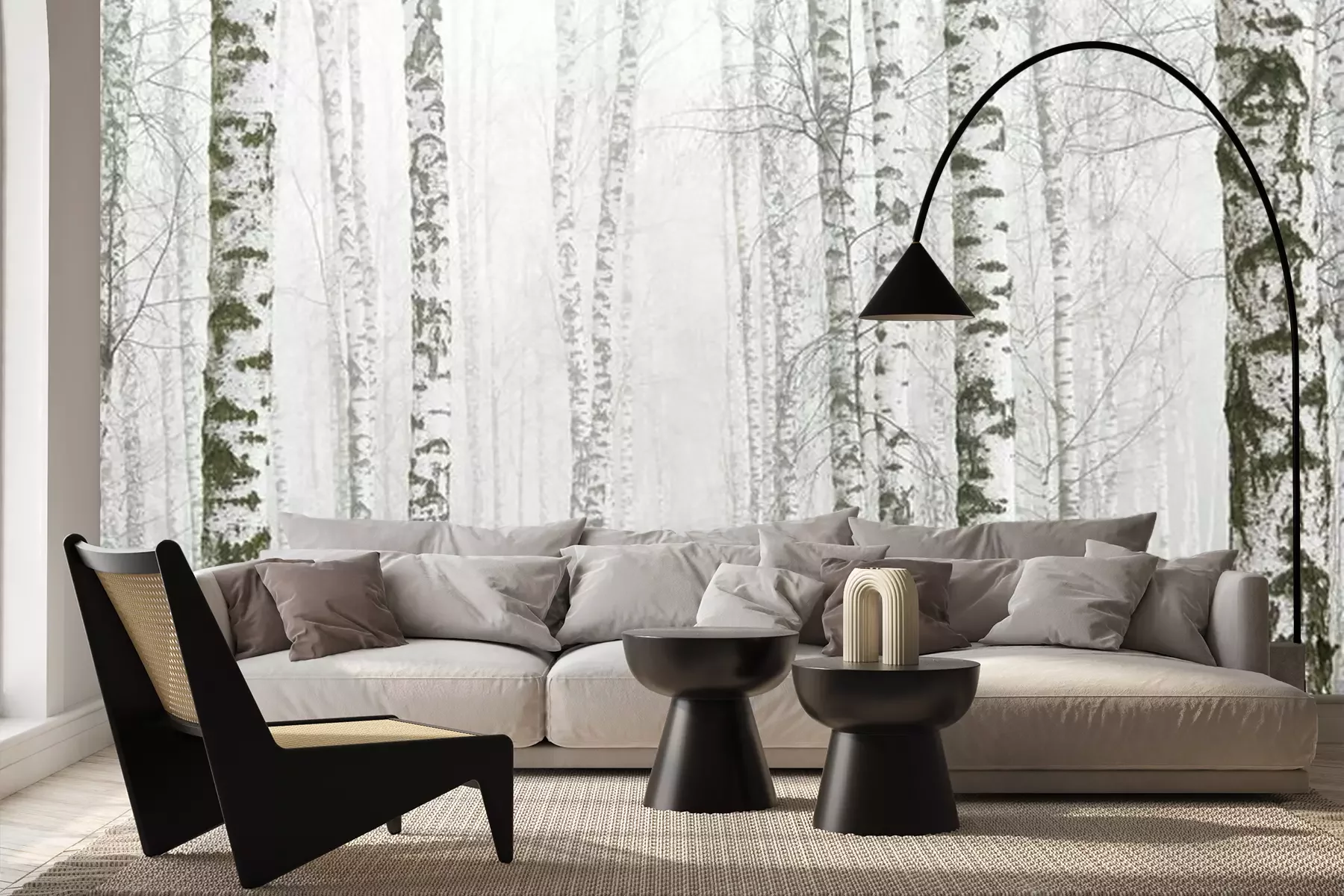 Zwart-witte berkenbomen in het bosFotobehang