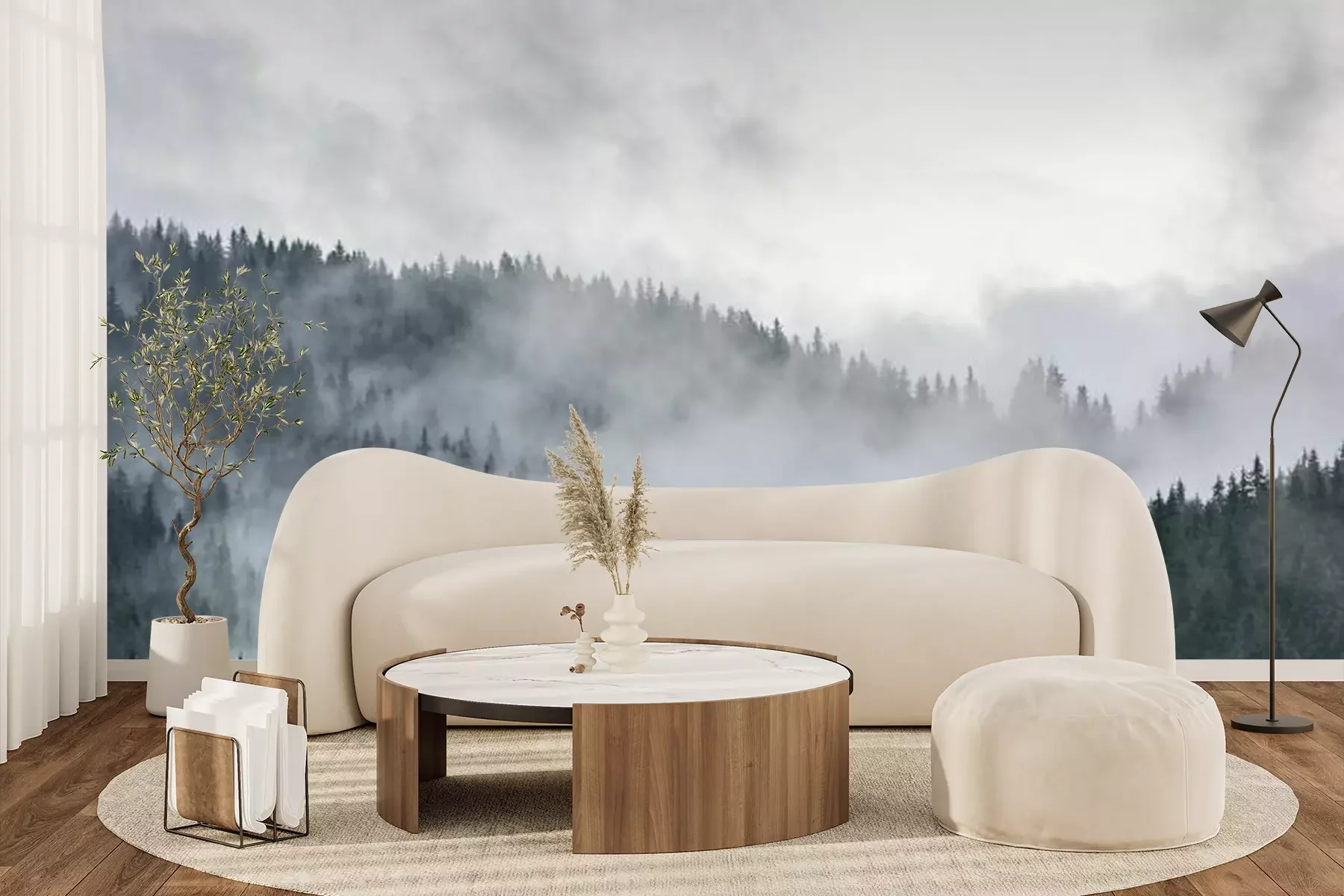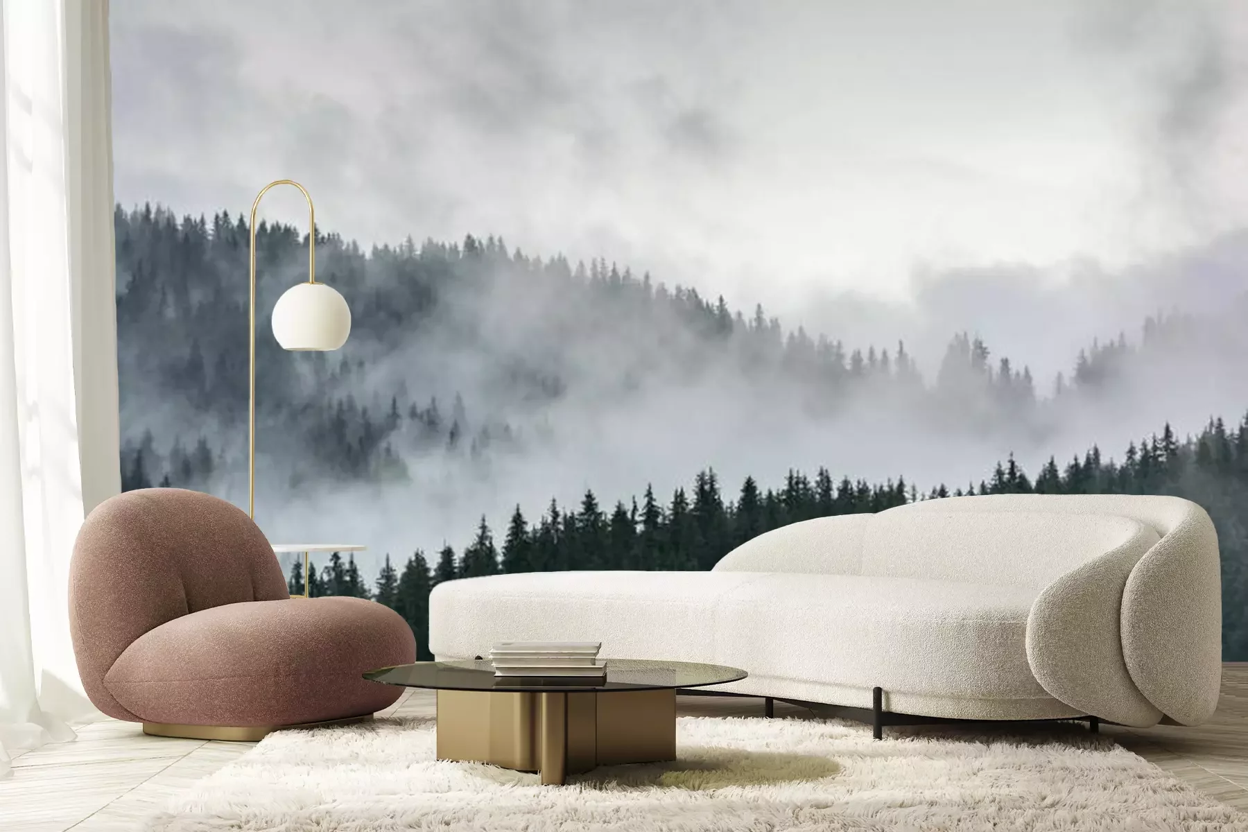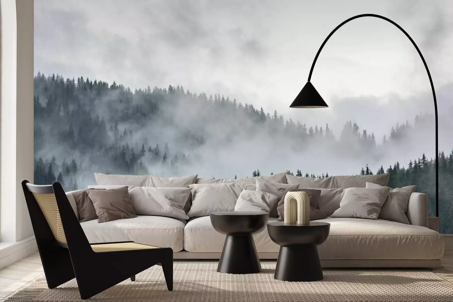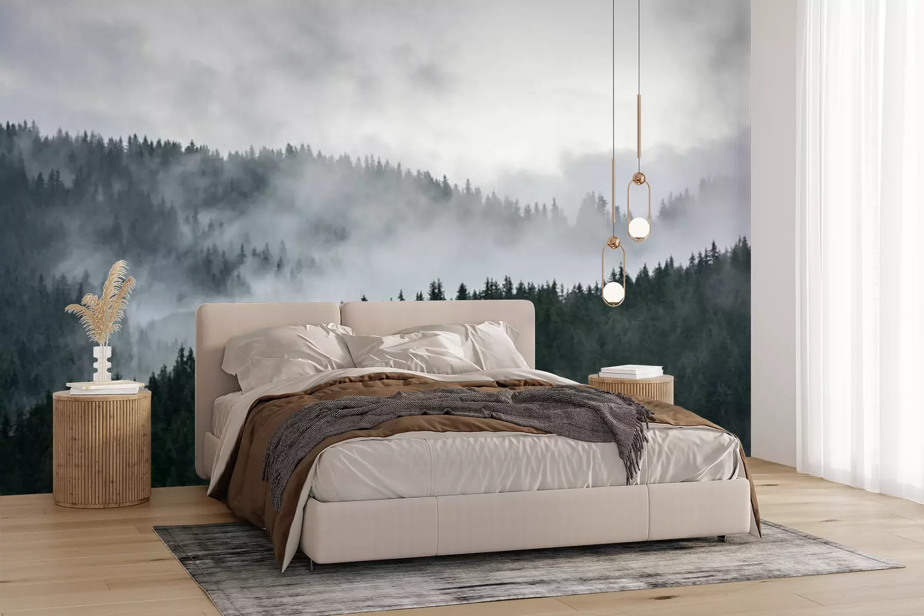 Fotobehang Mistig dennenboslandschap natuurbomen