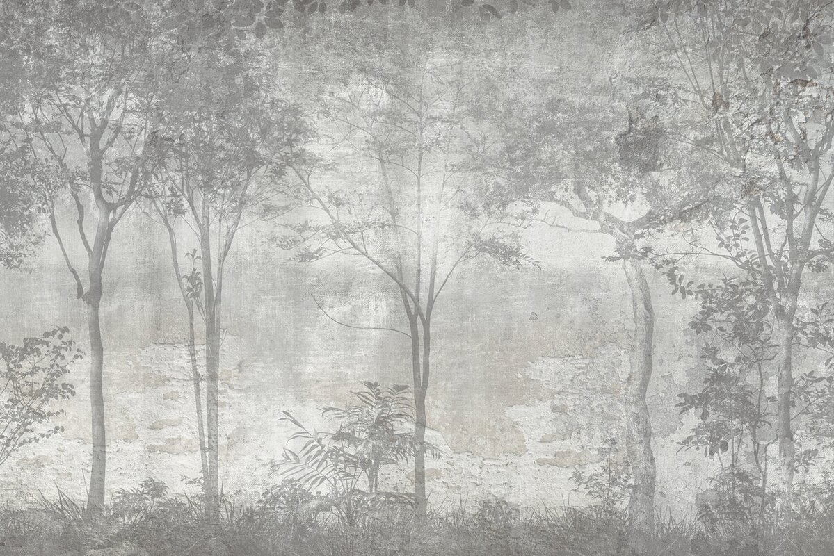 Fotobehang: Misty forest, grey trees, nature landscape on a concrete background