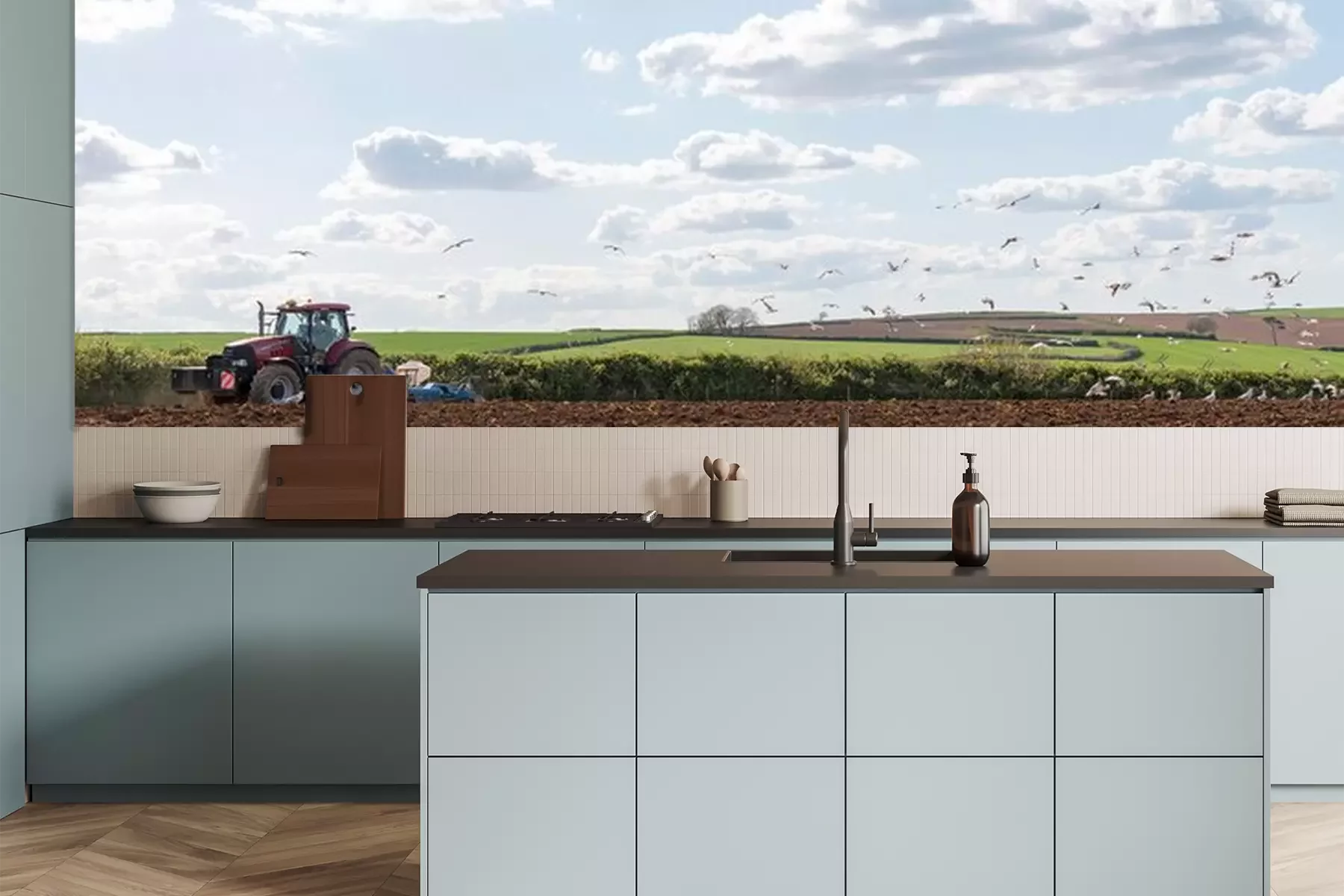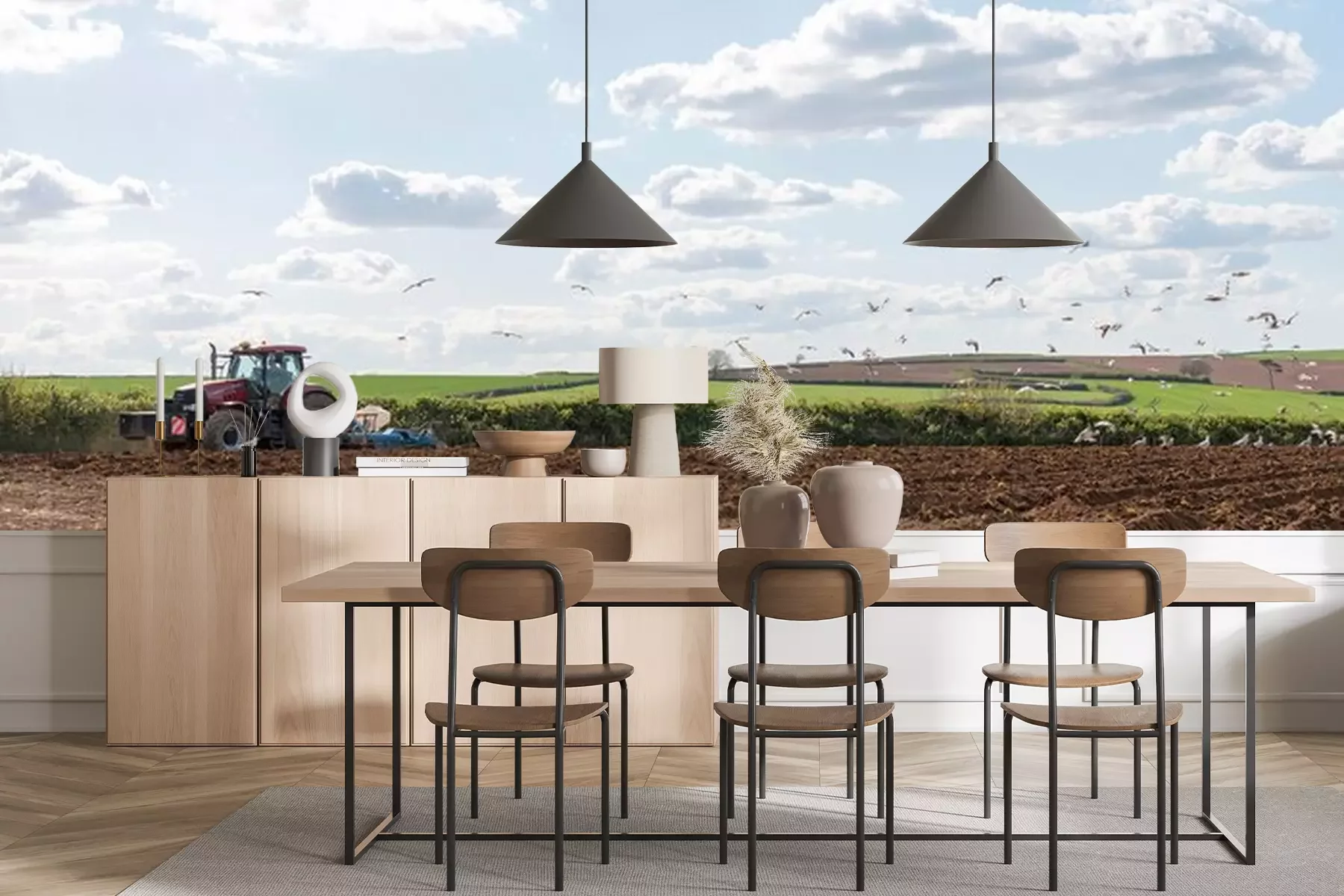 Fotobehang Modbury, South Devon, England, UK. May 2019. A tractor ploughing deep furrows preparing a field for planting potatoes near Modbury, Devon, The background high ground is Dartmoor National Park.