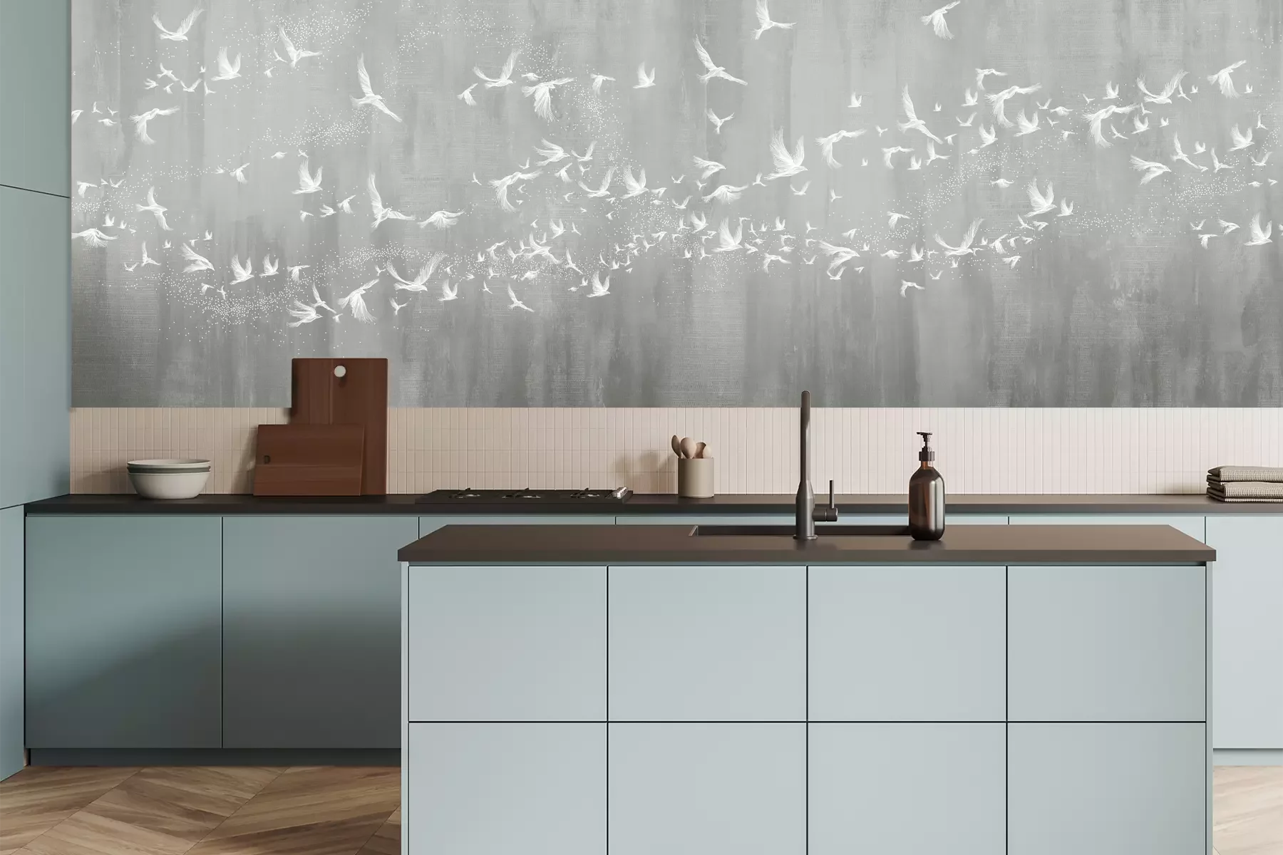 Het materiaal Premium is een glad vinyl op vlies, dat bestand is tegen uitrekken en vervorming. Het is dampdoorlatend – de muren kunnen vrij ademen – waardoor het geschikt is voor gebruik in de keuken en badkamer. Bij vervuiling kan het materiaal worden afgenomen met een vochtige doek. De maximale breedte van één baan bedraagt 95 of 105 cm, afhankelijk van de beschikbaarheid. Montage vindt plaats met de rand-aan-rand methode, wat een esthetisch resultaat zonder zichtbare naden oplevert. Omdat de lijm rechtstreeks op de muur wordt aangebracht, verloopt de installatie van het fotobehang snel en eenvoudig.