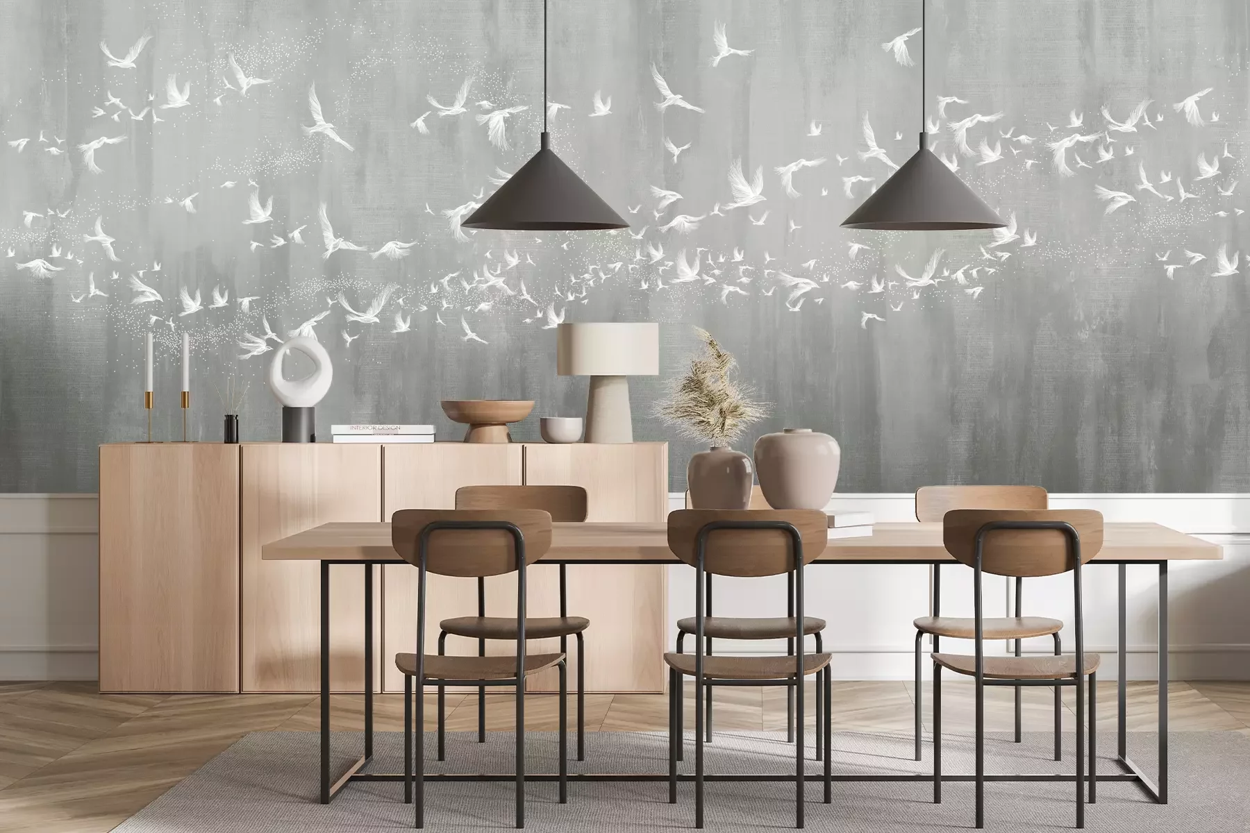 Het materiaal Premium+ is een gestructureerd vinyl op vlies met een gewicht van 255 g/m², dat kleine oneffenheden in de muur effectief camoufleert. De subtiele structuur van fijn zand geeft het oppervlak een exclusieve uitstraling, terwijl de halfmatte afwerking de diepte van de kleuren benadrukt. Het materiaal is dampdoorlatend, waardoor het ook in de keuken en badkamer kan worden gebruikt. De maximale breedte van één baan bedraagt 100 cm – bij grotere afmetingen wordt het fotobehang in meerdere gelijke banen verdeeld. De lijm wordt direct op de muur aangebracht en het behang wordt rand-aan-rand geplakt, wat zorgt voor een esthetisch resultaat zonder zichtbare naden. Het oppervlak kan gemakkelijk worden schoongemaakt door het voorzichtig af te nemen met een vochtige doek.