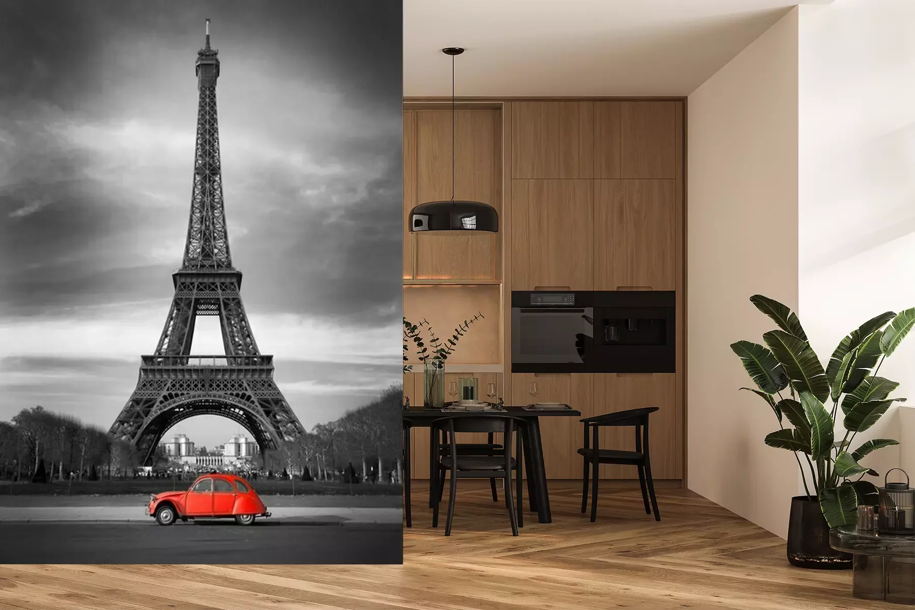 Retro rode auto op de achtergrond van ParijsProbleemloze bezorging verzorgd door vertrouwde vervoerders