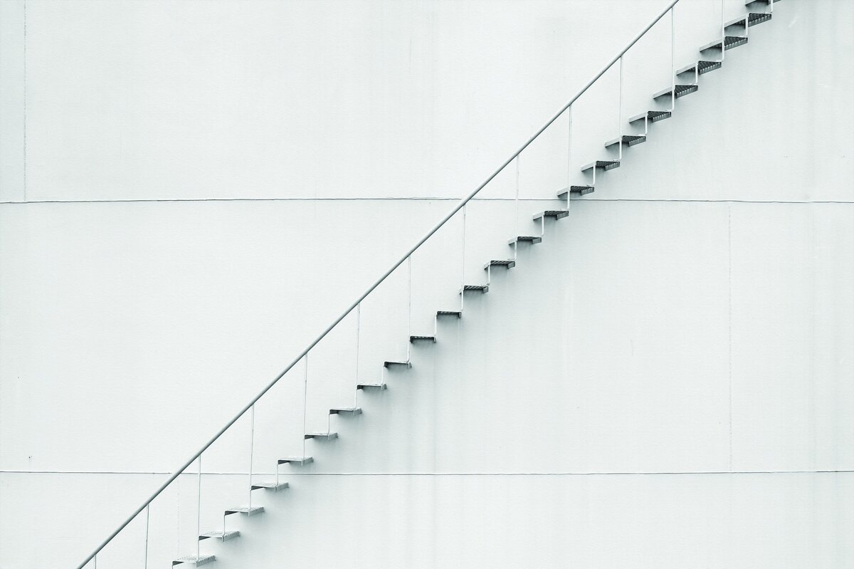 Fotobehang: Moderne opengewerkte metalen trap met een witte achtergrond