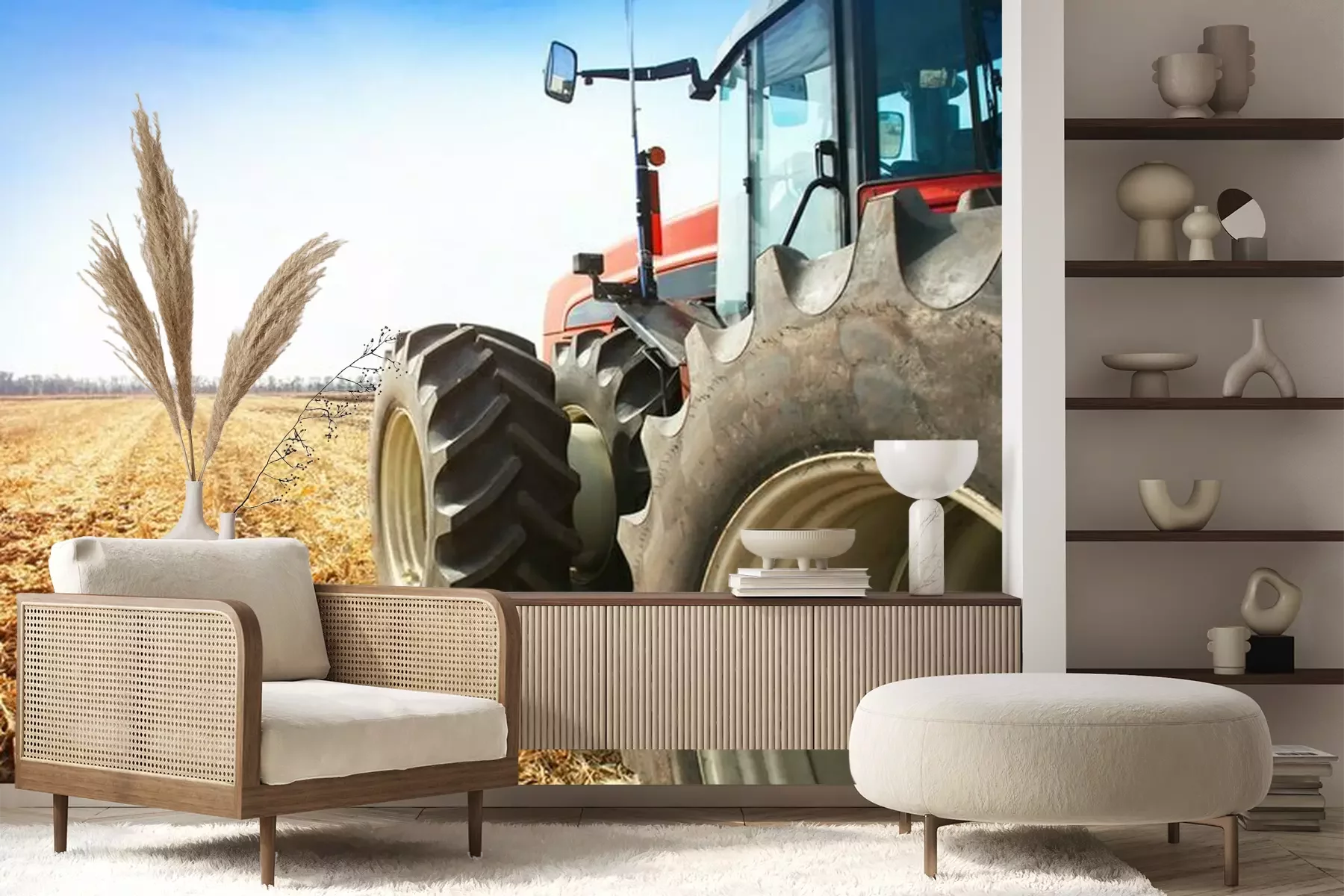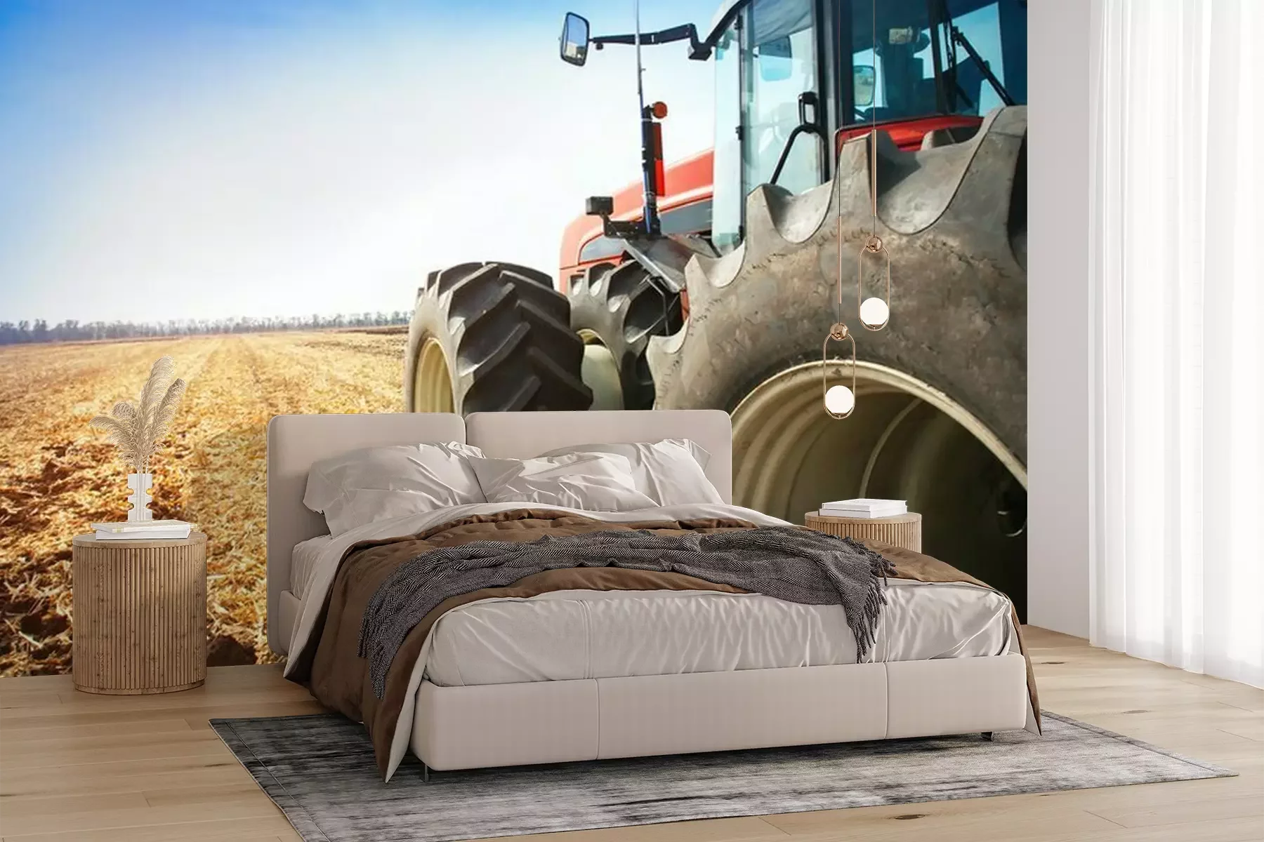 Fotobehang Moderne rode tractor op het gebied close-up.