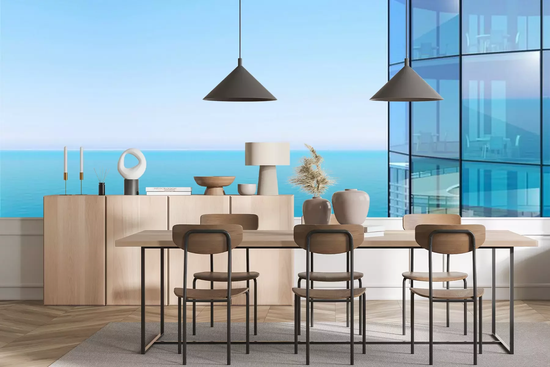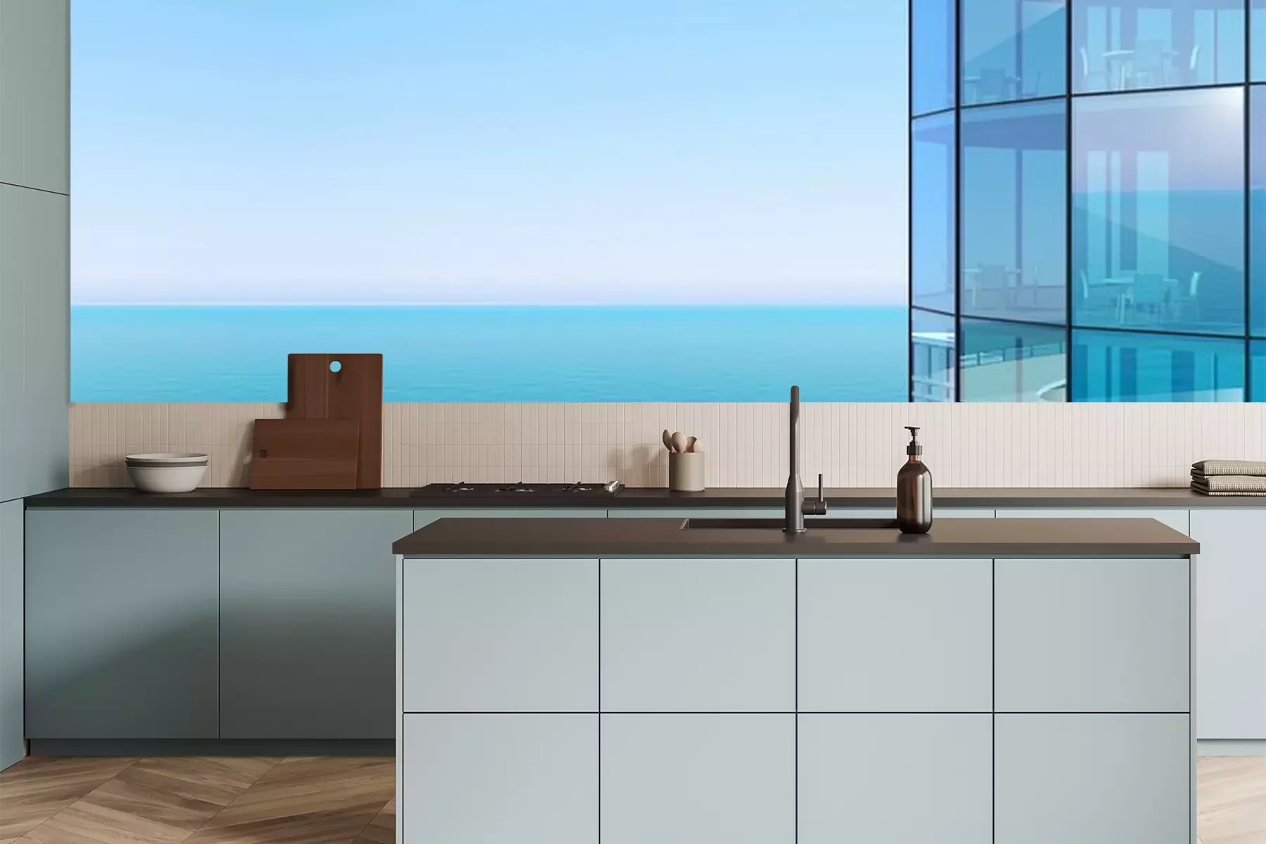 Fotobehang Moderne wolkenkrabber boven de oceaan