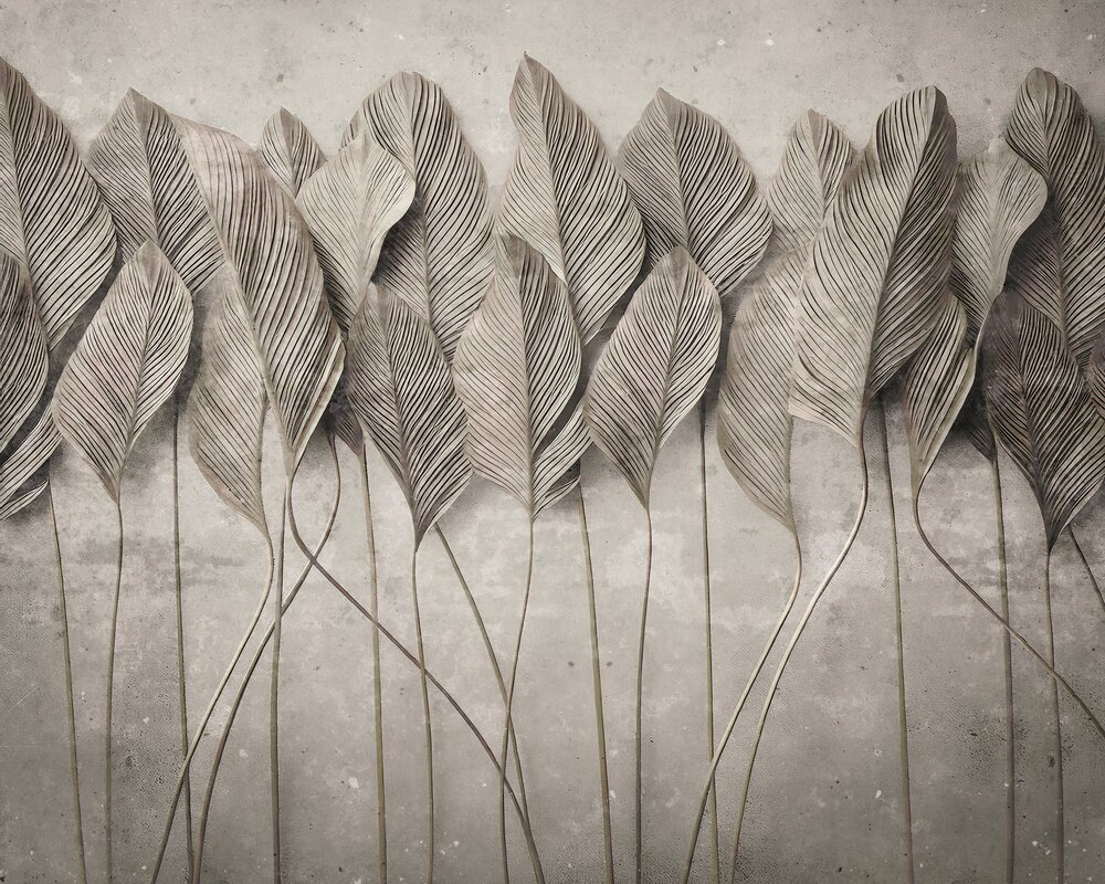Fotobehang: Monochromatische 3D-bladeren op beton