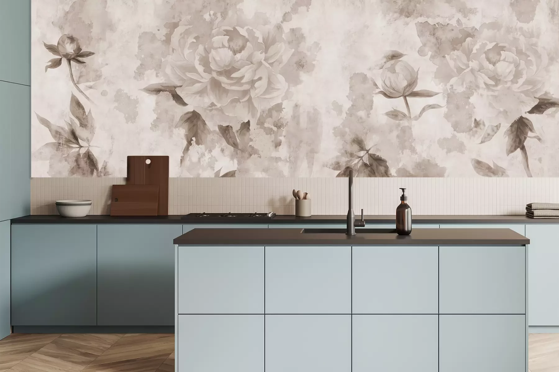 Het materiaal Premium is een glad vinyl op vlies, dat bestand is tegen uitrekken en vervorming. Het is dampdoorlatend – de muren kunnen vrij ademen – waardoor het geschikt is voor gebruik in de keuken en badkamer. Bij vervuiling kan het materiaal worden afgenomen met een vochtige doek. De maximale breedte van één baan bedraagt 95 of 105 cm, afhankelijk van de beschikbaarheid. Montage vindt plaats met de rand-aan-rand methode, wat een esthetisch resultaat zonder zichtbare naden oplevert. Omdat de lijm rechtstreeks op de muur wordt aangebracht, verloopt de installatie van het fotobehang snel en eenvoudig.