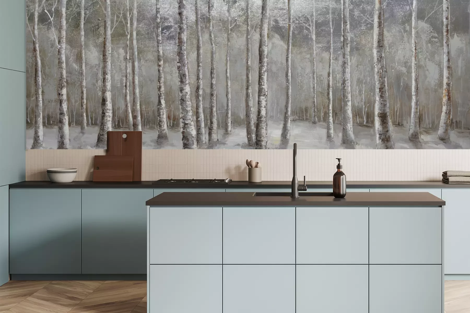 Het materiaal Premium is een glad vinyl op vlies, dat bestand is tegen uitrekken en vervorming. Het is dampdoorlatend – de muren kunnen vrij ademen – waardoor het geschikt is voor gebruik in de keuken en badkamer. Bij vervuiling kan het materiaal worden afgenomen met een vochtige doek. De maximale breedte van één baan bedraagt 95 of 105 cm, afhankelijk van de beschikbaarheid. Montage vindt plaats met de rand-aan-rand methode, wat een esthetisch resultaat zonder zichtbare naden oplevert. Omdat de lijm rechtstreeks op de muur wordt aangebracht, verloopt de installatie van het fotobehang snel en eenvoudig.