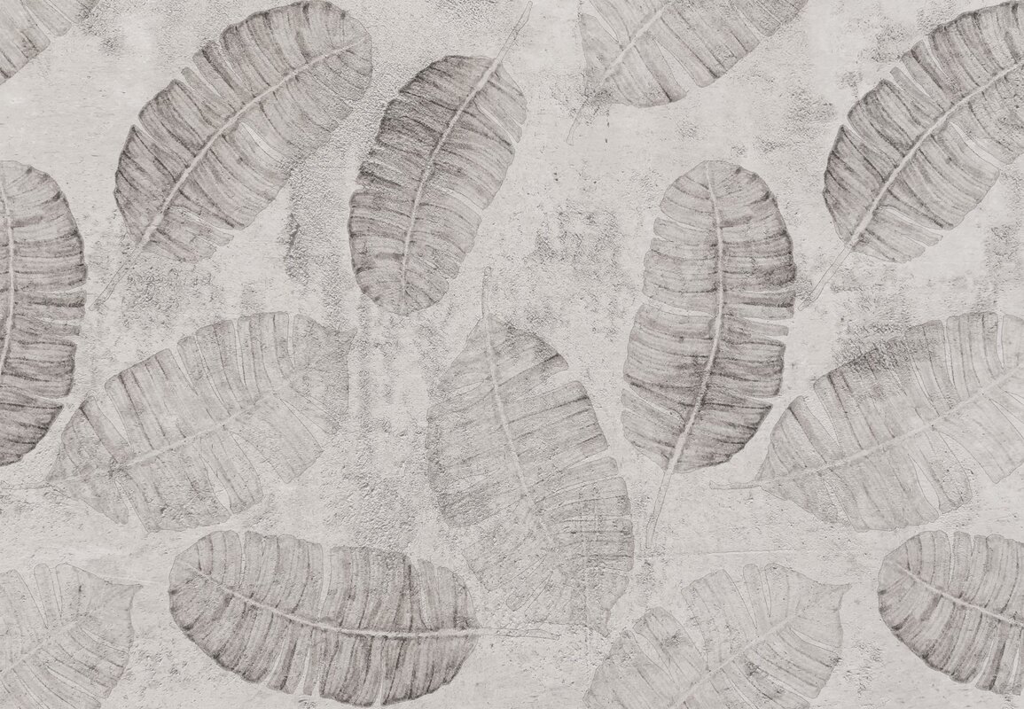 Fotobehang: Monochroom patroon met bladeren op een grijze achtergrond