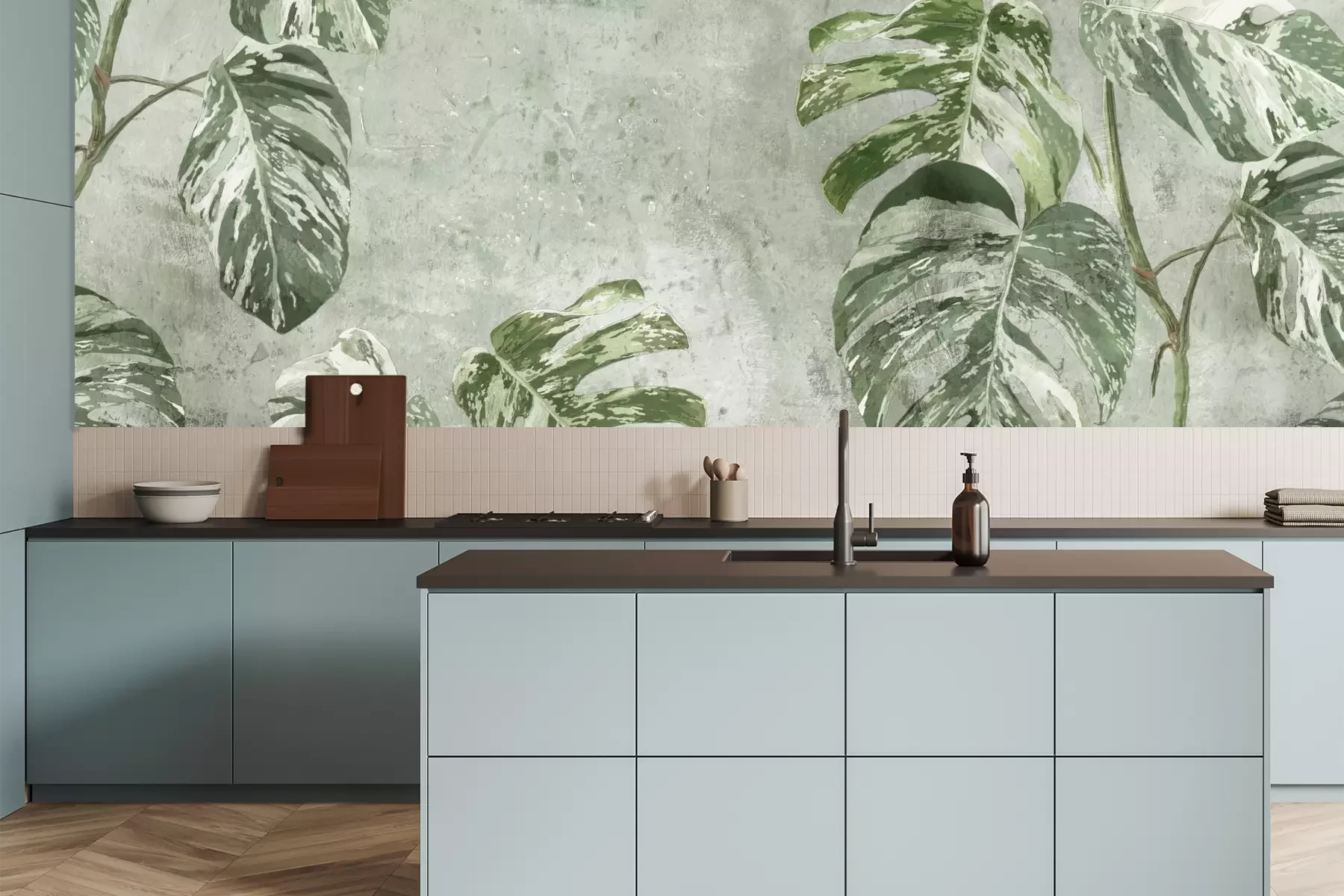 Het materiaal Premium is een glad vinyl op vlies, dat bestand is tegen uitrekken en vervorming. Het is dampdoorlatend – de muren kunnen vrij ademen – waardoor het geschikt is voor gebruik in de keuken en badkamer. Bij vervuiling kan het materiaal worden afgenomen met een vochtige doek. De maximale breedte van één baan bedraagt 95 of 105 cm, afhankelijk van de beschikbaarheid. Montage vindt plaats met de rand-aan-rand methode, wat een esthetisch resultaat zonder zichtbare naden oplevert. Omdat de lijm rechtstreeks op de muur wordt aangebracht, verloopt de installatie van het fotobehang snel en eenvoudig.
