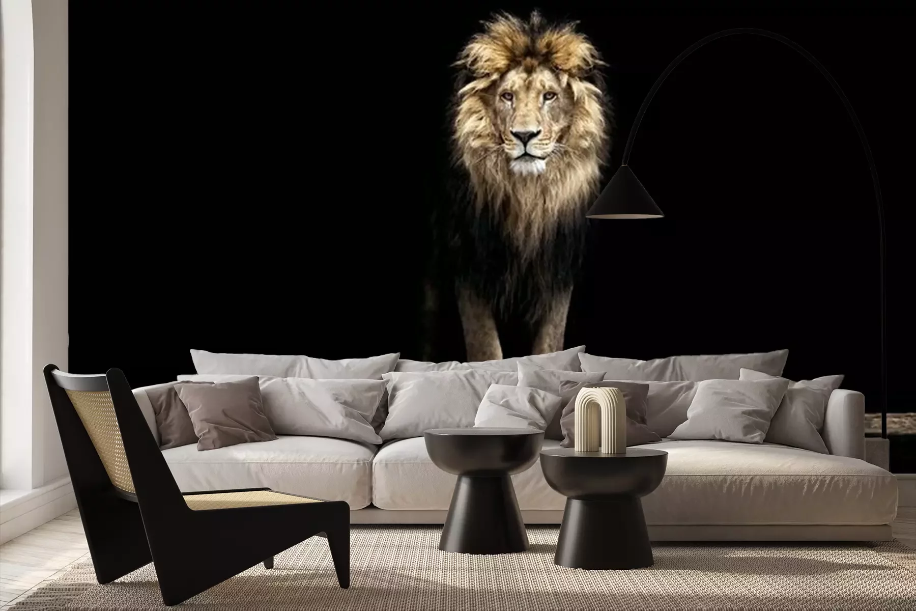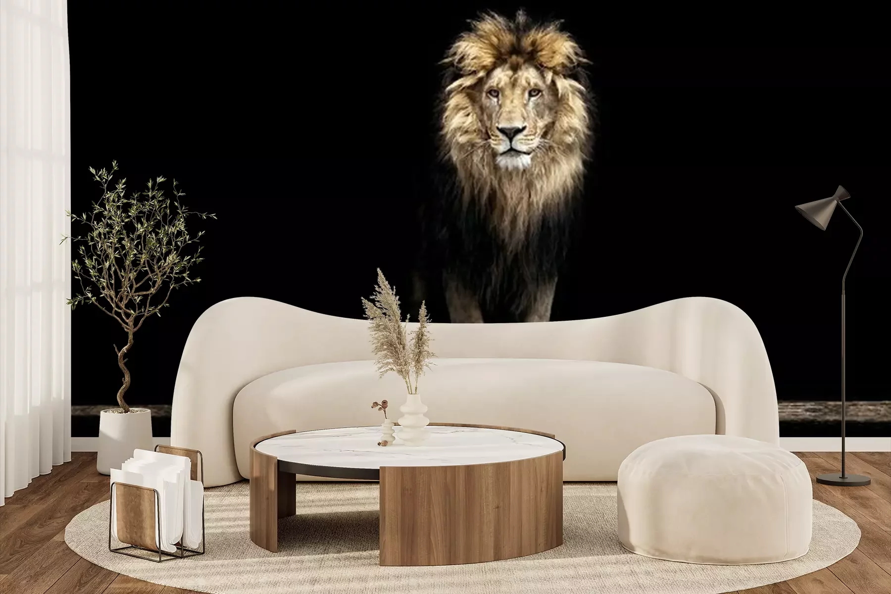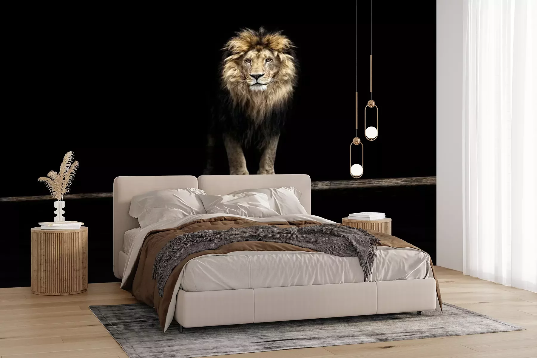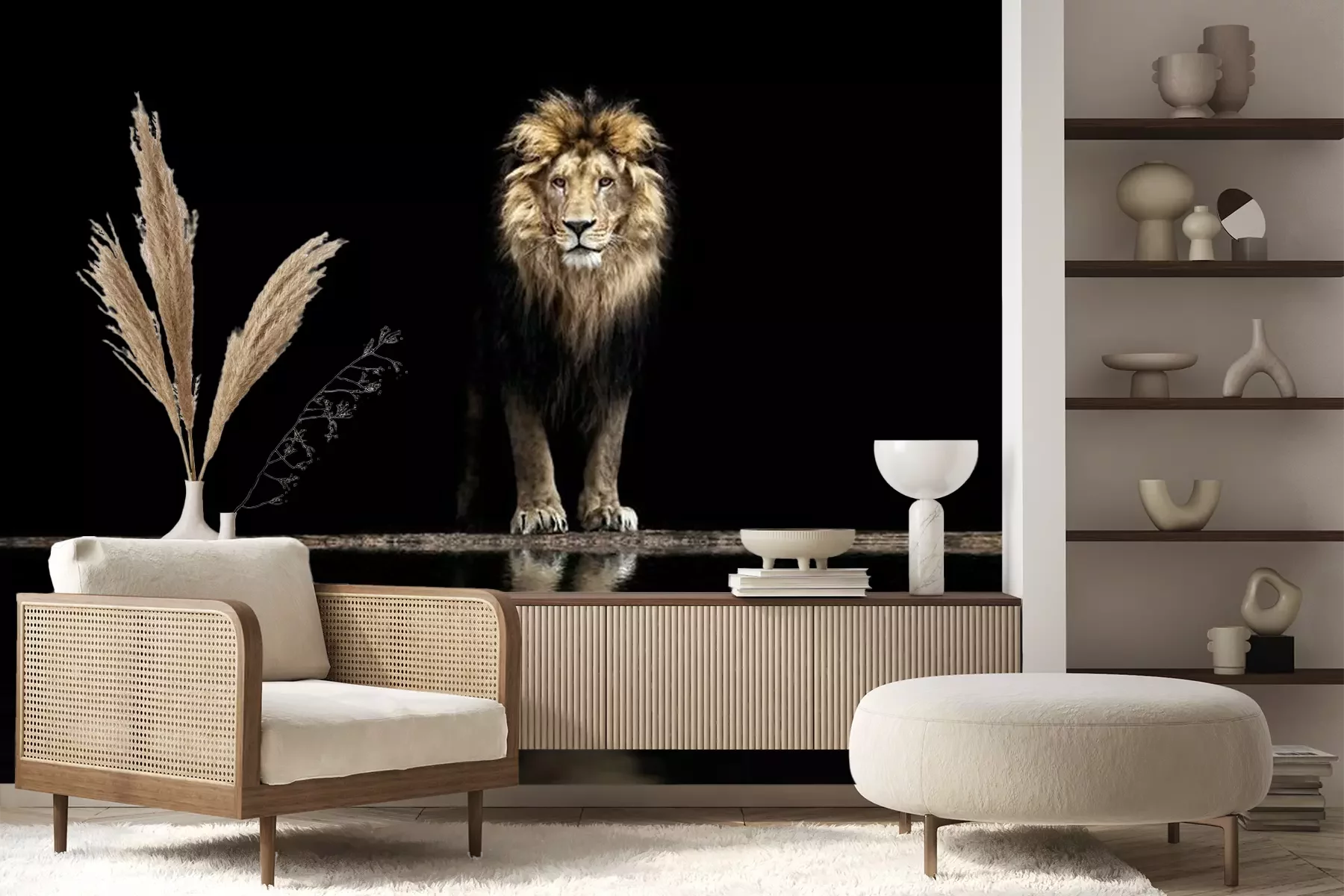 Fotobehang Mooie leeuw bij een drinkplaats op zwarte achtergrond
