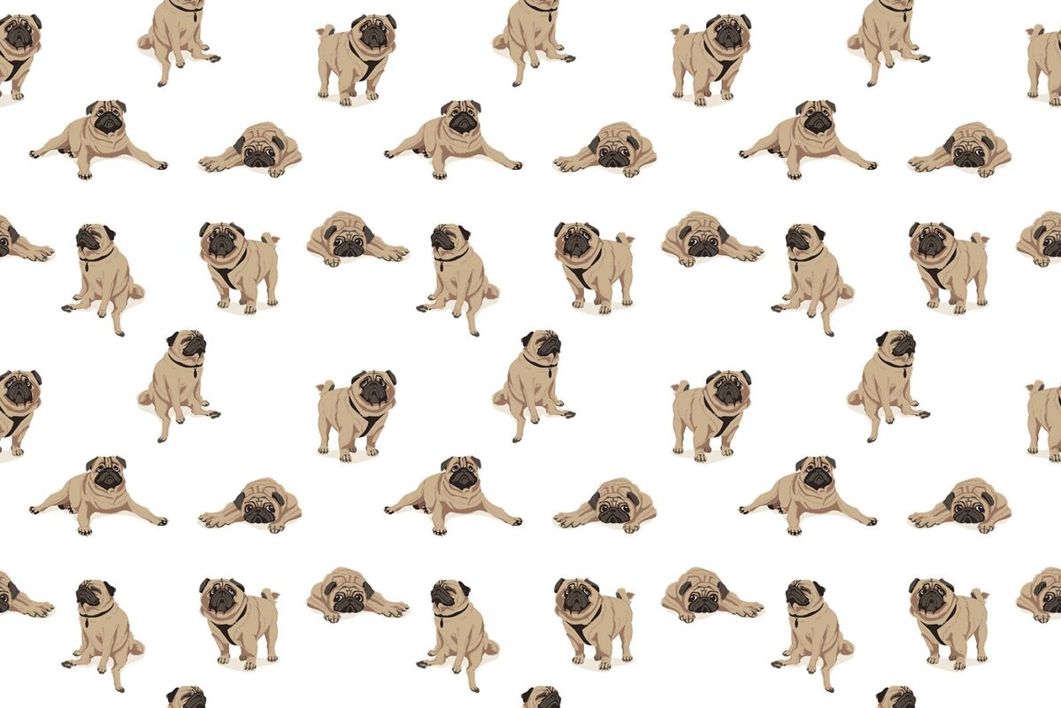 Fotobehang: Mopshonden in een grappig illustratief arrangement