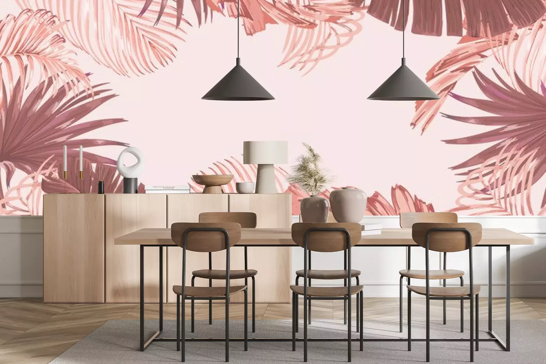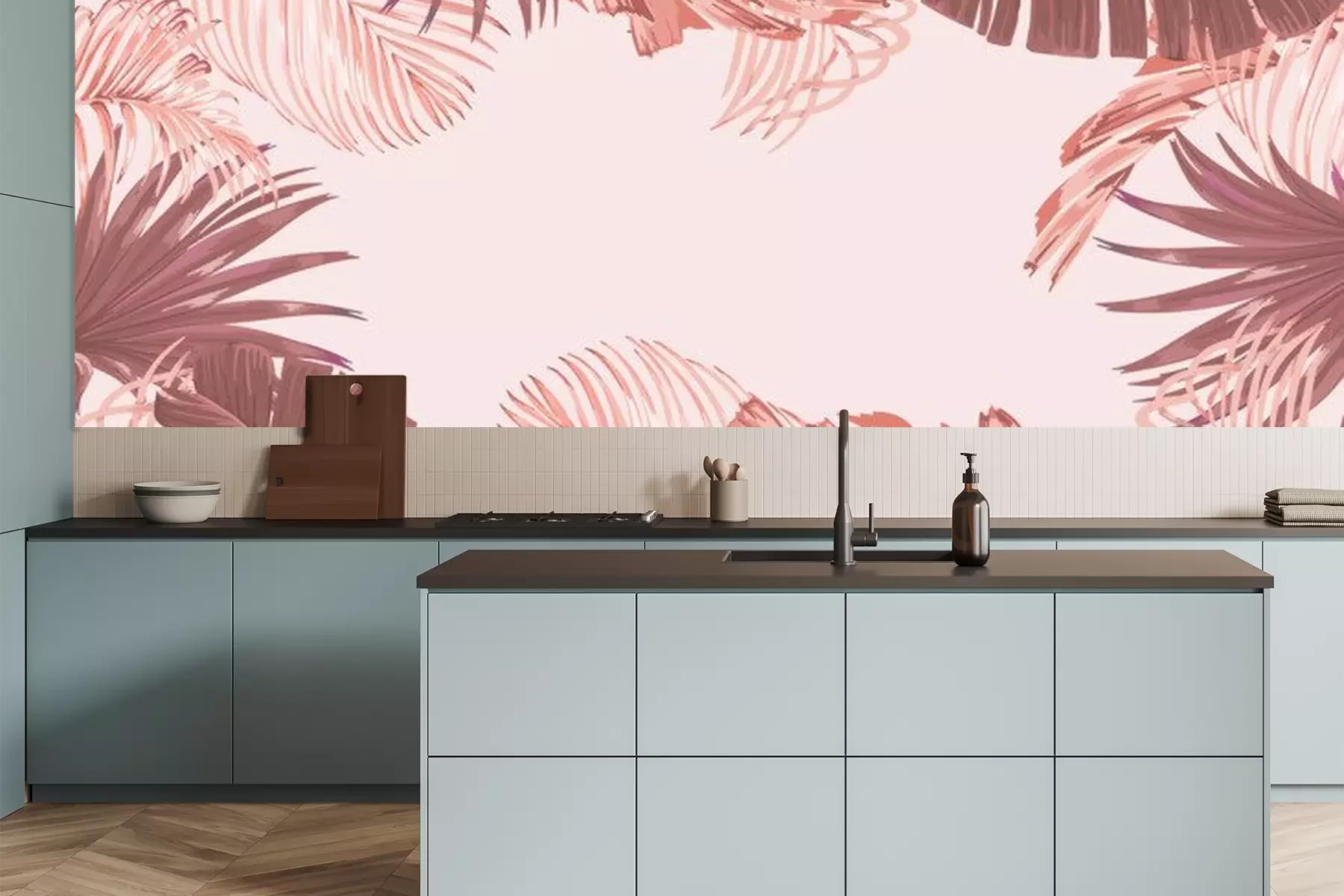 Fotobehang Motief met tropische planten in roze kleur