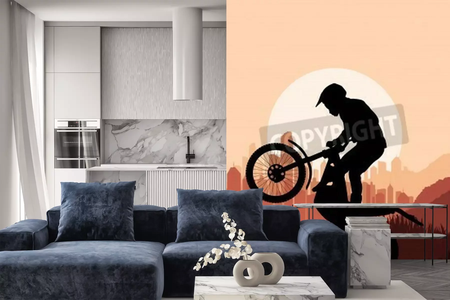 Fotobehang Motorrijder in wolkenkrabber stadslandschap achtergrond illustratie