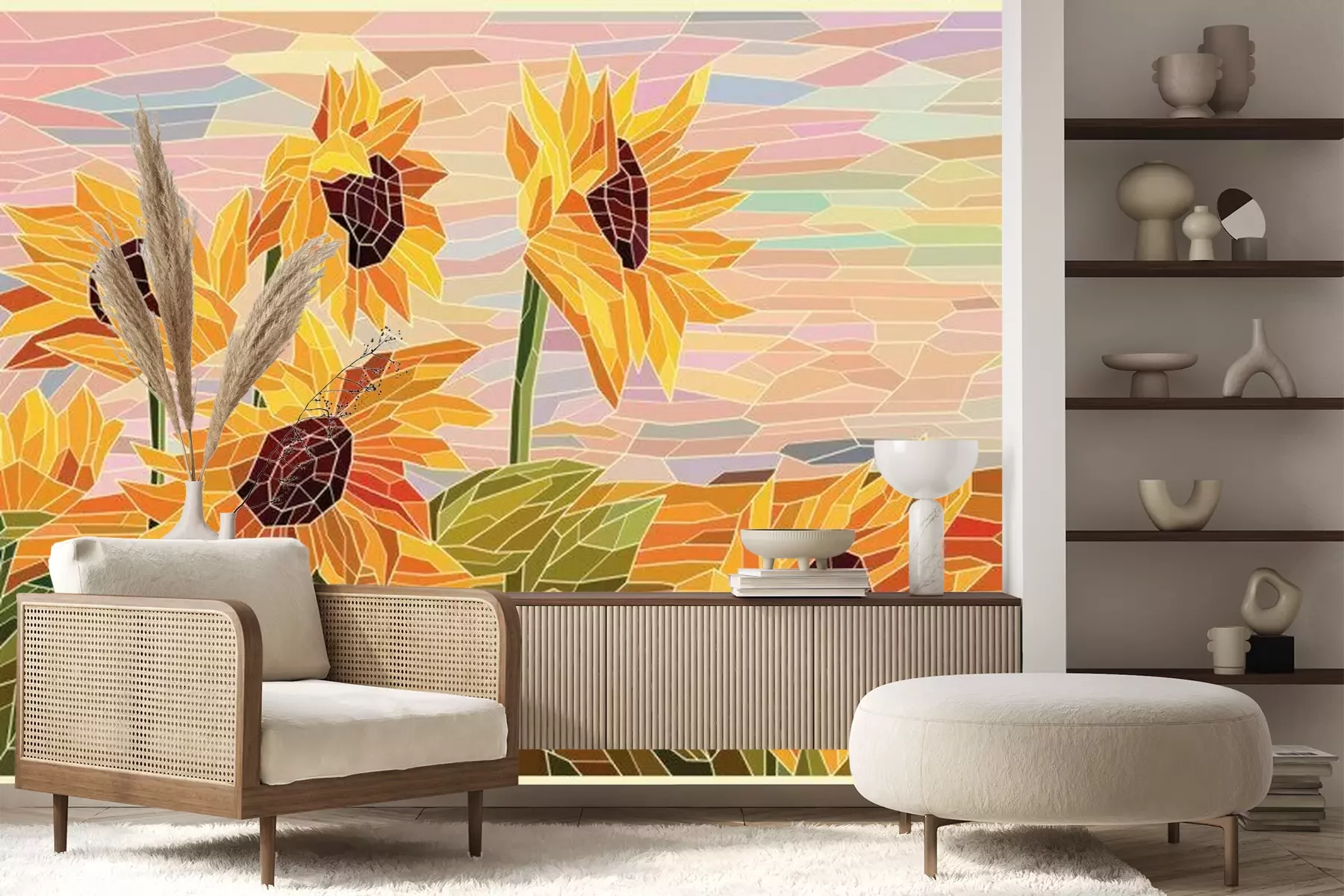 Het materiaal Premium+ is een gestructureerd vinyl op vlies met een gewicht van 255 g/m², dat kleine oneffenheden in de muur effectief camoufleert. De subtiele structuur van fijn zand geeft het oppervlak een exclusieve uitstraling, terwijl de halfmatte afwerking de diepte van de kleuren benadrukt. Het materiaal is dampdoorlatend, waardoor het ook in de keuken en badkamer kan worden gebruikt. De maximale breedte van één baan bedraagt 100 cm – bij grotere afmetingen wordt het fotobehang in meerdere gelijke banen verdeeld. De lijm wordt direct op de muur aangebracht en het behang wordt rand-aan-rand geplakt, wat zorgt voor een esthetisch resultaat zonder zichtbare naden. Het oppervlak kan gemakkelijk worden schoongemaakt door het voorzichtig af te nemen met een vochtige doek.