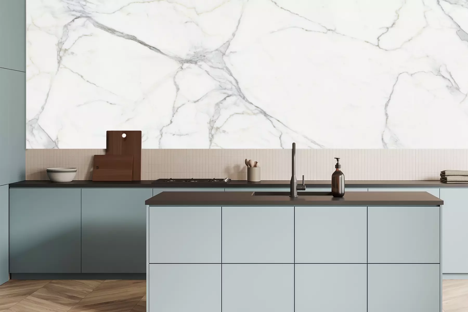 Het materiaal Premium is een glad vinyl op vlies, dat bestand is tegen uitrekken en vervorming. Het is dampdoorlatend – de muren kunnen vrij ademen – waardoor het geschikt is voor gebruik in de keuken en badkamer. Bij vervuiling kan het materiaal worden afgenomen met een vochtige doek. De maximale breedte van één baan bedraagt 95 of 105 cm, afhankelijk van de beschikbaarheid. Montage vindt plaats met de rand-aan-rand methode, wat een esthetisch resultaat zonder zichtbare naden oplevert. Omdat de lijm rechtstreeks op de muur wordt aangebracht, verloopt de installatie van het fotobehang snel en eenvoudig.