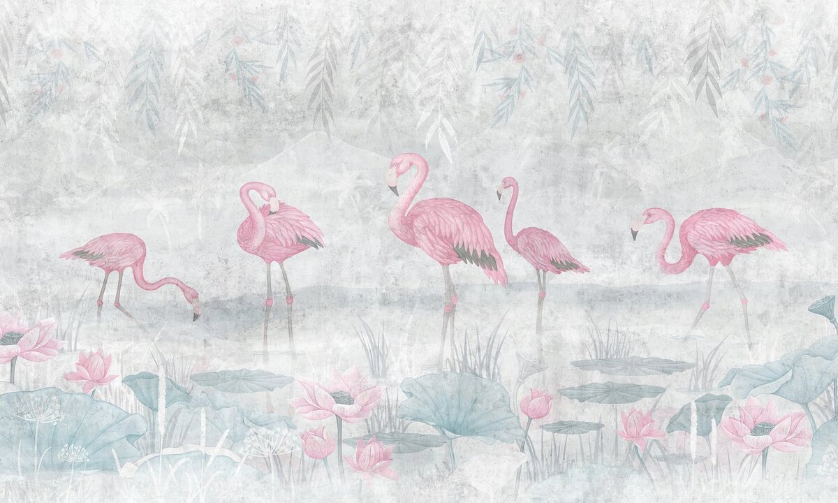 Muurschildering met flamingo's en roze waterlelies