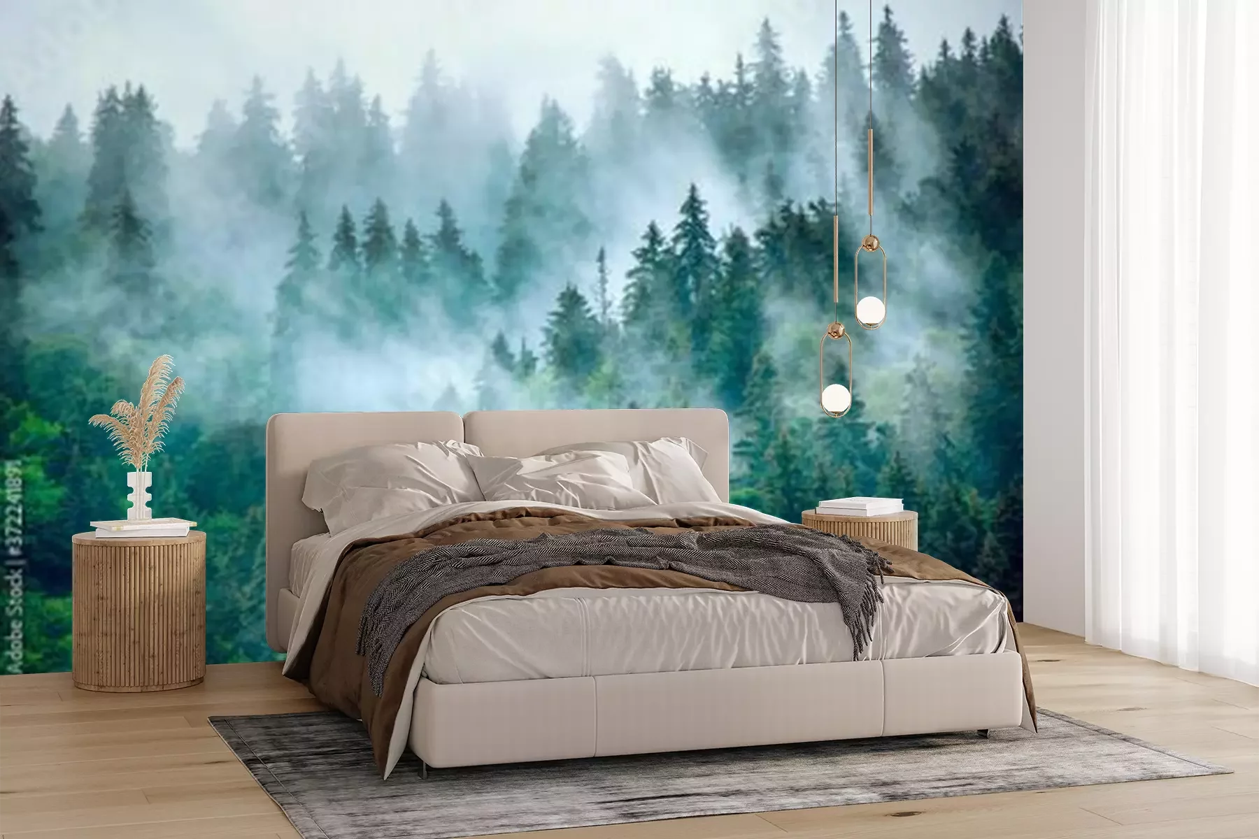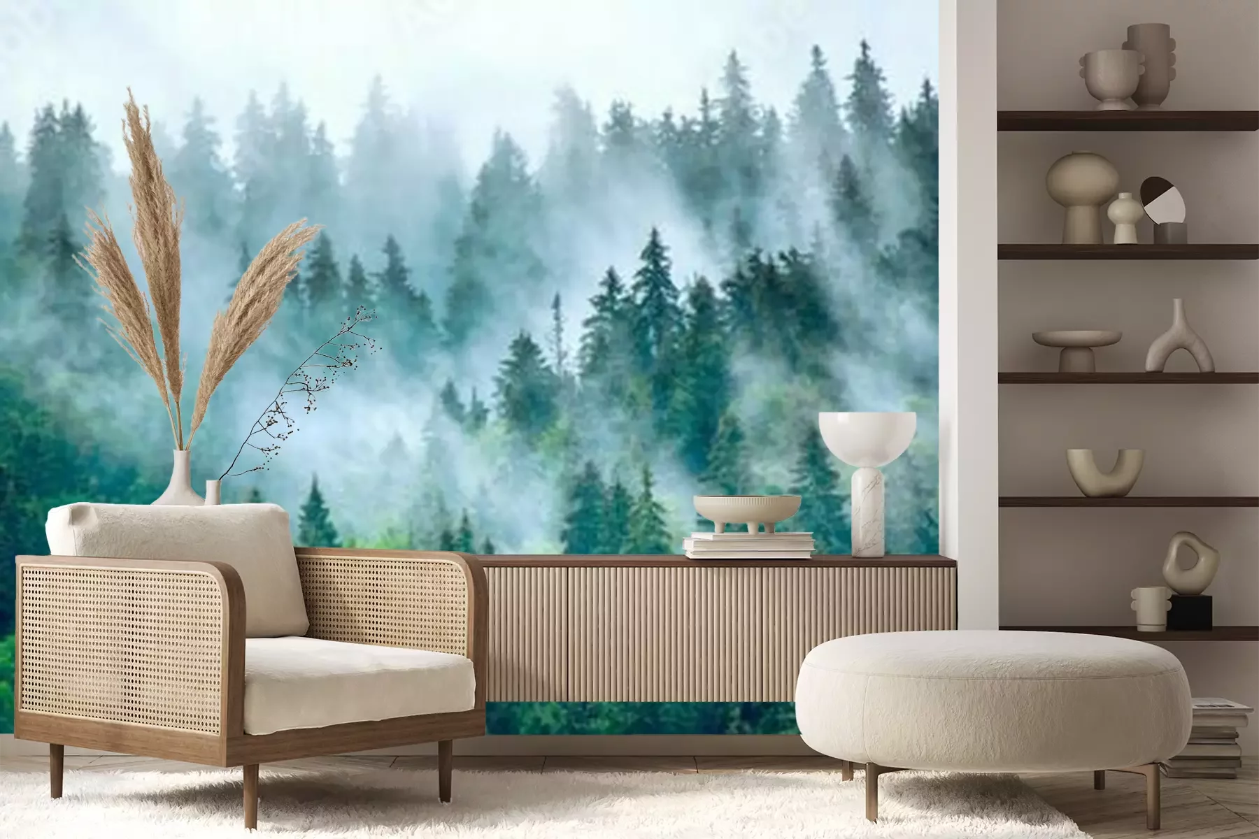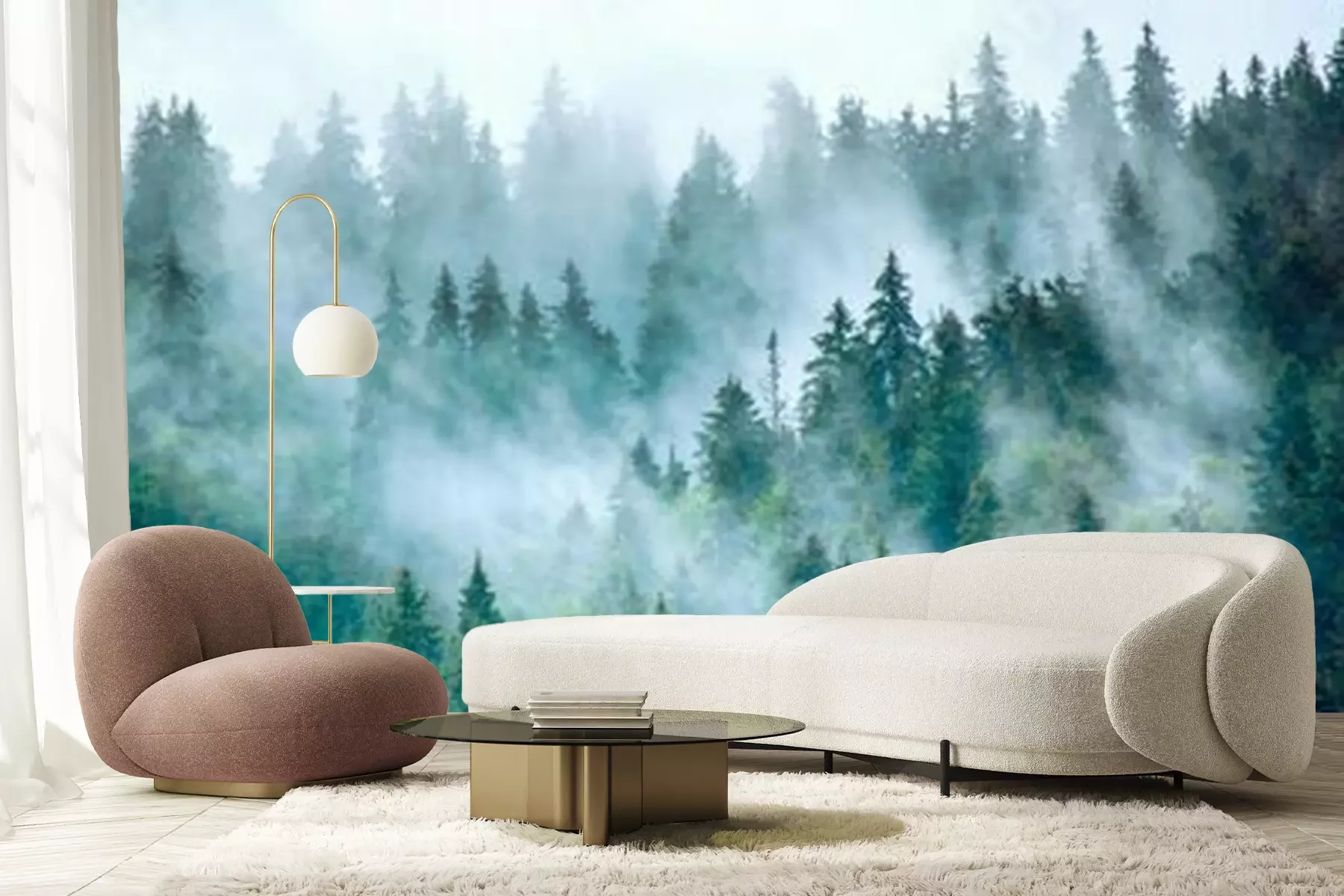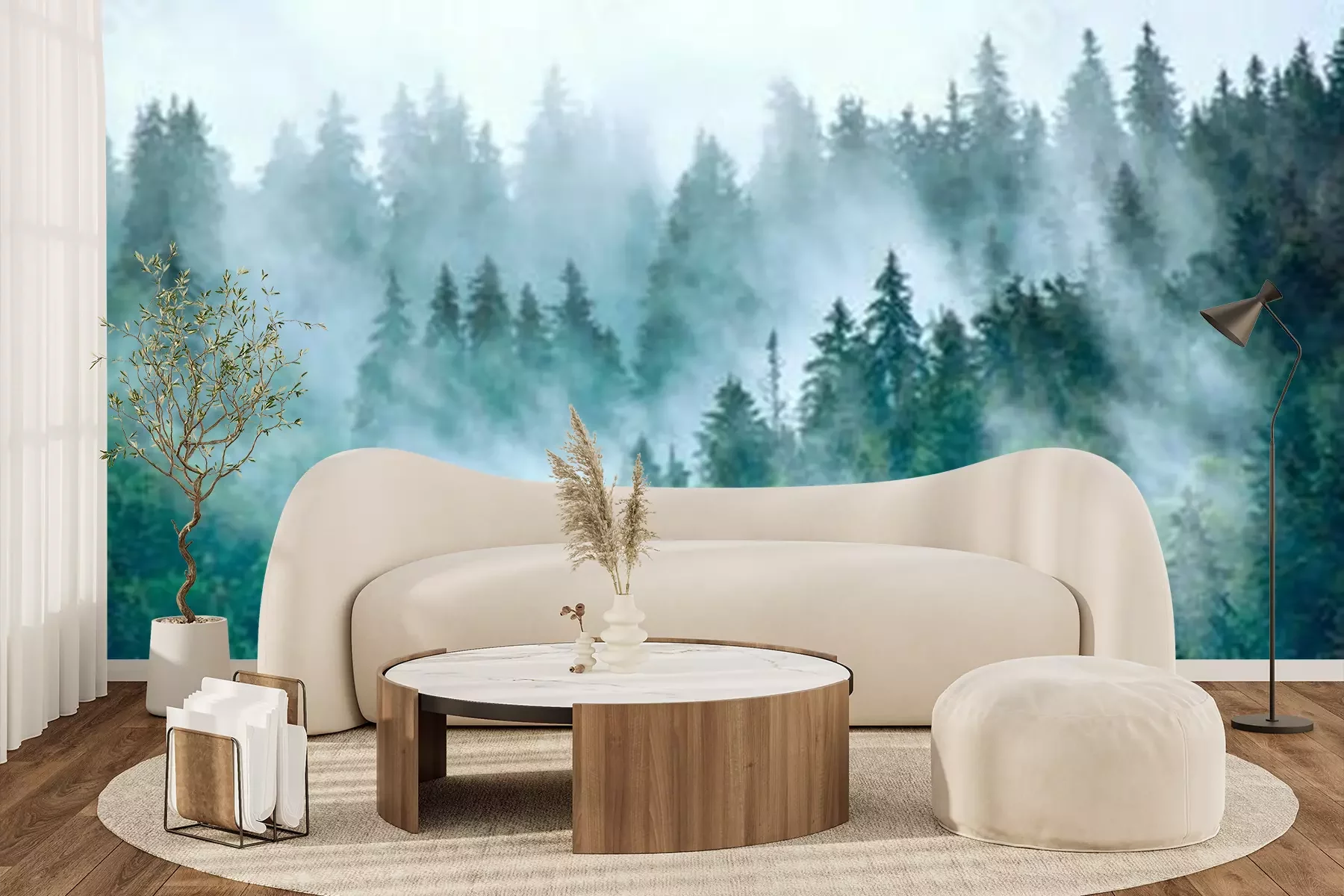 Een sparrenbos gehuld in ochtendmistFotobehang