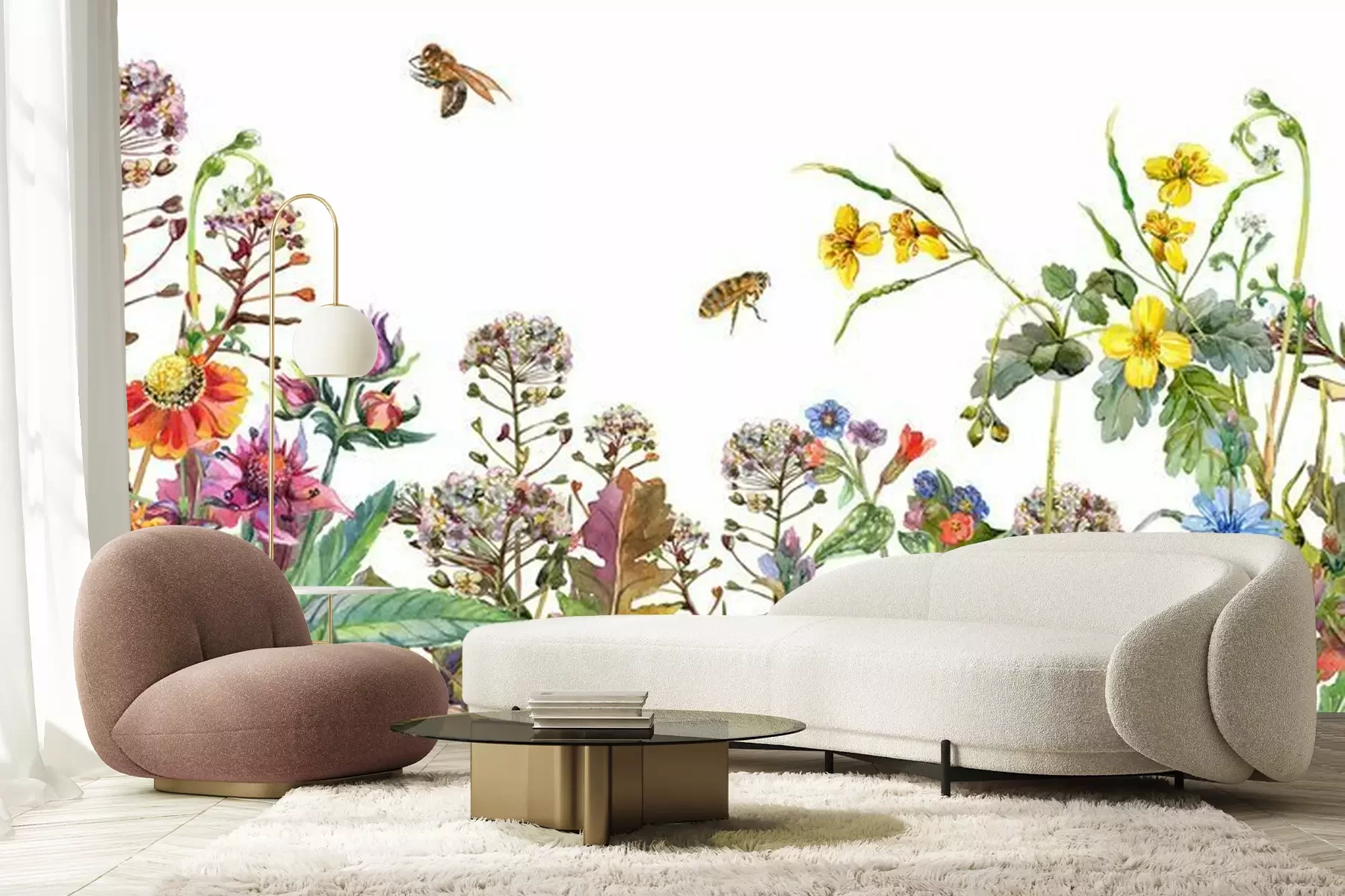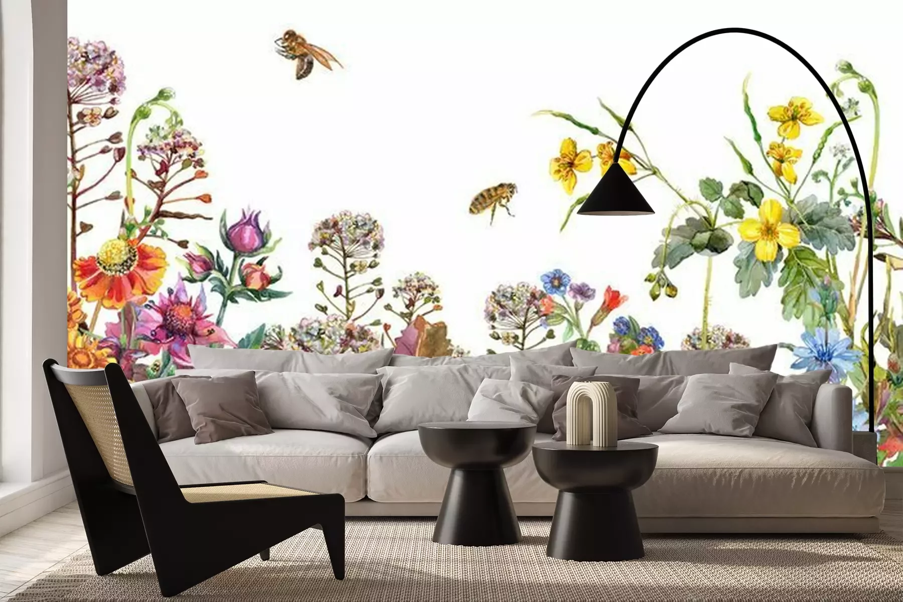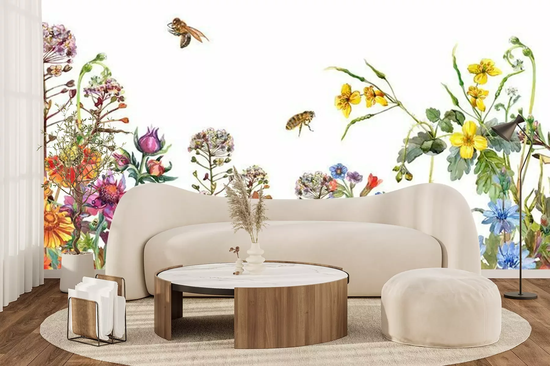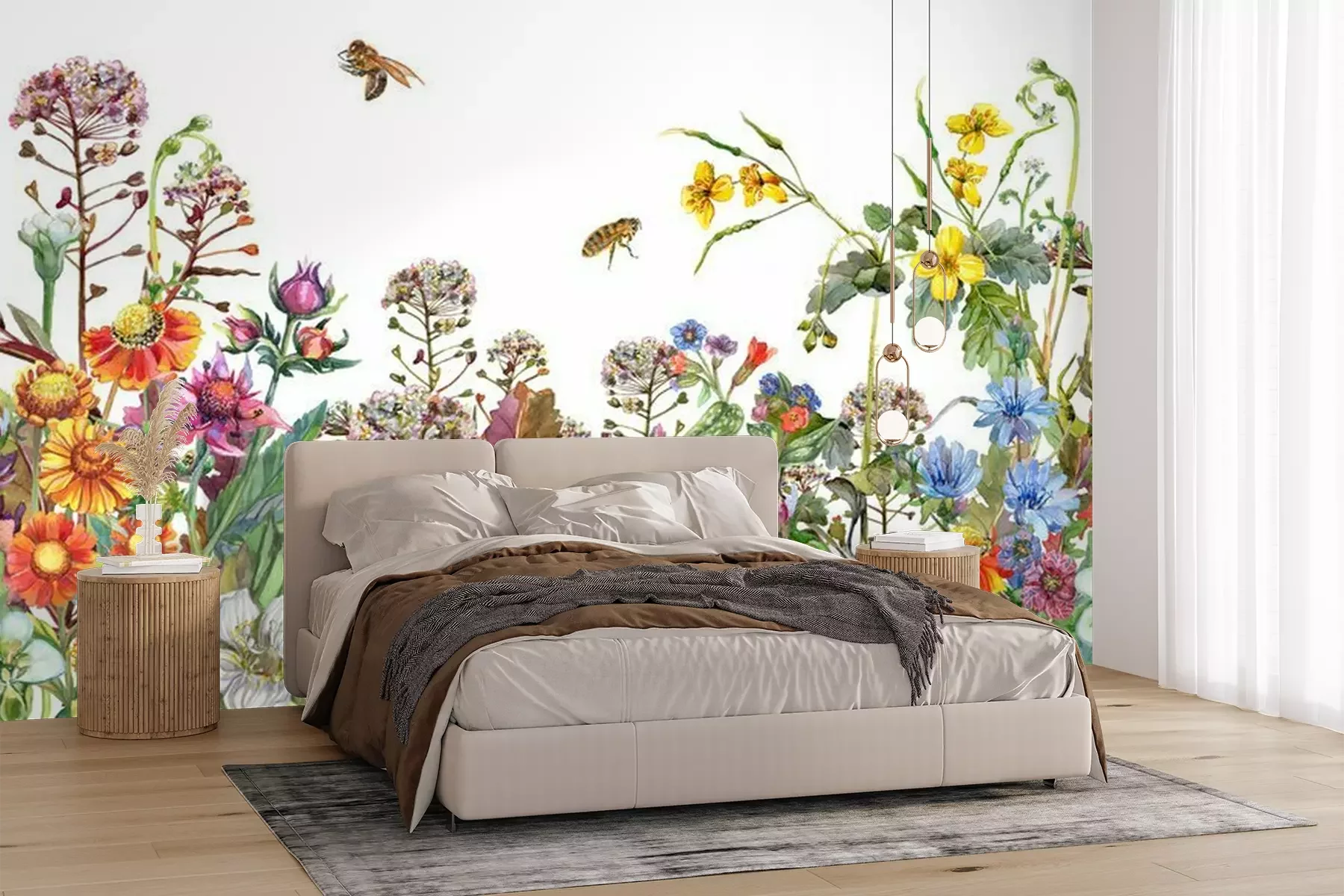 Fotobehang Naadloze rand. Grens met kruiden en wilde bloemen, bladeren. Botanische kleurrijke illustratie op witte achtergrond. De samenstelling van de zomer met bijen. Aquarel tekening.