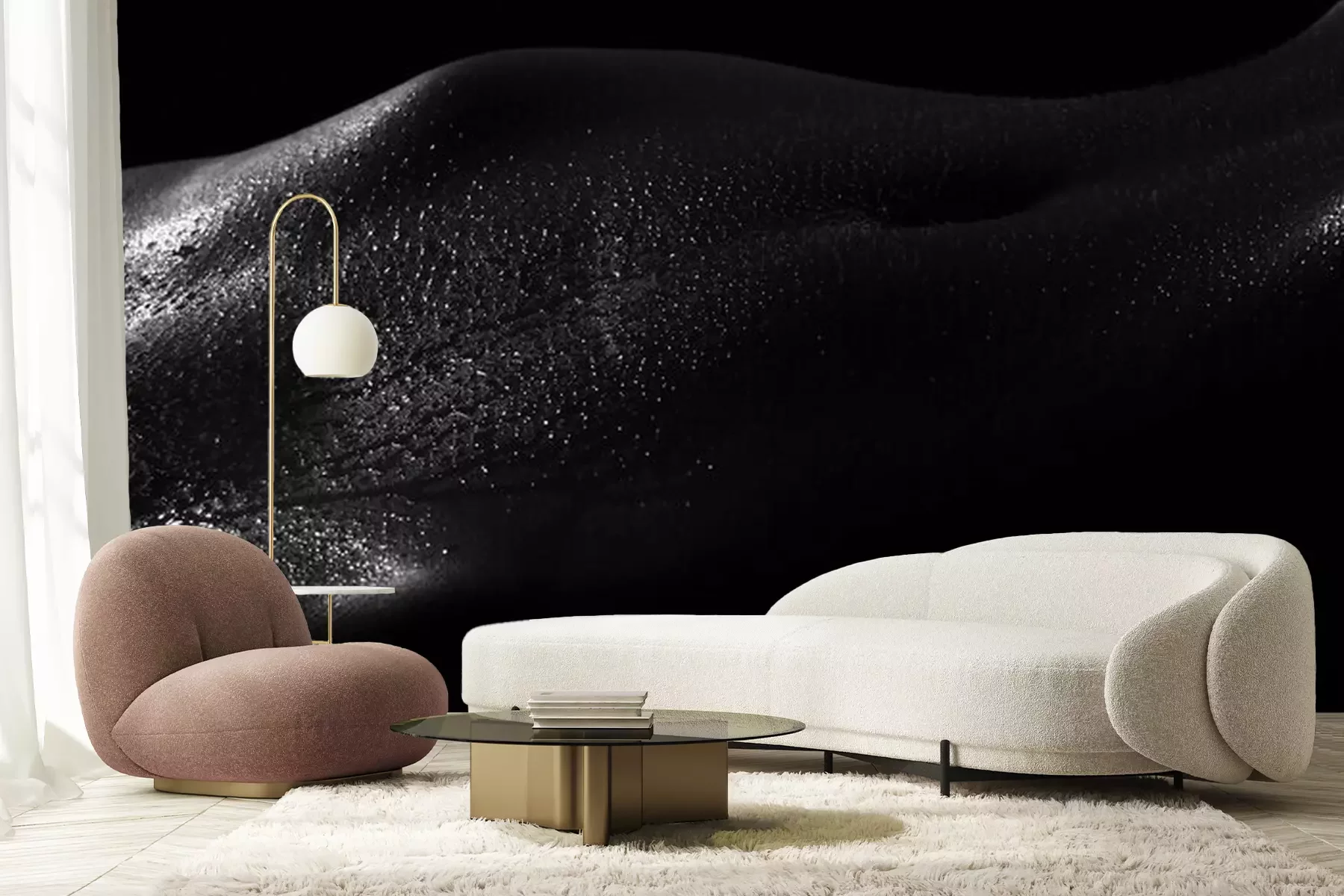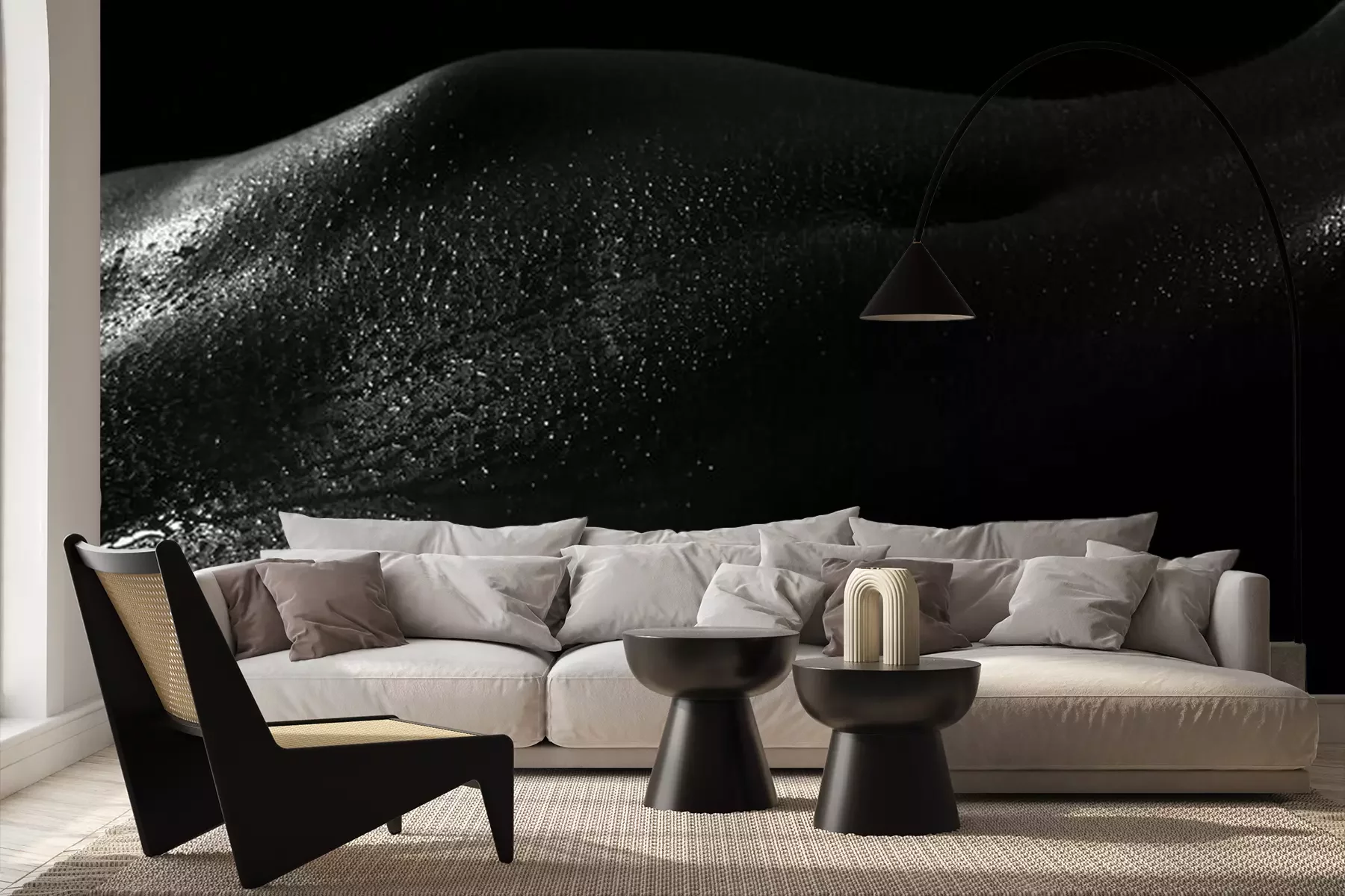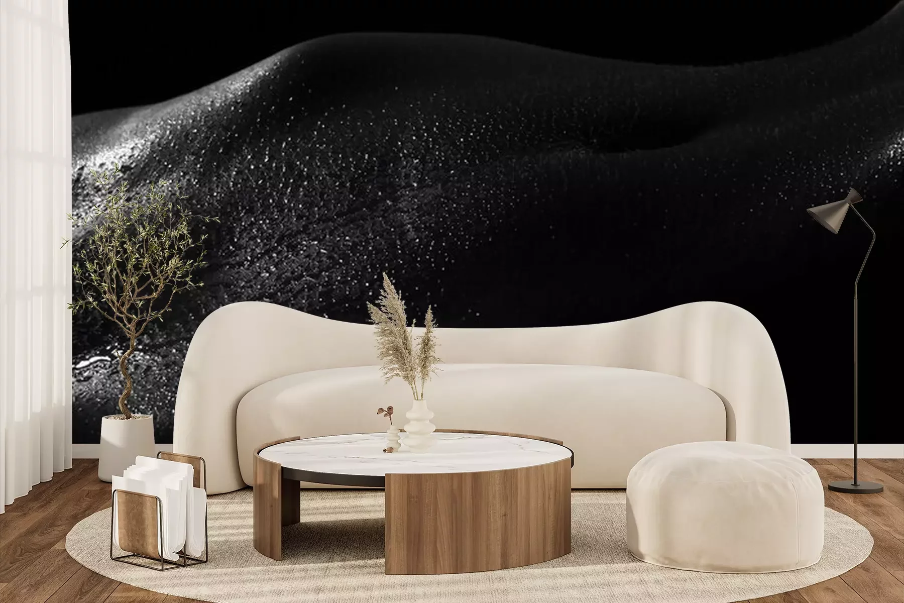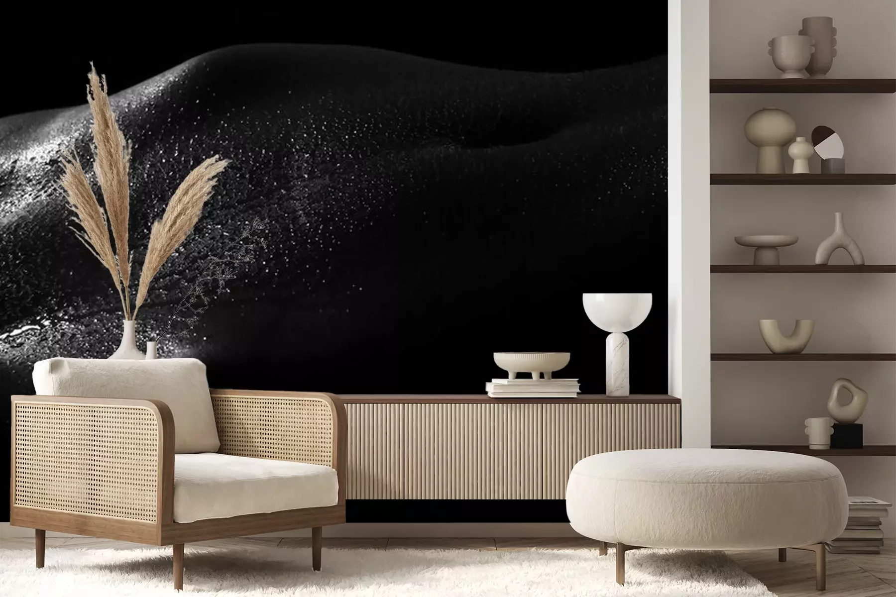 Het materiaal Premium+ is een gestructureerd vinyl op vlies met een gewicht van 255 g/m², dat kleine oneffenheden in de muur effectief camoufleert. De subtiele structuur van fijn zand geeft het oppervlak een exclusieve uitstraling, terwijl de halfmatte afwerking de diepte van de kleuren benadrukt. Het materiaal is dampdoorlatend, waardoor het ook in de keuken en badkamer kan worden gebruikt. De maximale breedte van één baan bedraagt 100 cm – bij grotere afmetingen wordt het fotobehang in meerdere gelijke banen verdeeld. De lijm wordt direct op de muur aangebracht en het behang wordt rand-aan-rand geplakt, wat zorgt voor een esthetisch resultaat zonder zichtbare naden. Het oppervlak kan gemakkelijk worden schoongemaakt door het voorzichtig af te nemen met een vochtige doek.