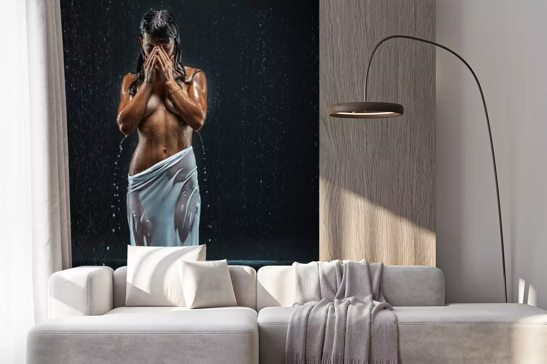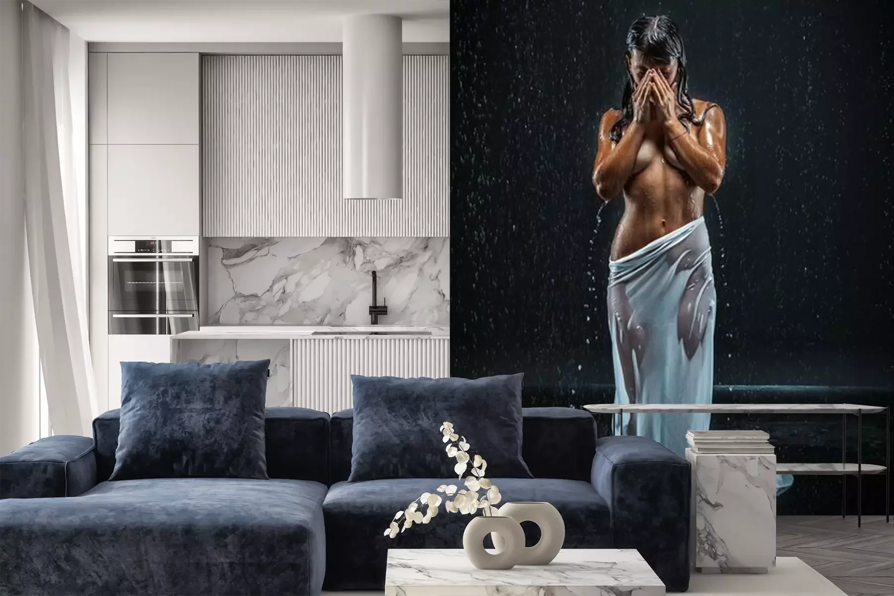 Het materiaal Premium+ is een gestructureerd vinyl op vlies met een gewicht van 255 g/m², dat kleine oneffenheden in de muur effectief camoufleert. De subtiele structuur van fijn zand geeft het oppervlak een exclusieve uitstraling, terwijl de halfmatte afwerking de diepte van de kleuren benadrukt. Het materiaal is dampdoorlatend, waardoor het ook in de keuken en badkamer kan worden gebruikt. De maximale breedte van één baan bedraagt 100 cm – bij grotere afmetingen wordt het fotobehang in meerdere gelijke banen verdeeld. De lijm wordt direct op de muur aangebracht en het behang wordt rand-aan-rand geplakt, wat zorgt voor een esthetisch resultaat zonder zichtbare naden. Het oppervlak kan gemakkelijk worden schoongemaakt door het voorzichtig af te nemen met een vochtige doek.