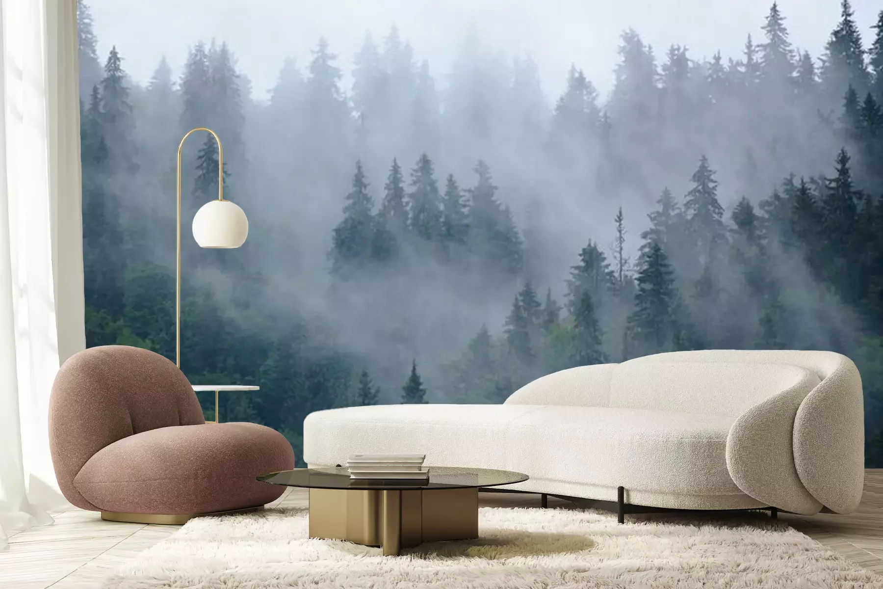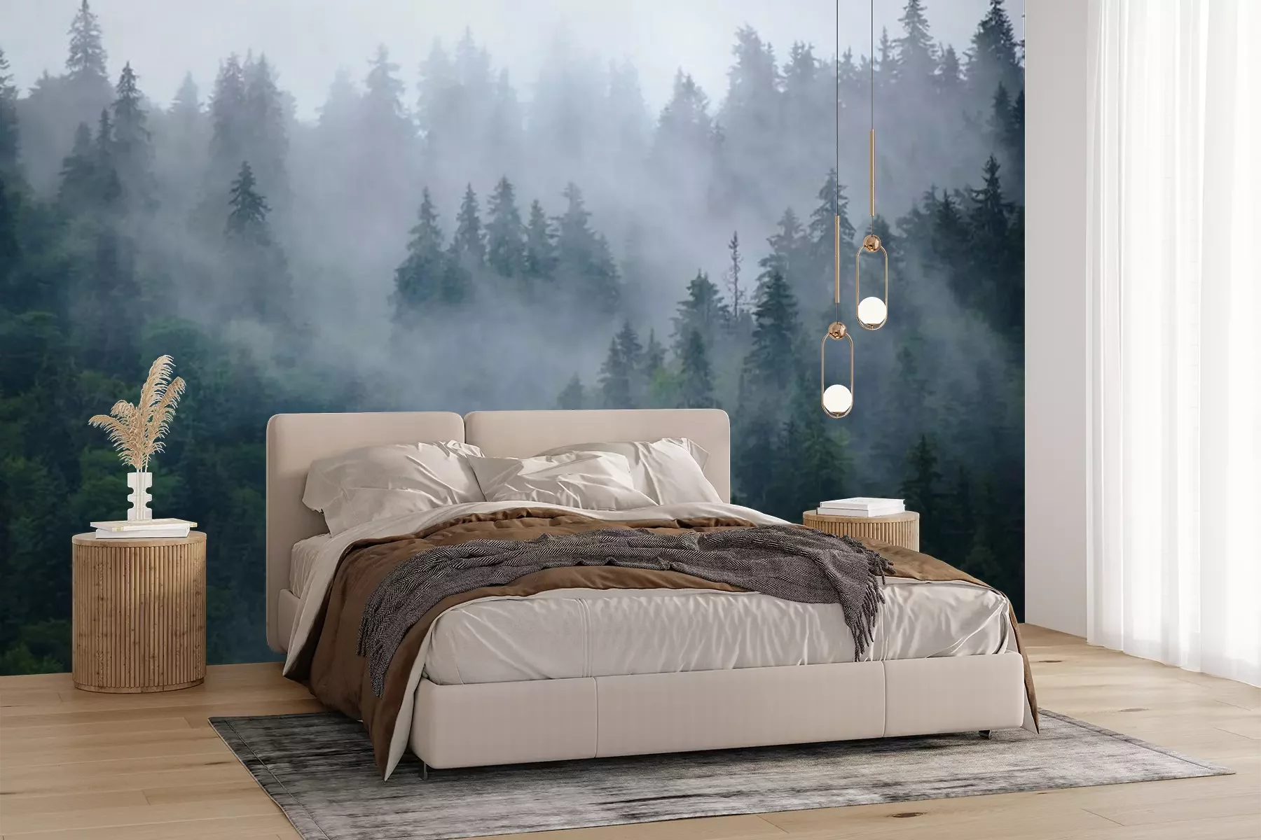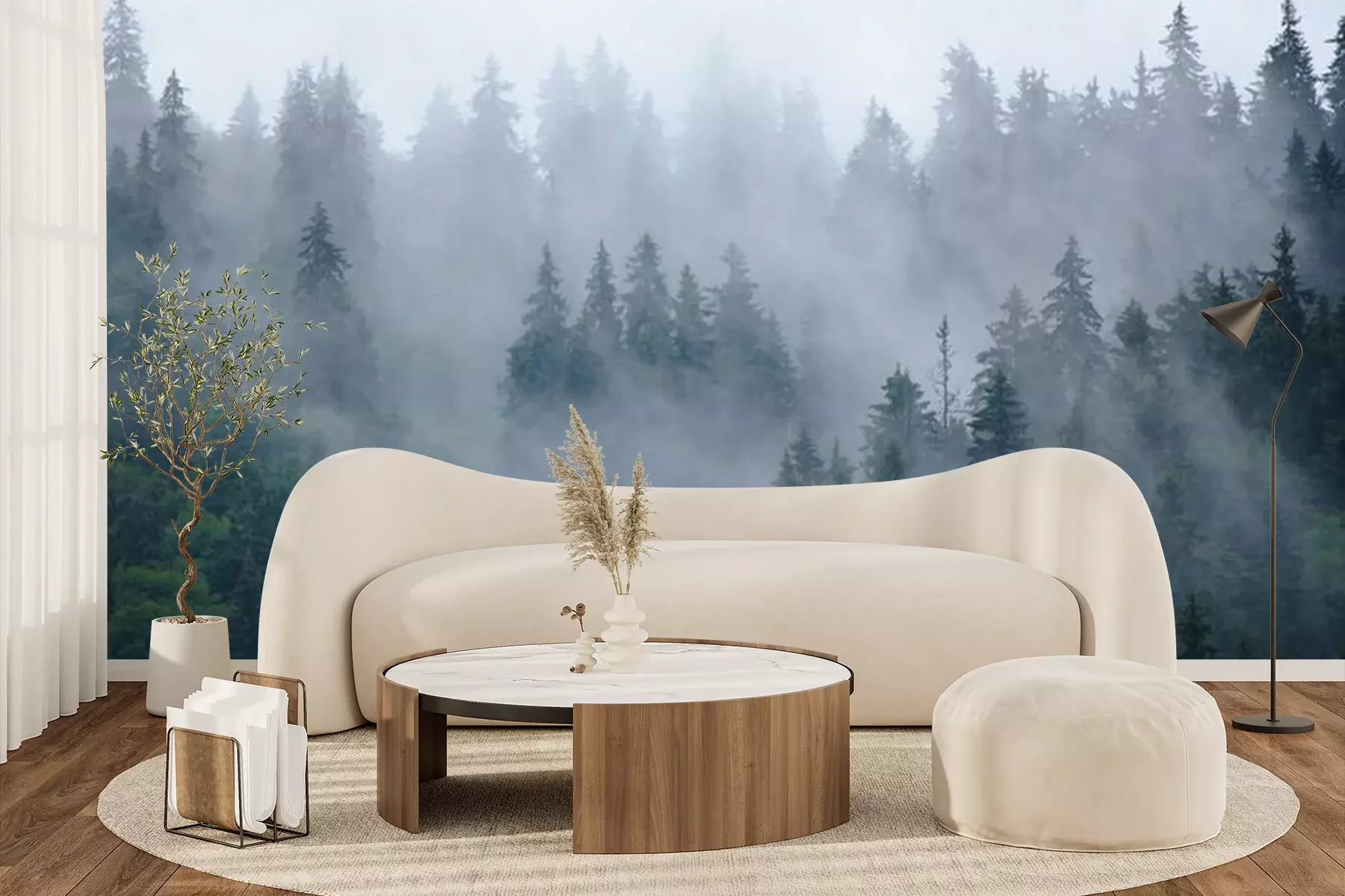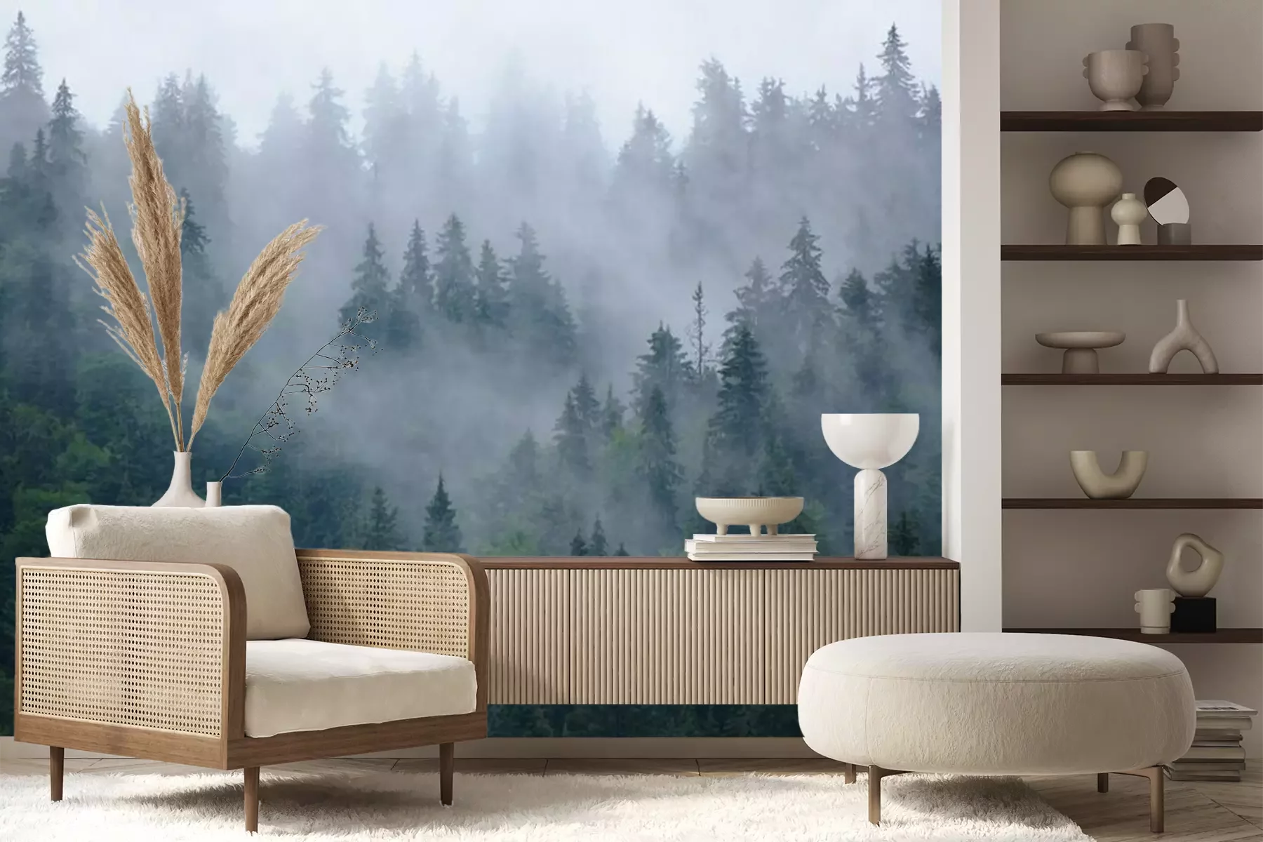 Fotobehang Naaldbos en mist