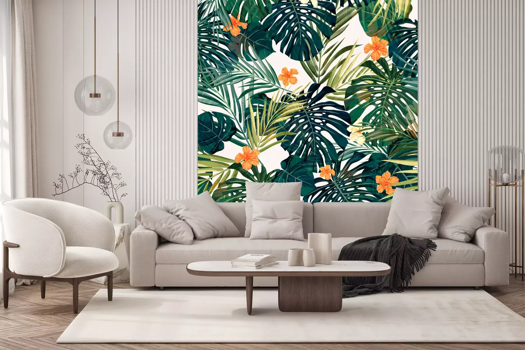 Het fotobehang wordt geleverd in banen. De afmetingen en het aantal banen waaruit het volledige fotobehang bestaat, zijn afhankelijk van het gekozen materiaal. Wanneer het formaat de maximale materiaalbreedte overschrijdt, bestaat de print uit meerdere gelijkmatige banen.