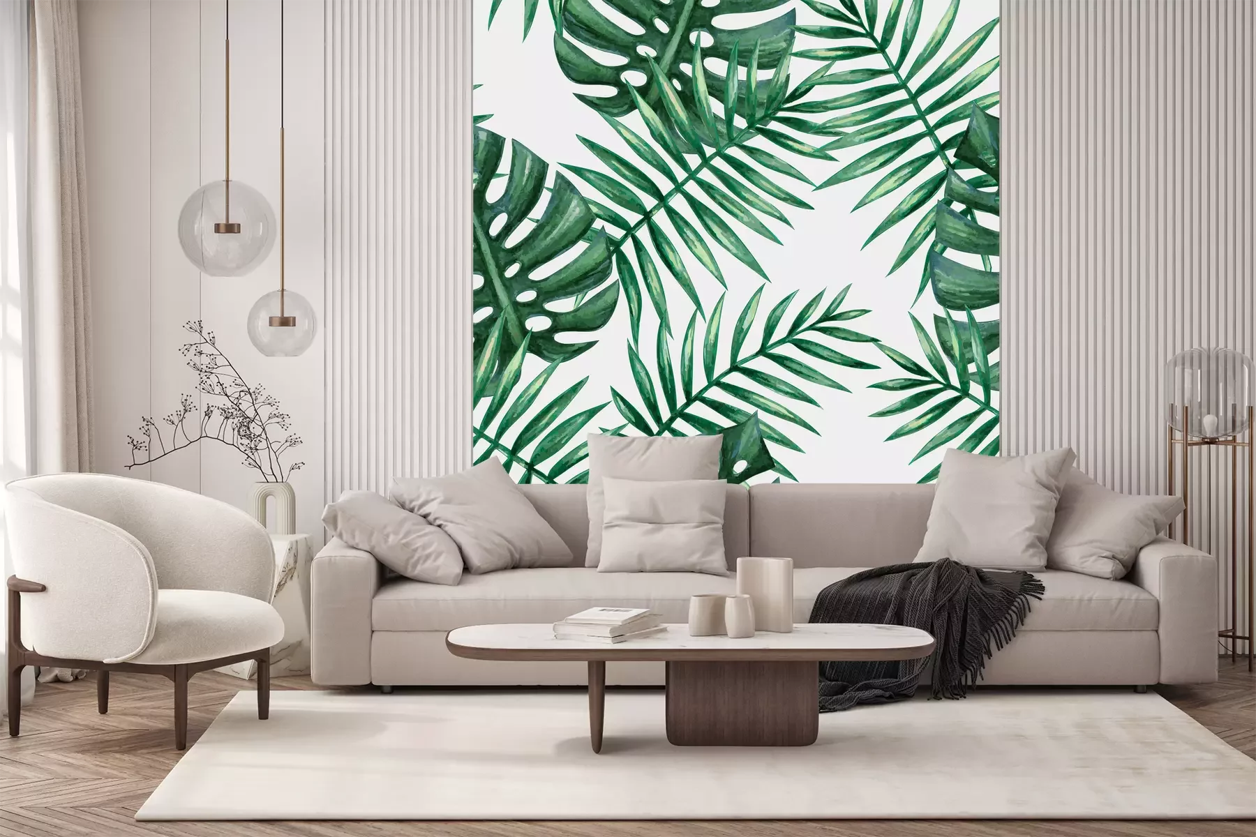 Het fotobehang wordt geleverd in banen. De afmetingen en het aantal banen waaruit het volledige fotobehang bestaat, zijn afhankelijk van het gekozen materiaal. Wanneer het formaat de maximale materiaalbreedte overschrijdt, bestaat de print uit meerdere gelijkmatige banen.