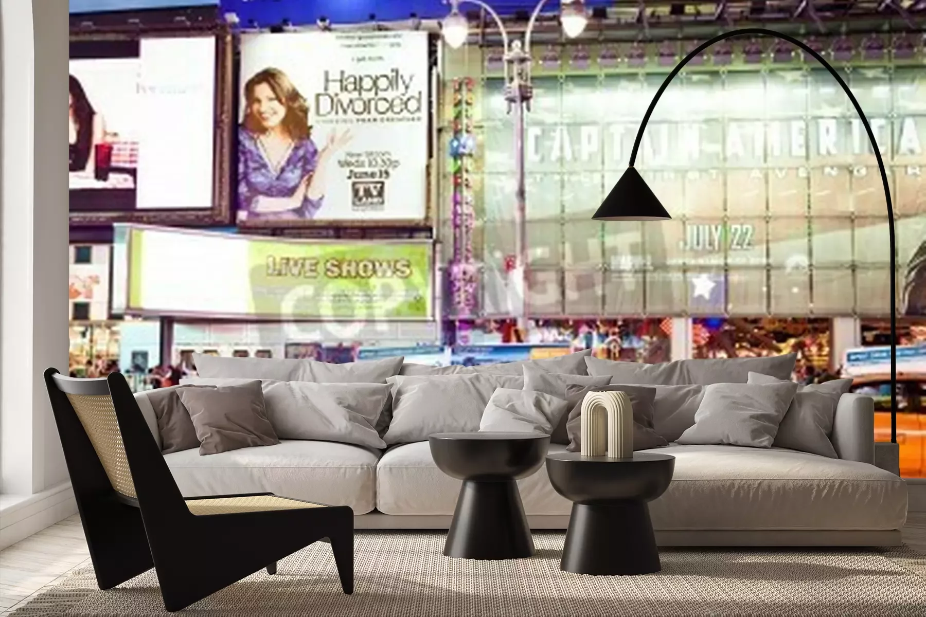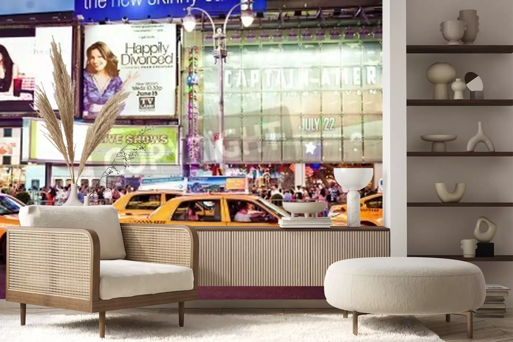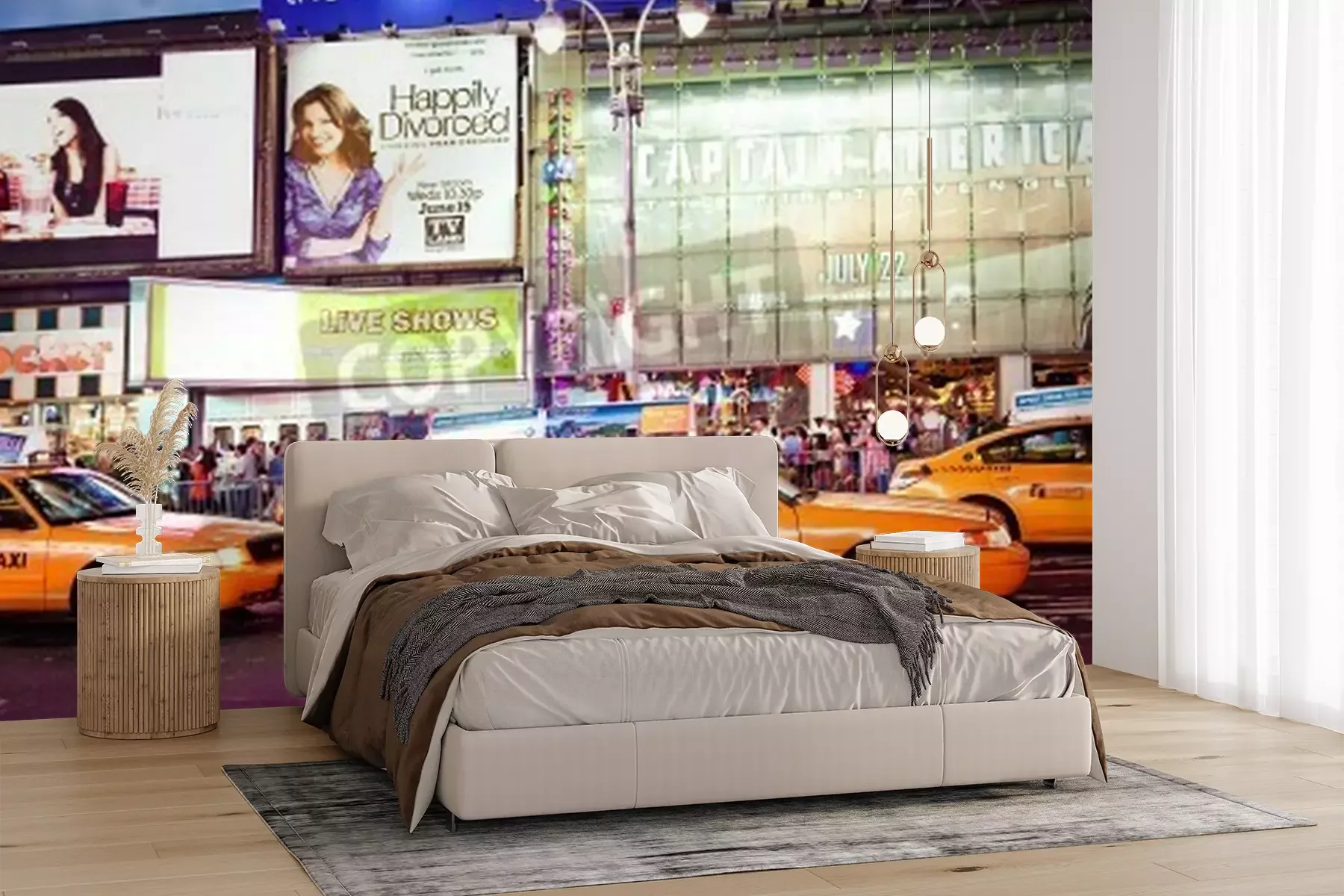 Fotobehang NEW YORK CITY - 1 juli: Taxi's rijden throughTimes plein met Theaters Broadway en geanimeerd LED-borden. Times Square is een symbool van New York City. 1 juli 2011 in Manhattan, New York City.