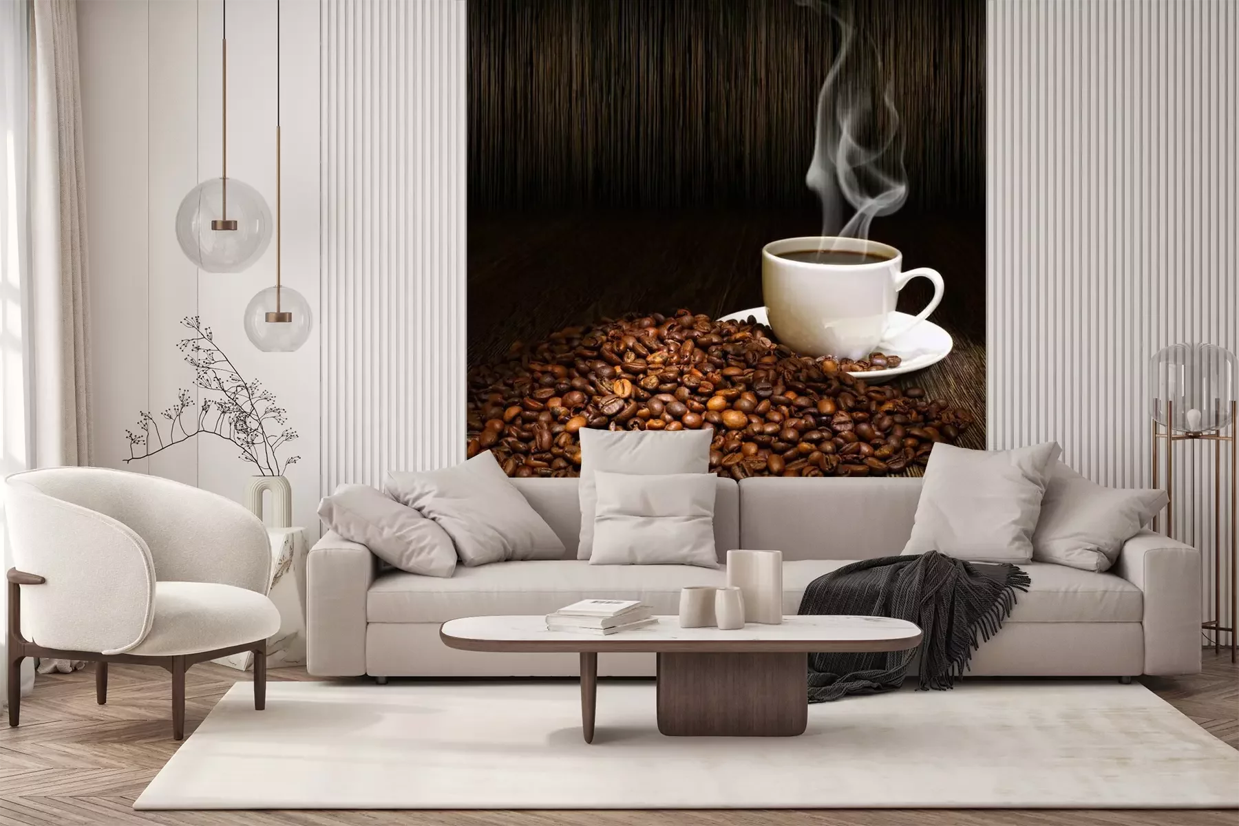 Het materiaal Premium+ is een gestructureerd vinyl op vlies met een gewicht van 255 g/m², dat kleine oneffenheden in de muur effectief camoufleert. De subtiele structuur van fijn zand geeft het oppervlak een exclusieve uitstraling, terwijl de halfmatte afwerking de diepte van de kleuren benadrukt. Het materiaal is dampdoorlatend, waardoor het ook in de keuken en badkamer kan worden gebruikt. De maximale breedte van één baan bedraagt 100 cm – bij grotere afmetingen wordt het fotobehang in meerdere gelijke banen verdeeld. De lijm wordt direct op de muur aangebracht en het behang wordt rand-aan-rand geplakt, wat zorgt voor een esthetisch resultaat zonder zichtbare naden. Het oppervlak kan gemakkelijk worden schoongemaakt door het voorzichtig af te nemen met een vochtige doek.