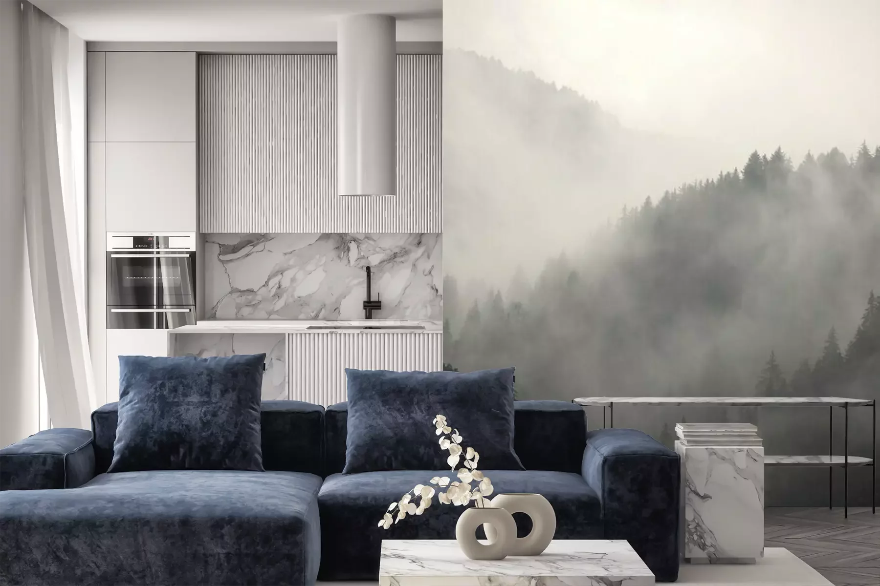 Het materiaal Premium+ is een gestructureerd vinyl op vlies met een gewicht van 255 g/m², dat kleine oneffenheden in de muur effectief camoufleert. De subtiele structuur van fijn zand geeft het oppervlak een exclusieve uitstraling, terwijl de halfmatte afwerking de diepte van de kleuren benadrukt. Het materiaal is dampdoorlatend, waardoor het ook in de keuken en badkamer kan worden gebruikt. De maximale breedte van één baan bedraagt 100 cm – bij grotere afmetingen wordt het fotobehang in meerdere gelijke banen verdeeld. De lijm wordt direct op de muur aangebracht en het behang wordt rand-aan-rand geplakt, wat zorgt voor een esthetisch resultaat zonder zichtbare naden. Het oppervlak kan gemakkelijk worden schoongemaakt door het voorzichtig af te nemen met een vochtige doek.