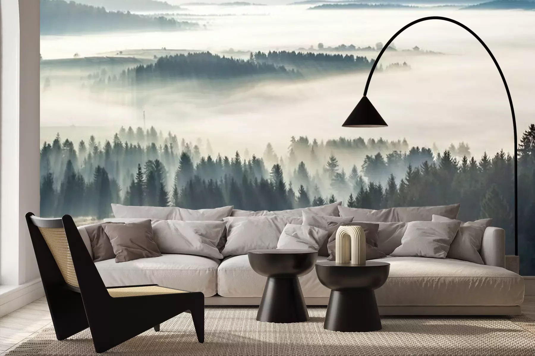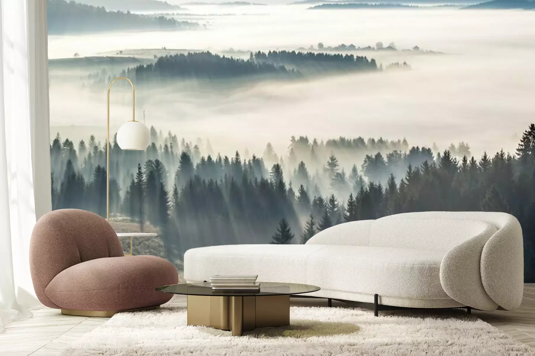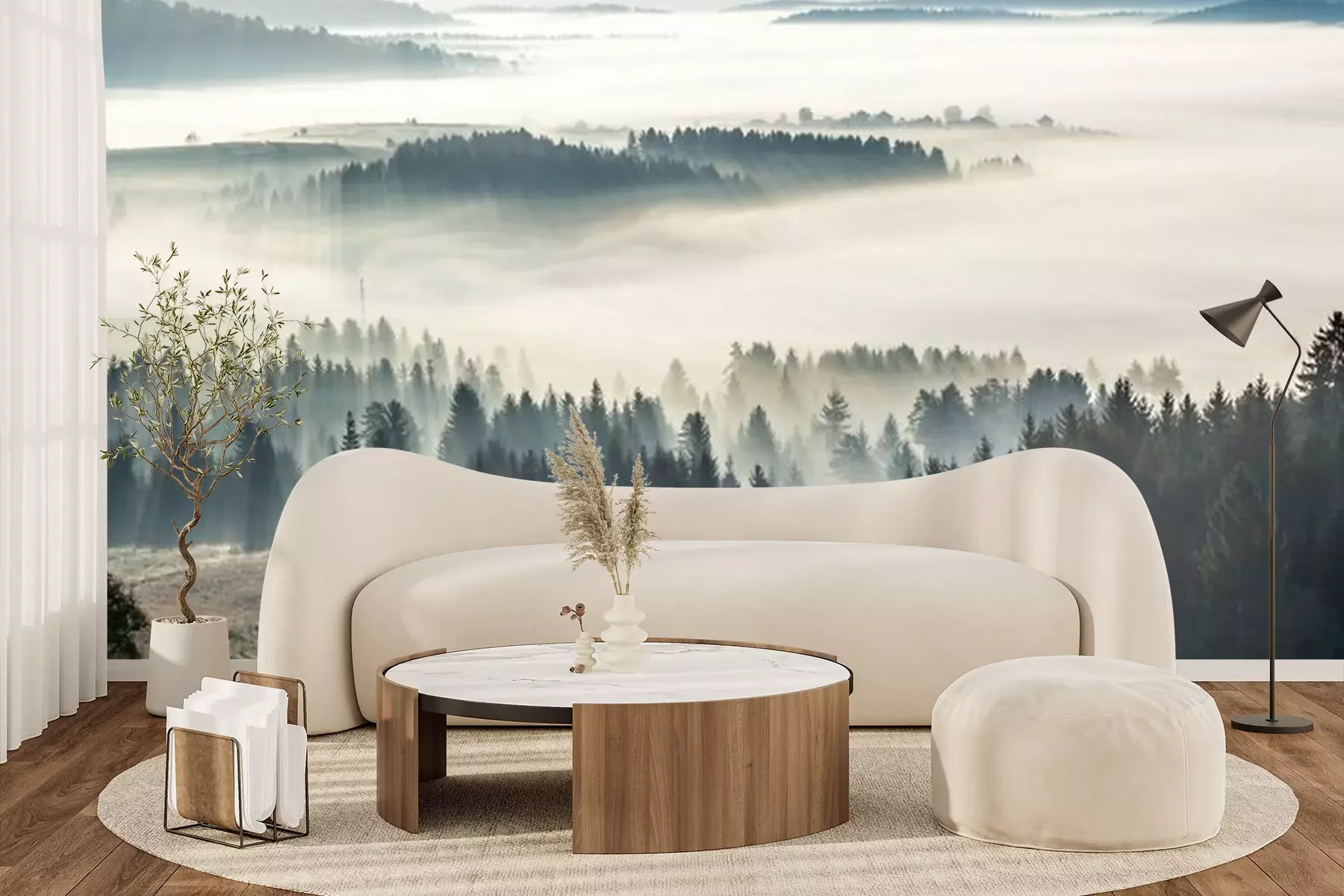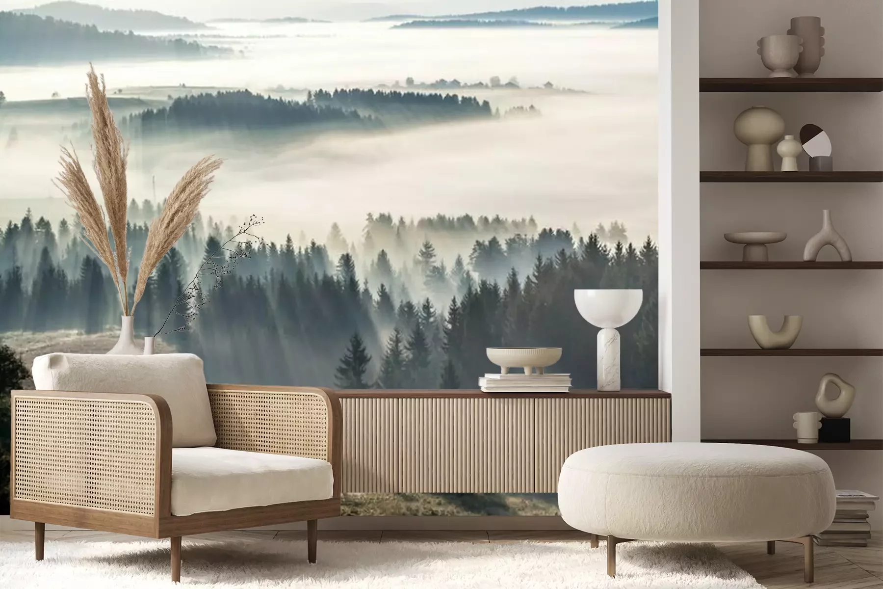 Fotobehang Ochtendnevel en bos in de zon