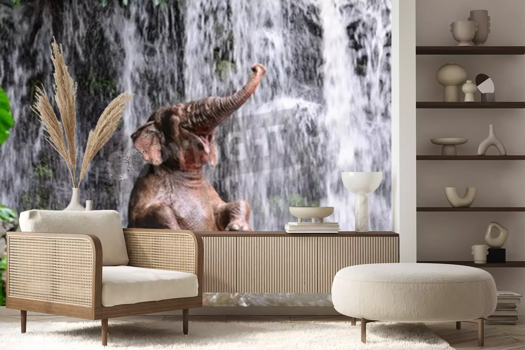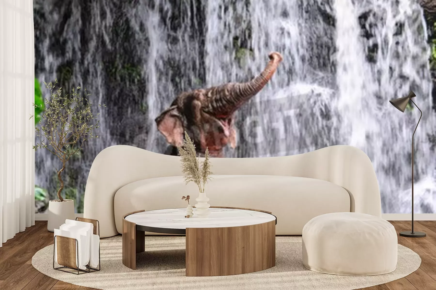 Fotobehang Olifant en een waterval in de jungle
