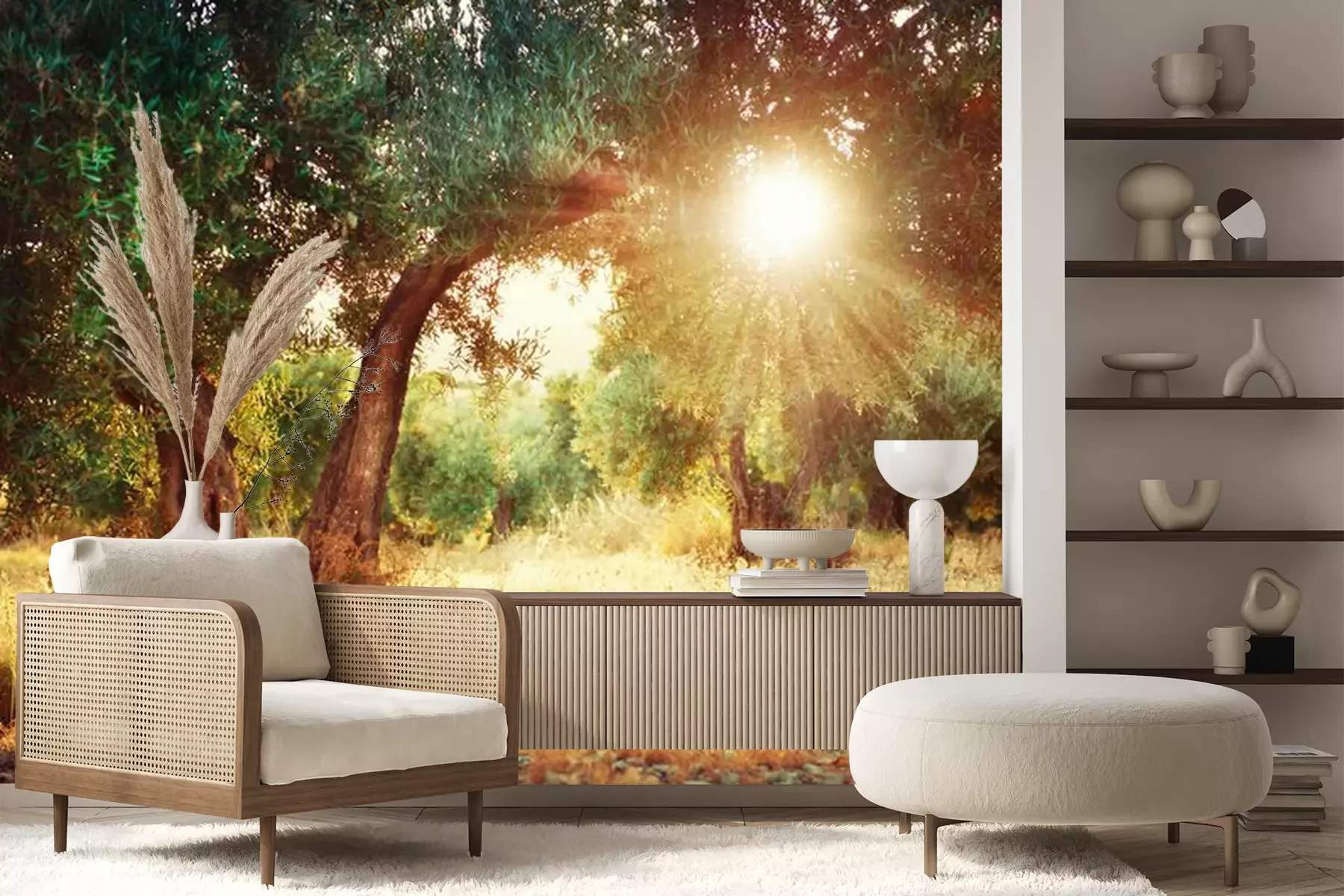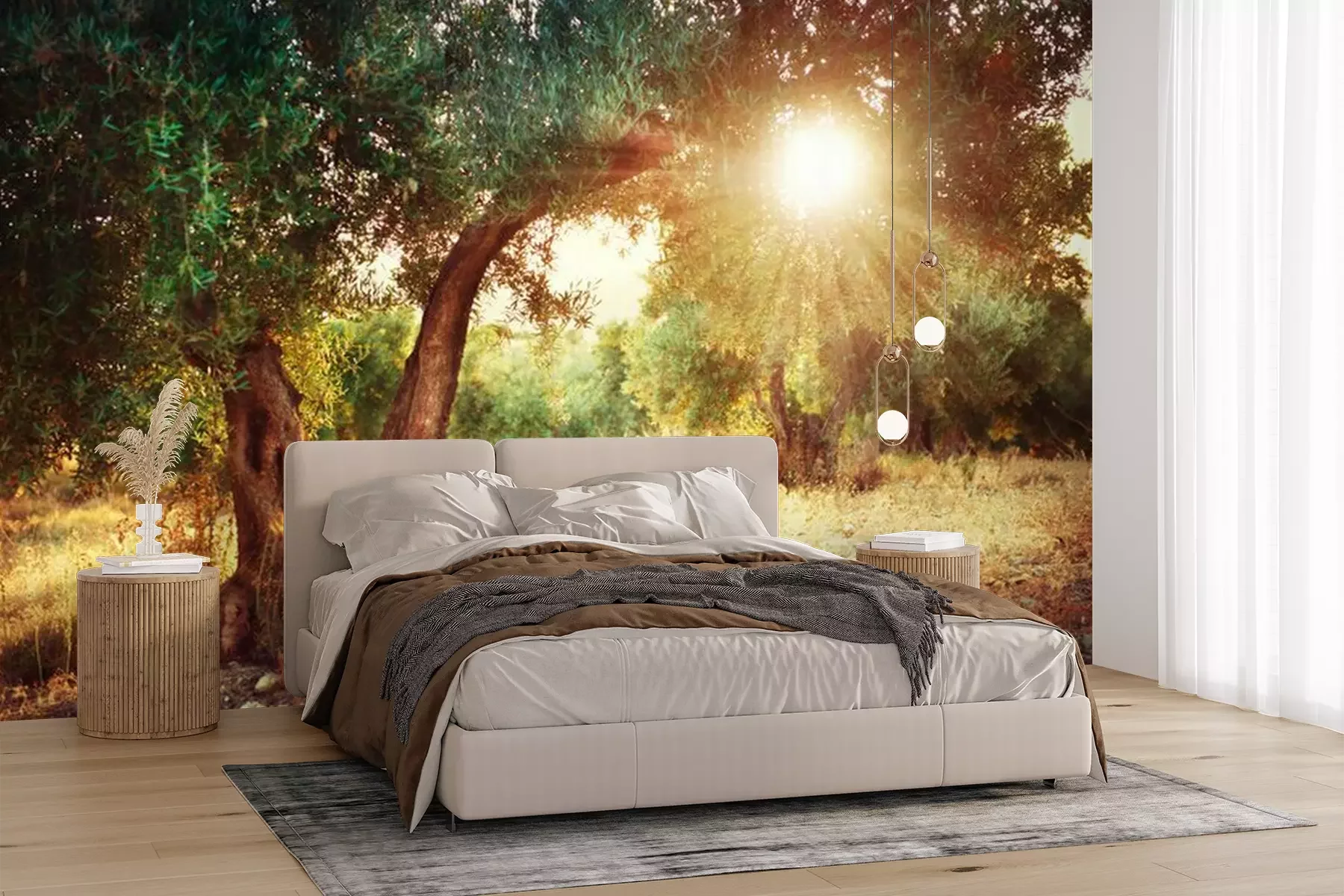 Het materiaal Premium+ is een gestructureerd vinyl op vlies met een gewicht van 255 g/m², dat kleine oneffenheden in de muur effectief camoufleert. De subtiele structuur van fijn zand geeft het oppervlak een exclusieve uitstraling, terwijl de halfmatte afwerking de diepte van de kleuren benadrukt. Het materiaal is dampdoorlatend, waardoor het ook in de keuken en badkamer kan worden gebruikt. De maximale breedte van één baan bedraagt 100 cm – bij grotere afmetingen wordt het fotobehang in meerdere gelijke banen verdeeld. De lijm wordt direct op de muur aangebracht en het behang wordt rand-aan-rand geplakt, wat zorgt voor een esthetisch resultaat zonder zichtbare naden. Het oppervlak kan gemakkelijk worden schoongemaakt door het voorzichtig af te nemen met een vochtige doek.