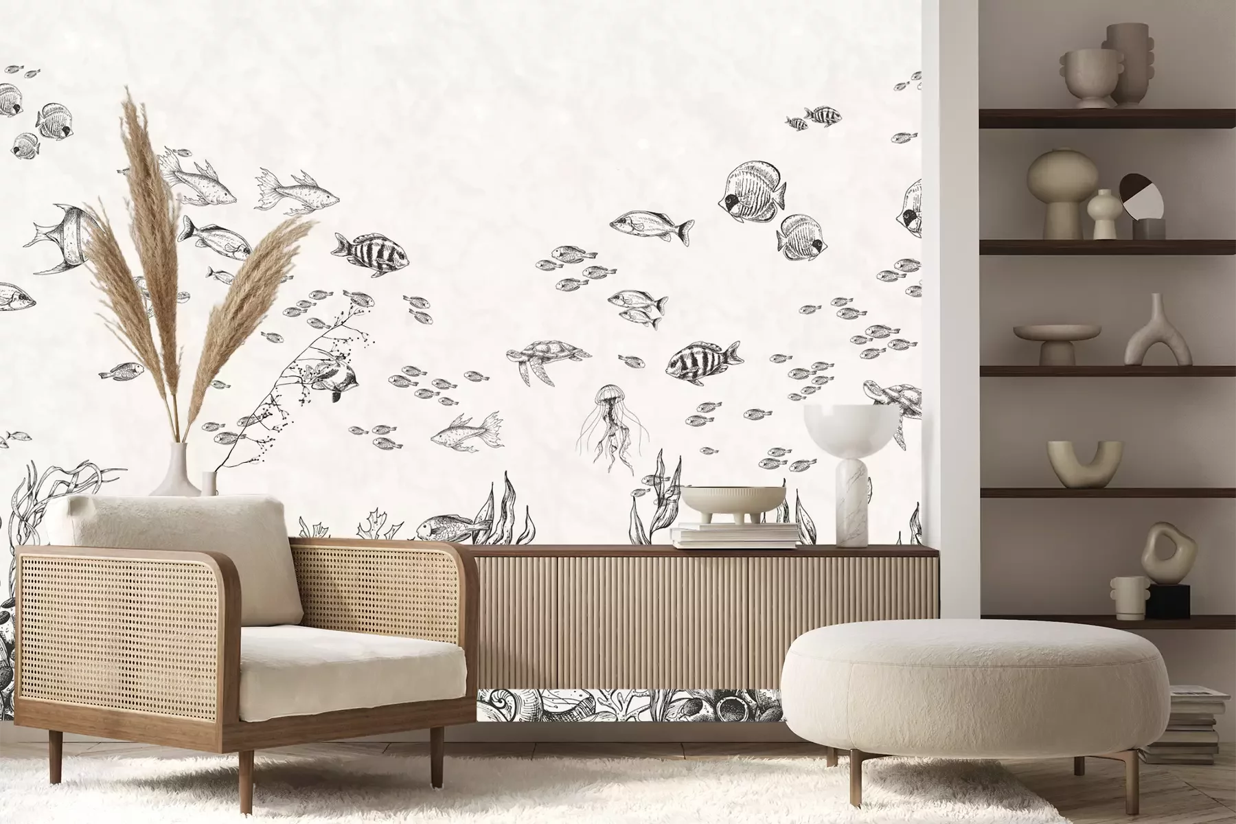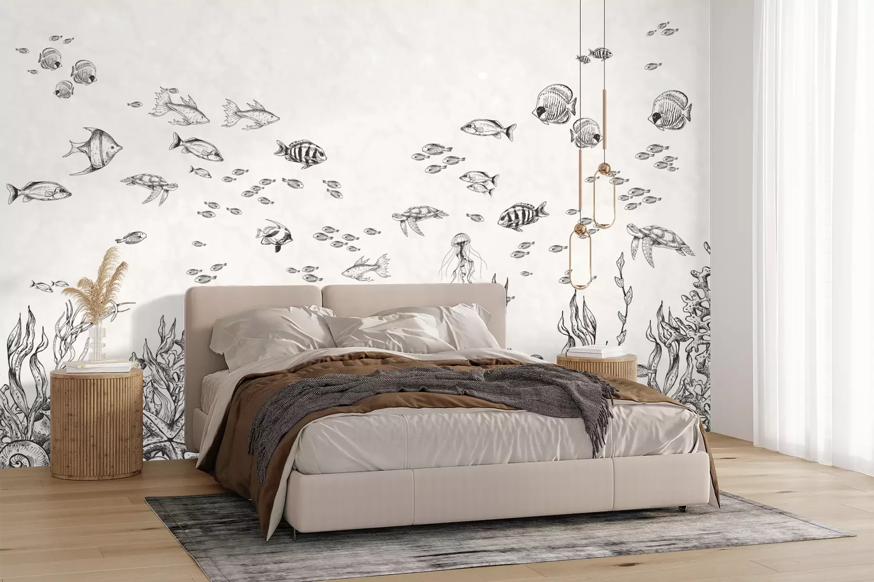 Het materiaal Premium+ is een gestructureerd vinyl op vlies met een gewicht van 255 g/m², dat kleine oneffenheden in de muur effectief camoufleert. De subtiele structuur van fijn zand geeft het oppervlak een exclusieve uitstraling, terwijl de halfmatte afwerking de diepte van de kleuren benadrukt. Het materiaal is dampdoorlatend, waardoor het ook in de keuken en badkamer kan worden gebruikt. De maximale breedte van één baan bedraagt 100 cm – bij grotere afmetingen wordt het fotobehang in meerdere gelijke banen verdeeld. De lijm wordt direct op de muur aangebracht en het behang wordt rand-aan-rand geplakt, wat zorgt voor een esthetisch resultaat zonder zichtbare naden. Het oppervlak kan gemakkelijk worden schoongemaakt door het voorzichtig af te nemen met een vochtige doek.